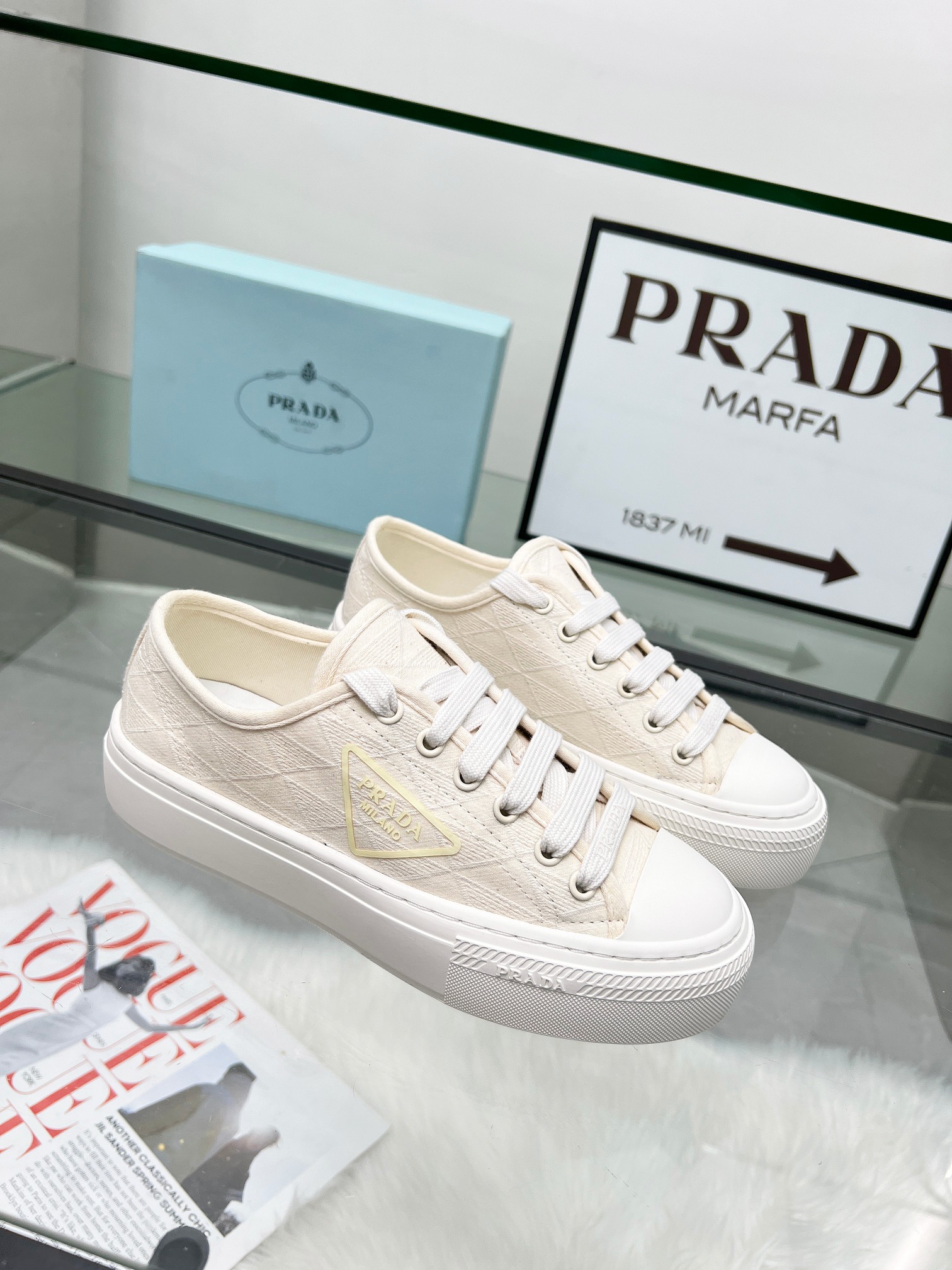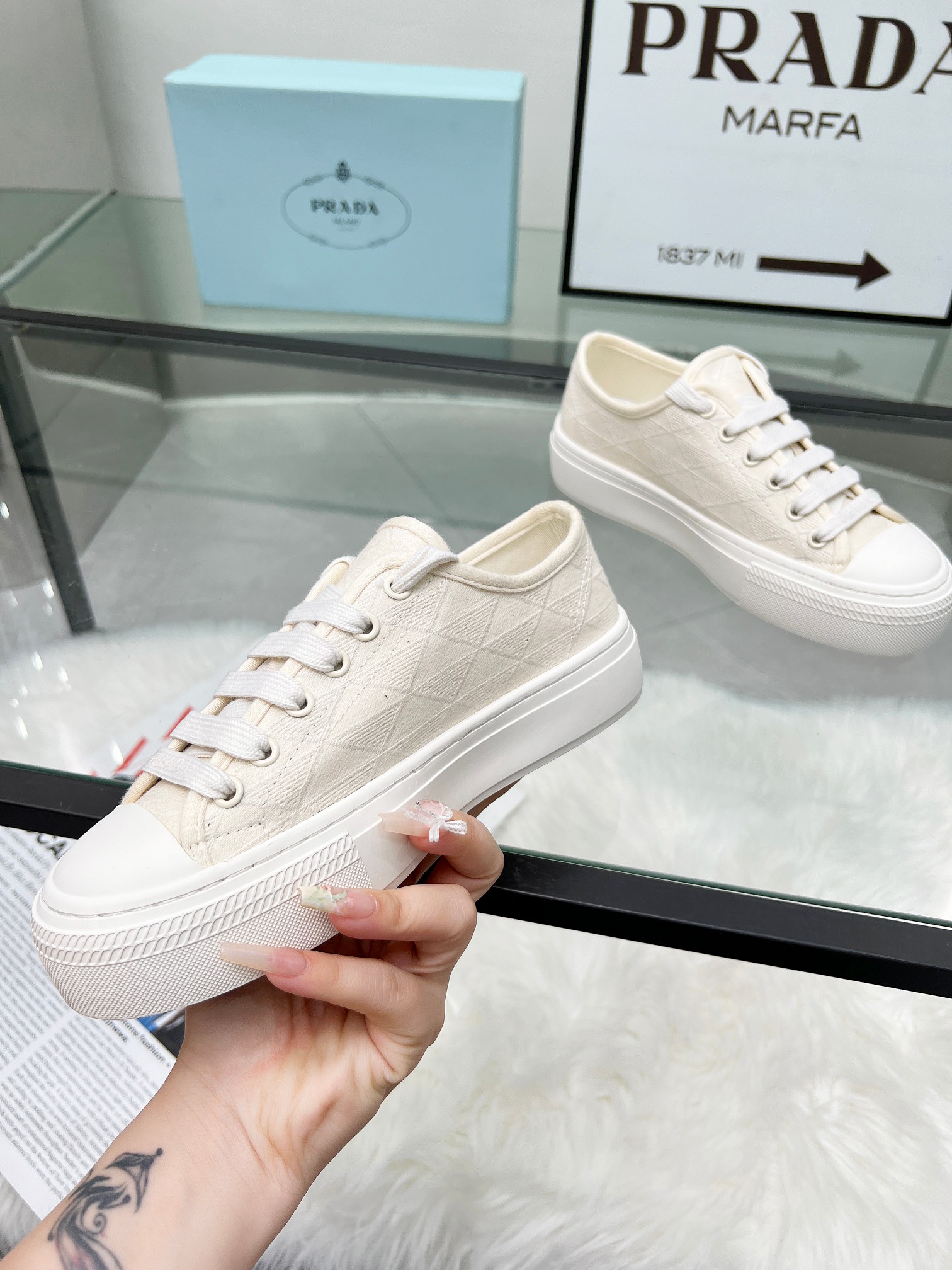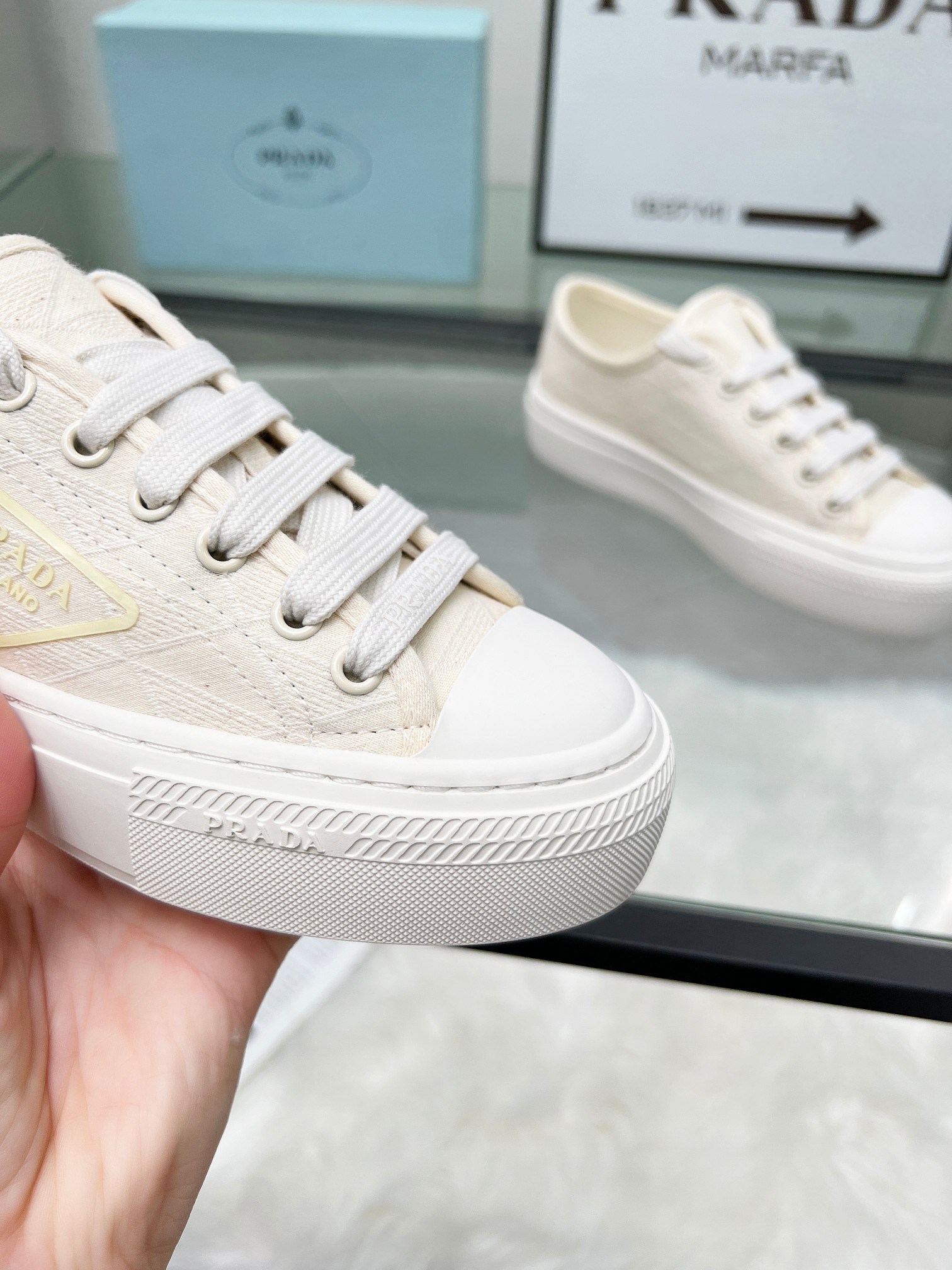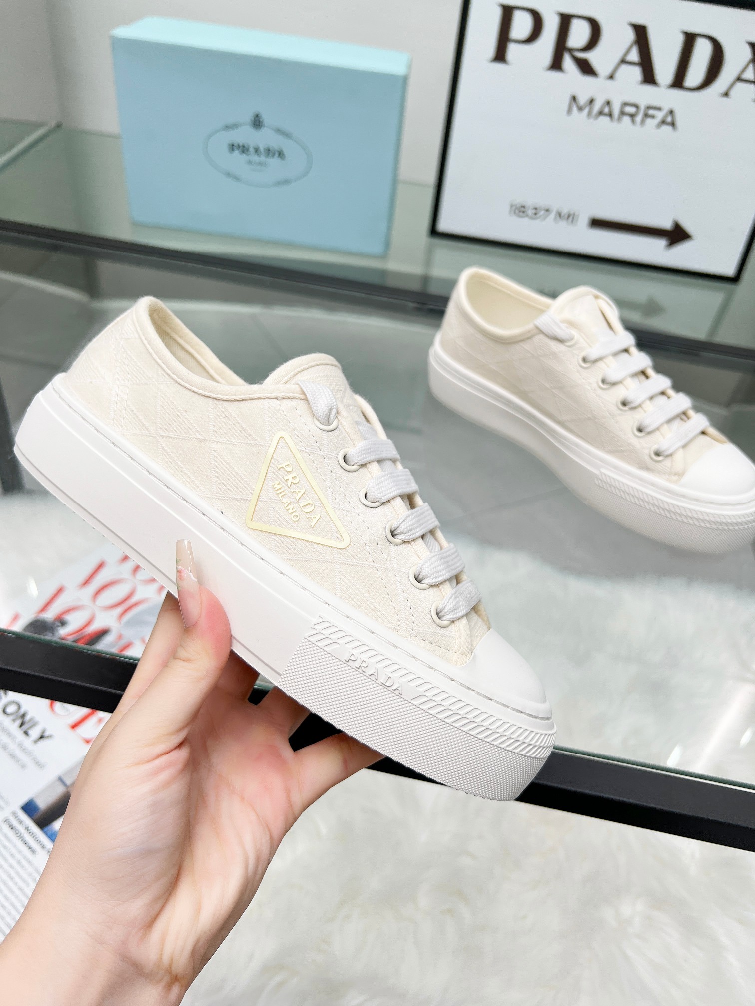 这款鞋子是AAAAA 1:1 质量 (非常棒). 使用了和原版一模一样的材料. 商标部分也保持了和普拉达/Prada一样. 图片拍摄是实物鞋子拍摄, 您所收到的实物保证和我们图片一模一样.