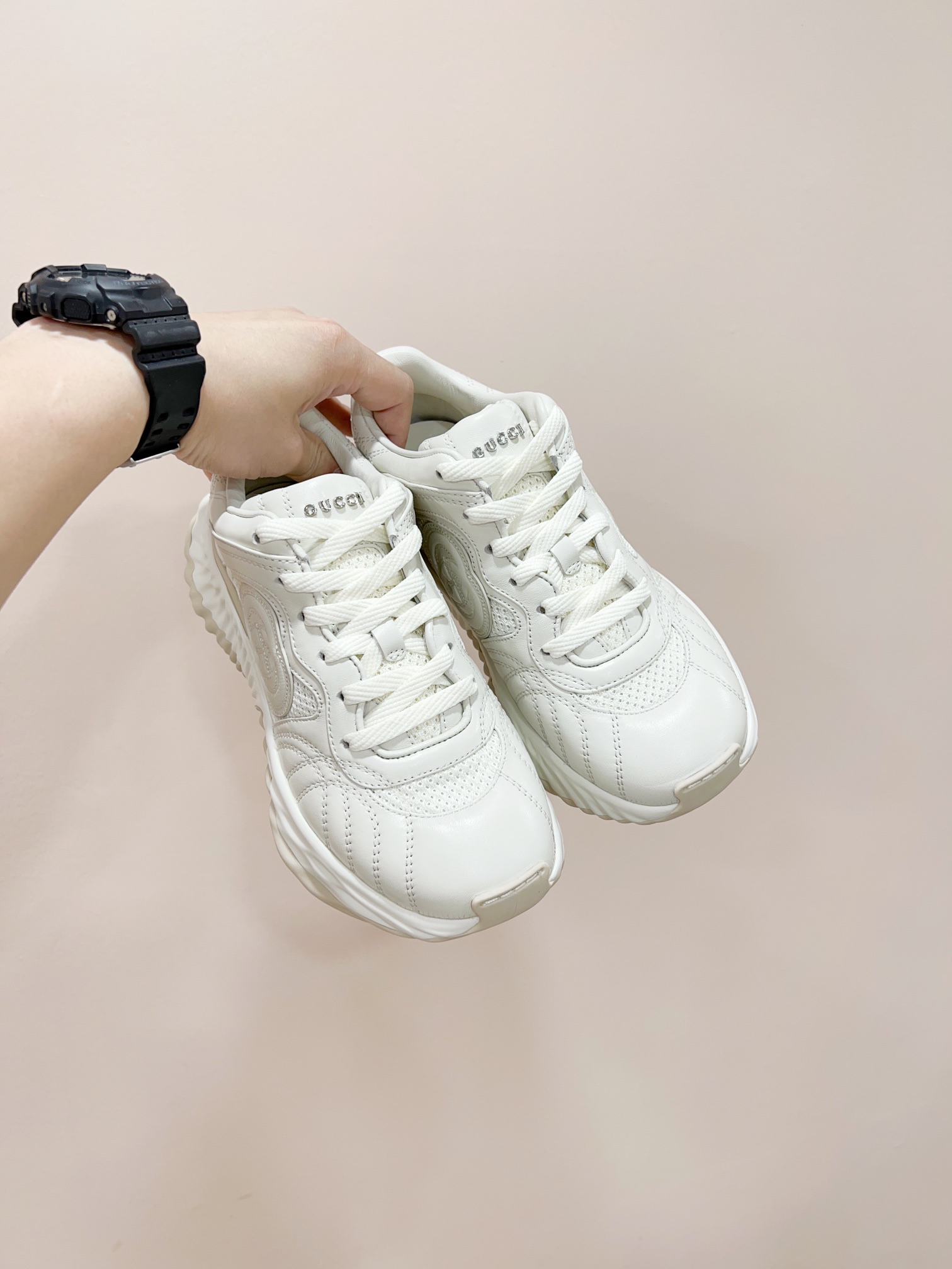 这款鞋子是AAAAA 1:1 质量 (非常棒). 使用了和原版一模一样的材料. 商标部分也保持了和古奇/Gucci一样. 图片拍摄是实物鞋子拍摄, 您所收到的实物保证和我们图片一模一样.