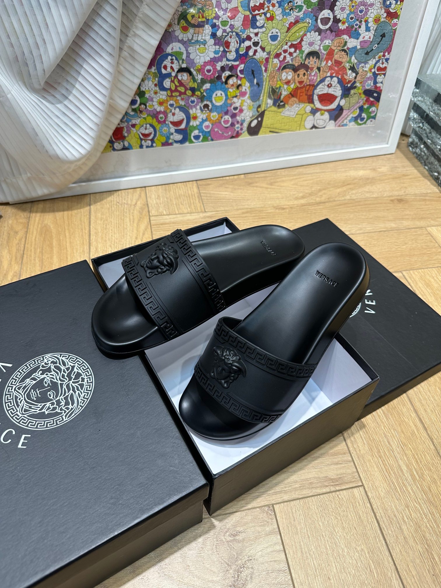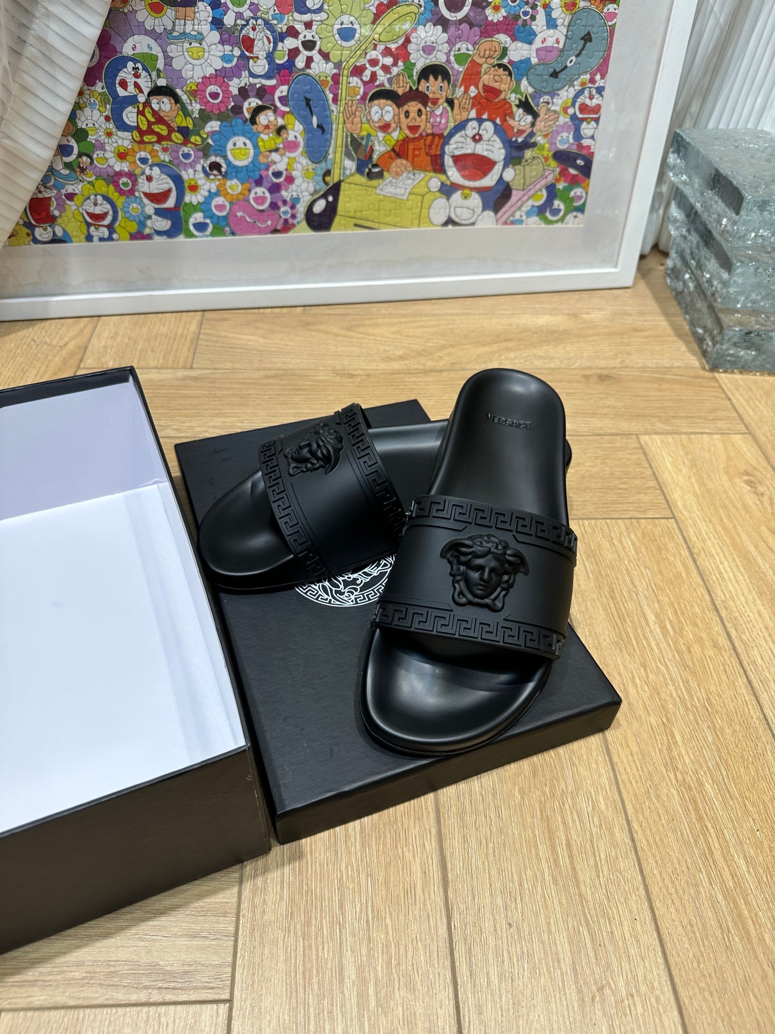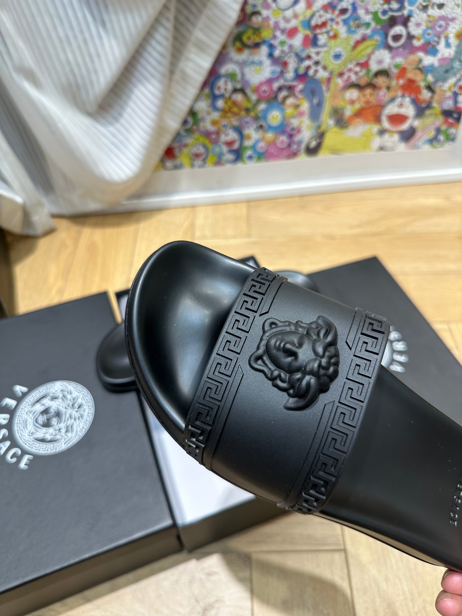 这款鞋子是AAAAA 1:1 质量 (非常棒). 使用了和原版一模一样的材料. 商标部分也保持了和范思哲/Versace一样. 图片拍摄是实物鞋子拍摄, 您所收到的实物保证和我们图片一模一样.