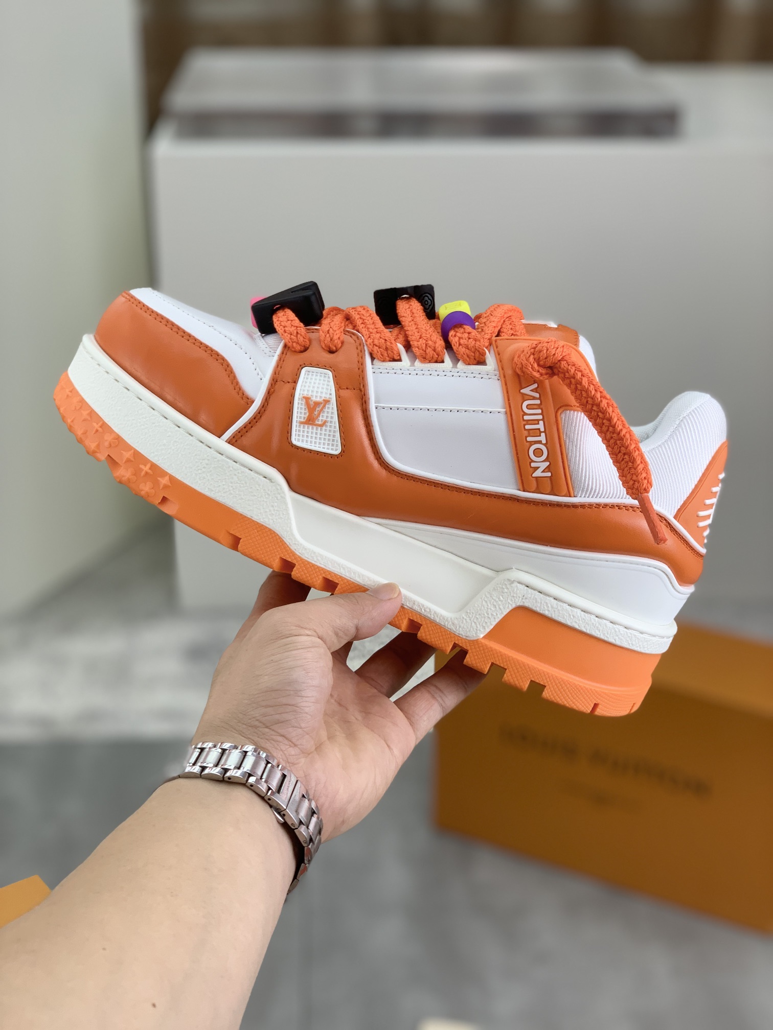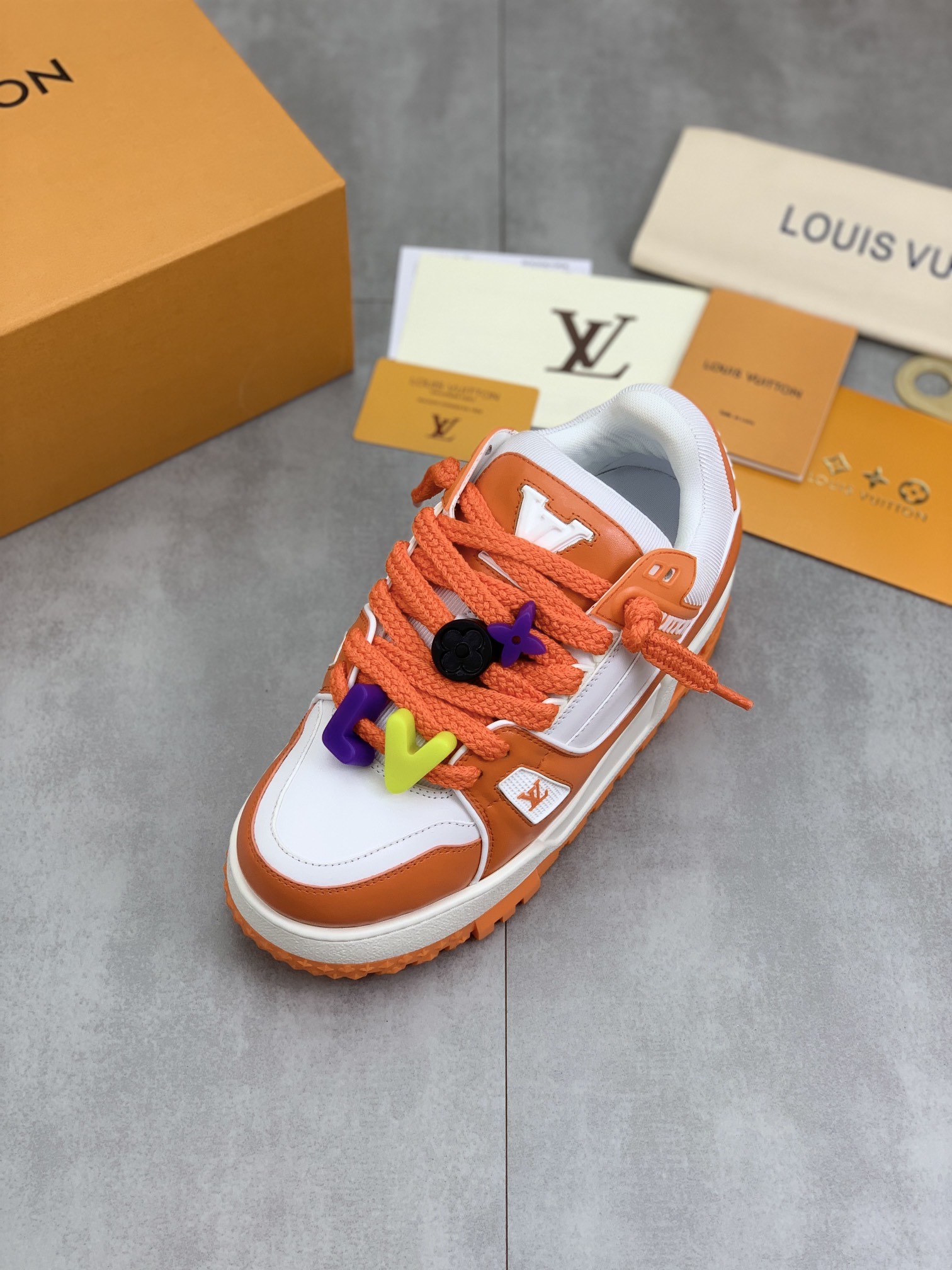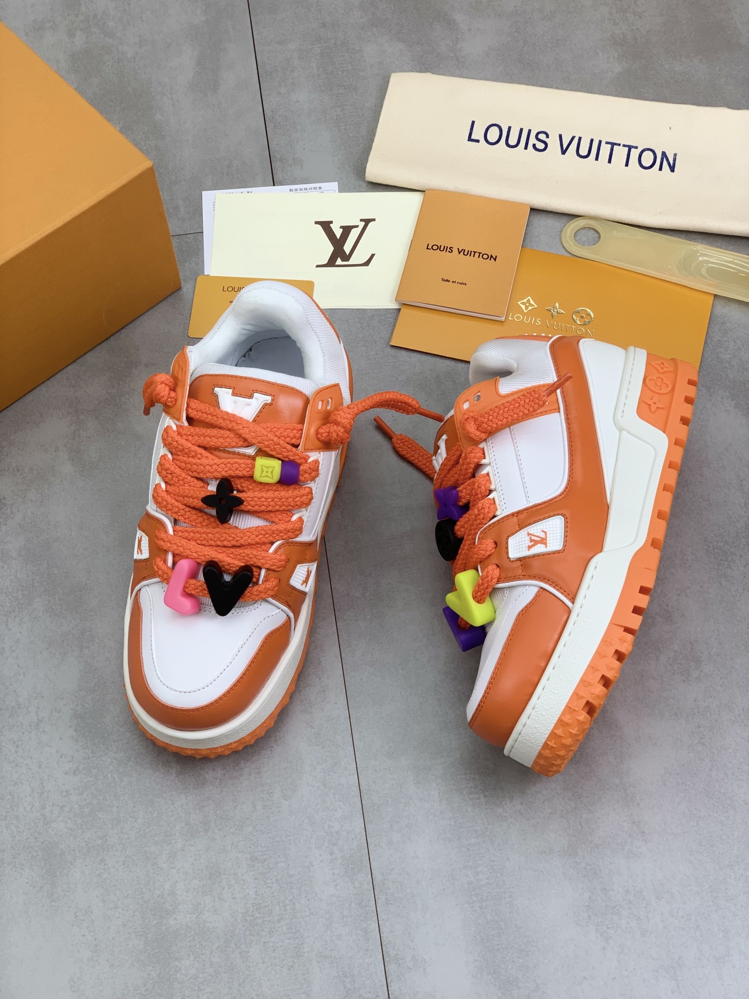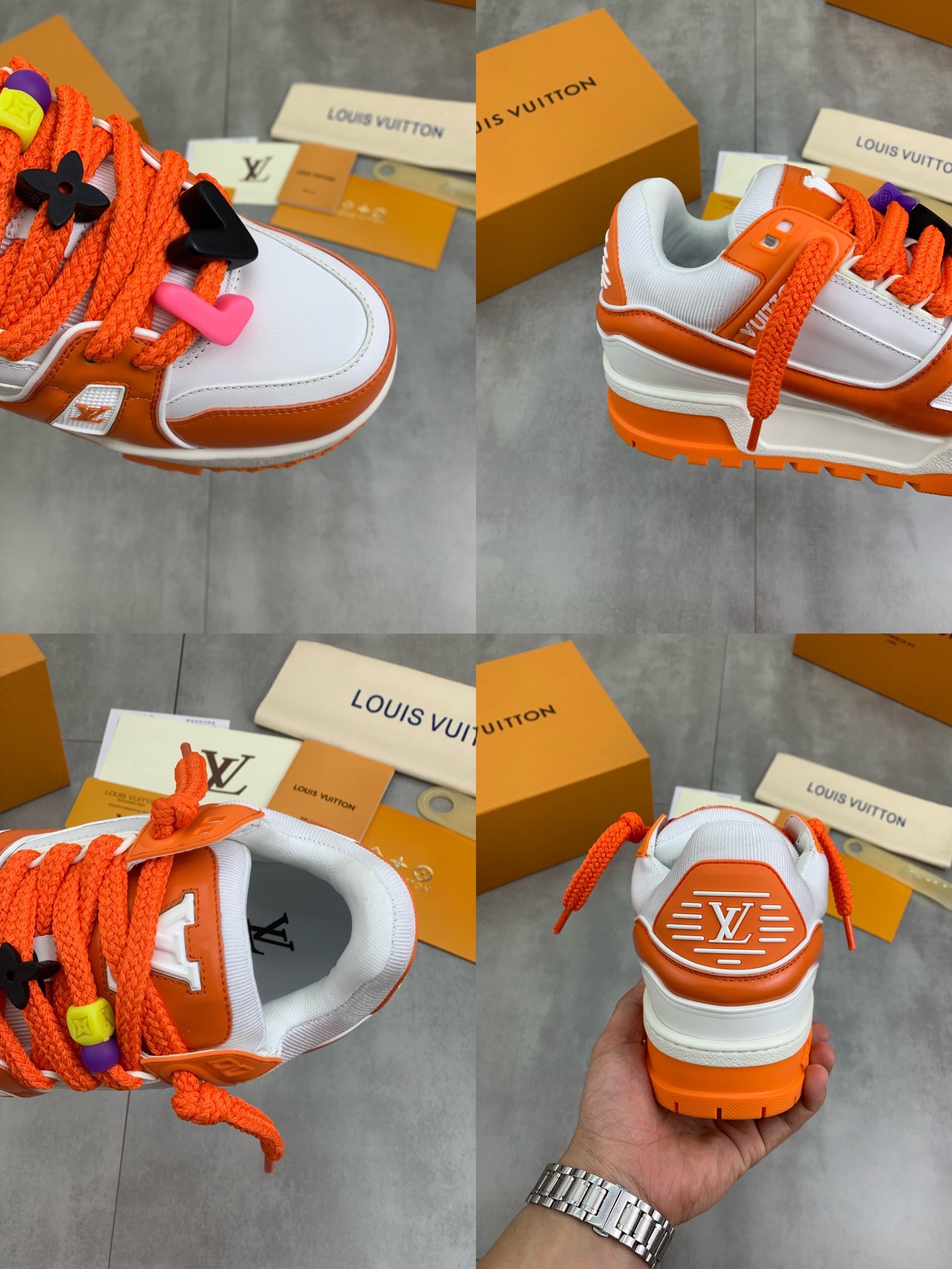 这款鞋子是AAAAA 1:1 质量 (非常棒). 使用了和原版一模一样的材料. 商标部分也保持了和路易威登/Louis Vuitton一样. 图片拍摄是实物鞋子拍摄, 您所收到的实物保证和我们图片一模一样.