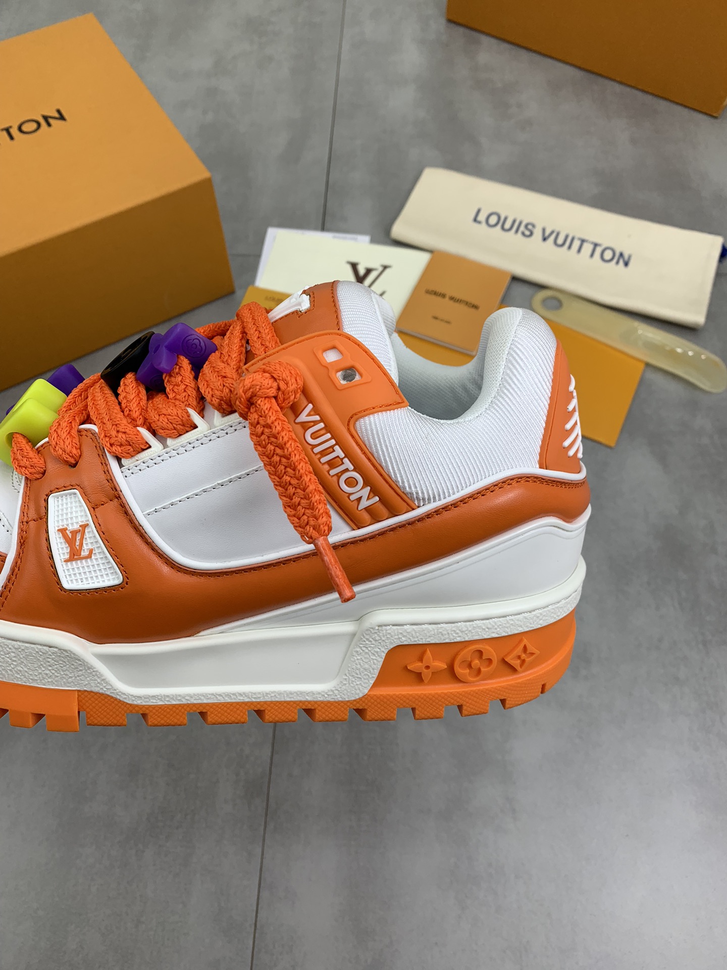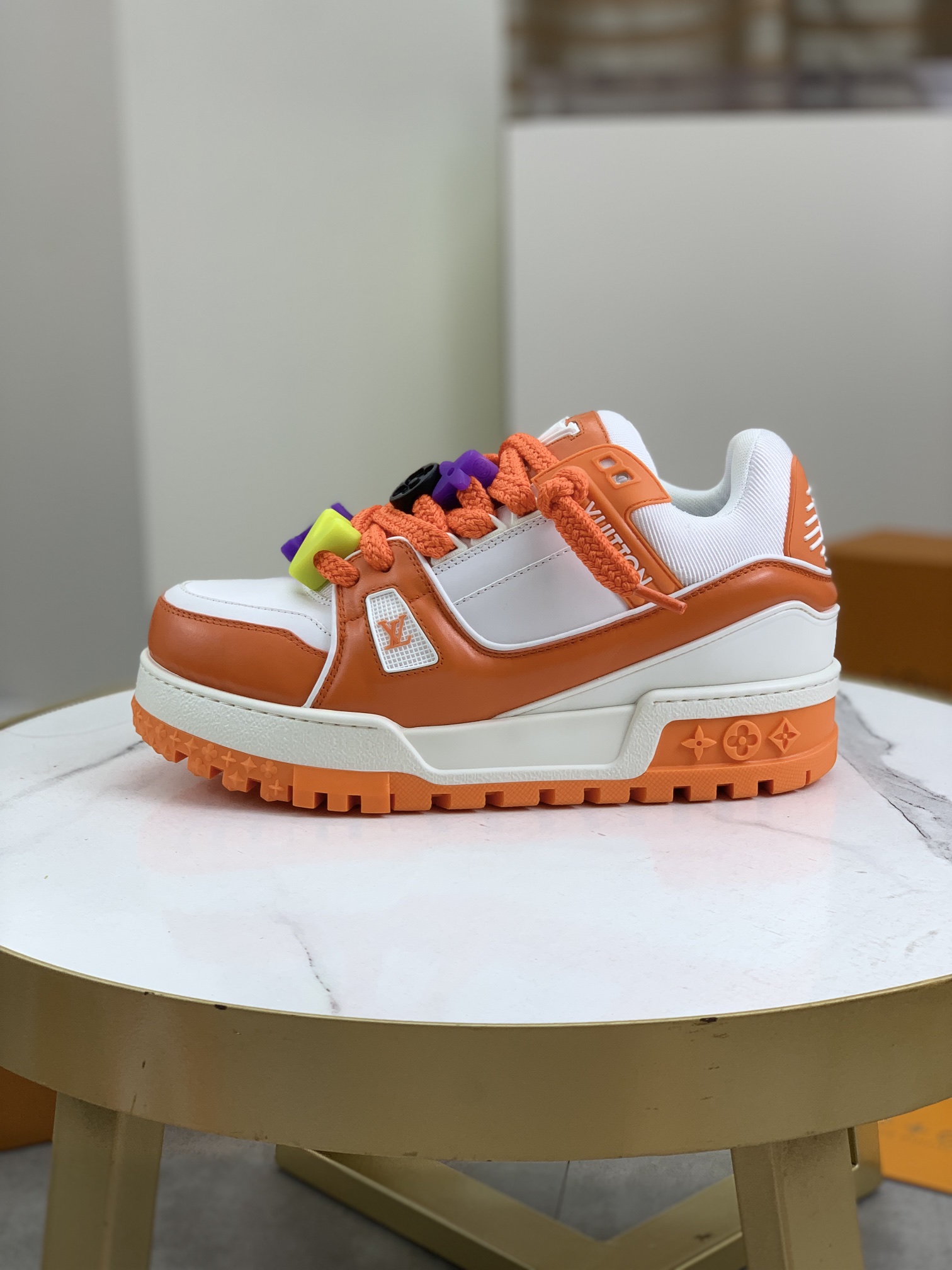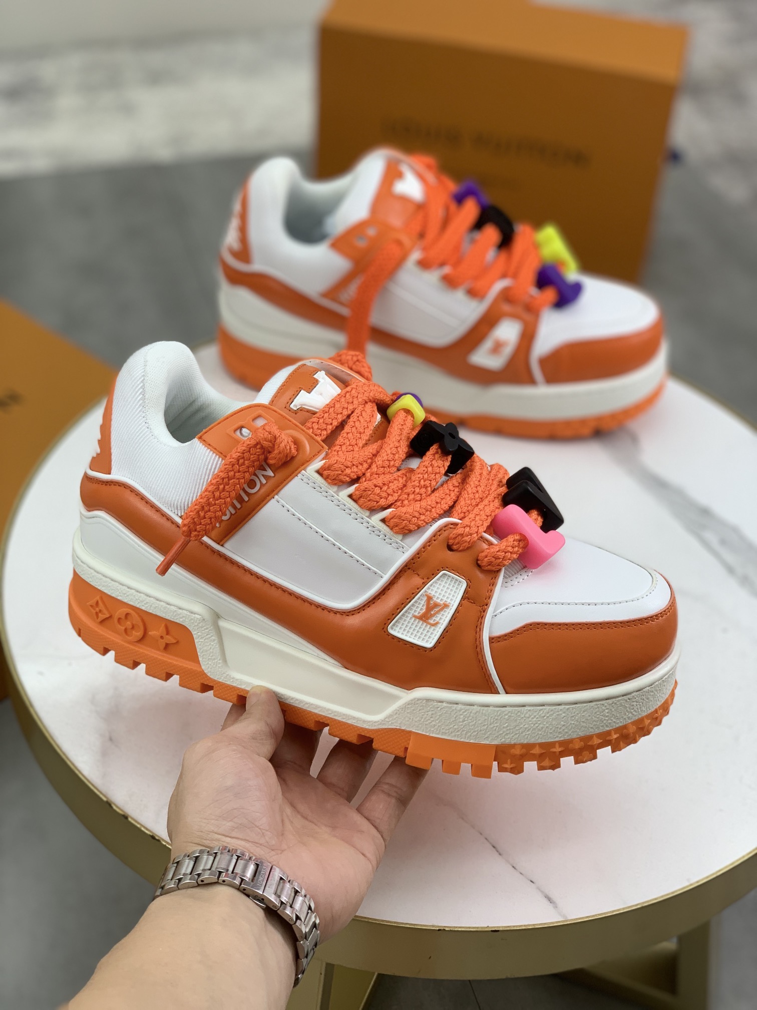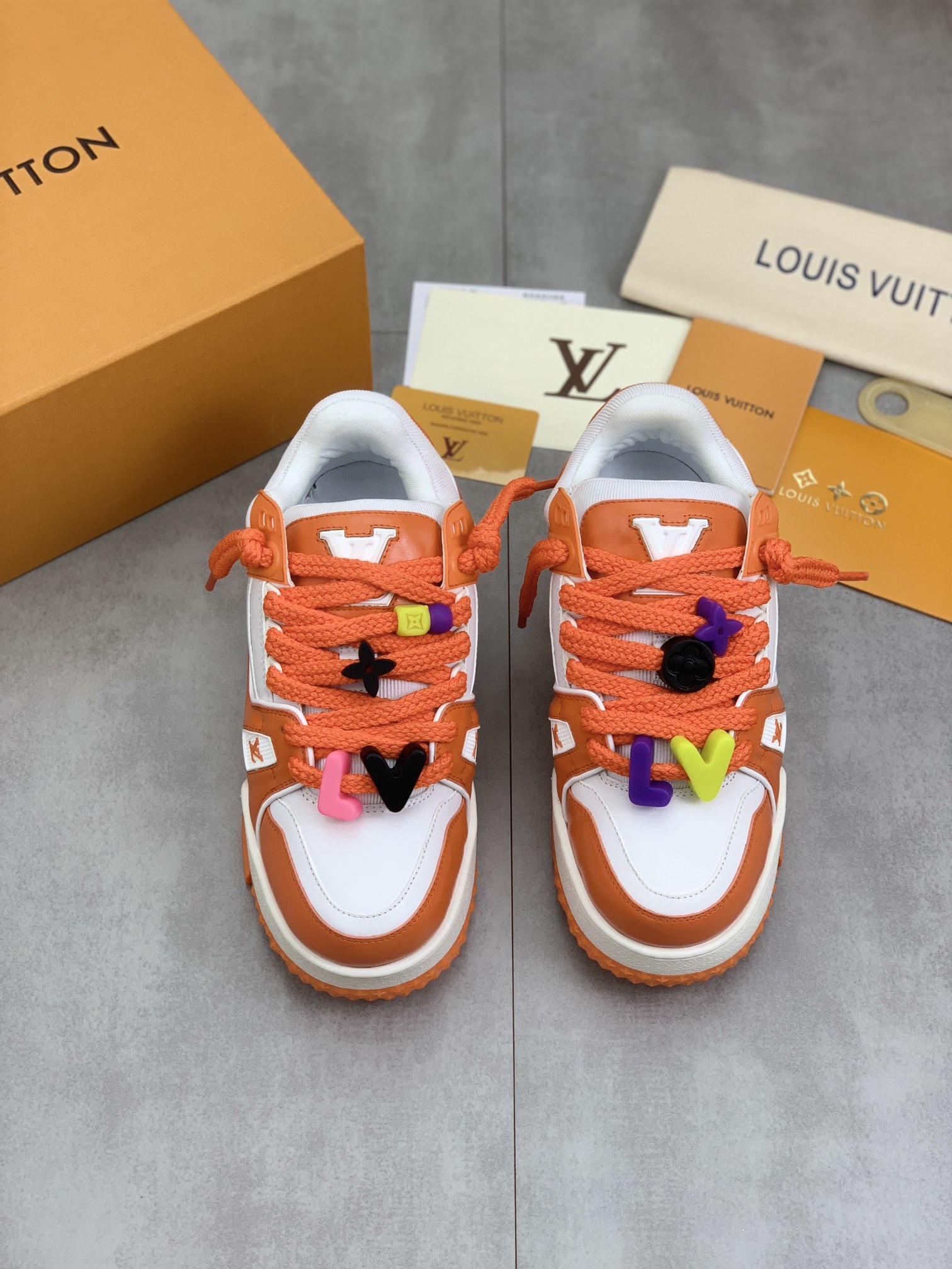 这款鞋子是AAAAA 1:1 质量 (非常棒). 使用了和原版一模一样的材料. 商标部分也保持了和路易威登/Louis Vuitton一样. 图片拍摄是实物鞋子拍摄, 您所收到的实物保证和我们图片一模一样.