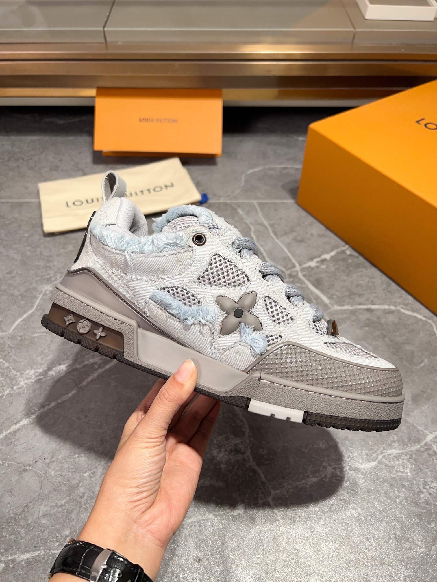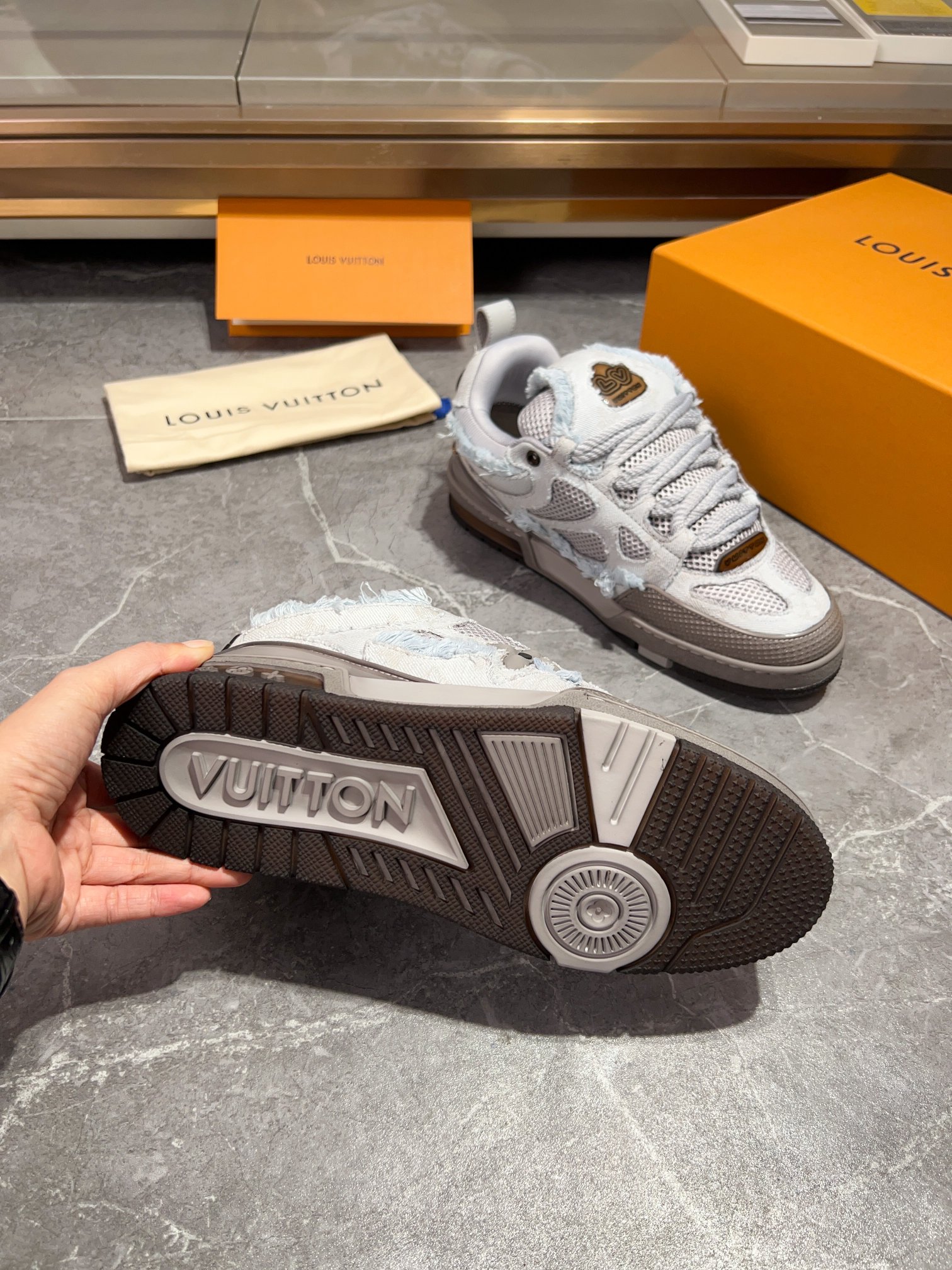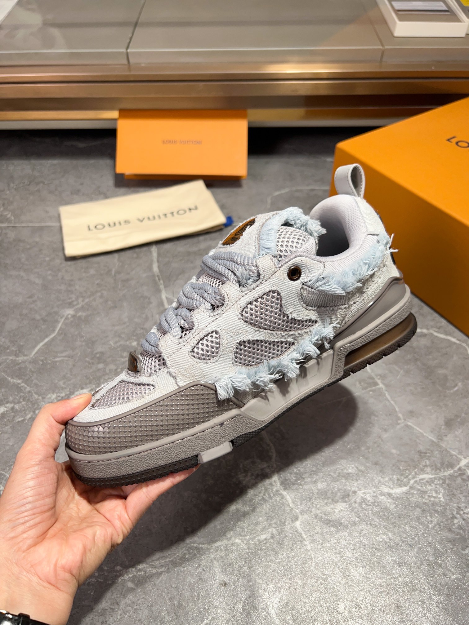 这款鞋子是AAAAA 1:1 质量 (非常棒). 使用了和原版一模一样的材料. 商标部分也保持了和路易威登/Louis Vuitton一样. 图片拍摄是实物鞋子拍摄, 您所收到的实物保证和我们图片一模一样.