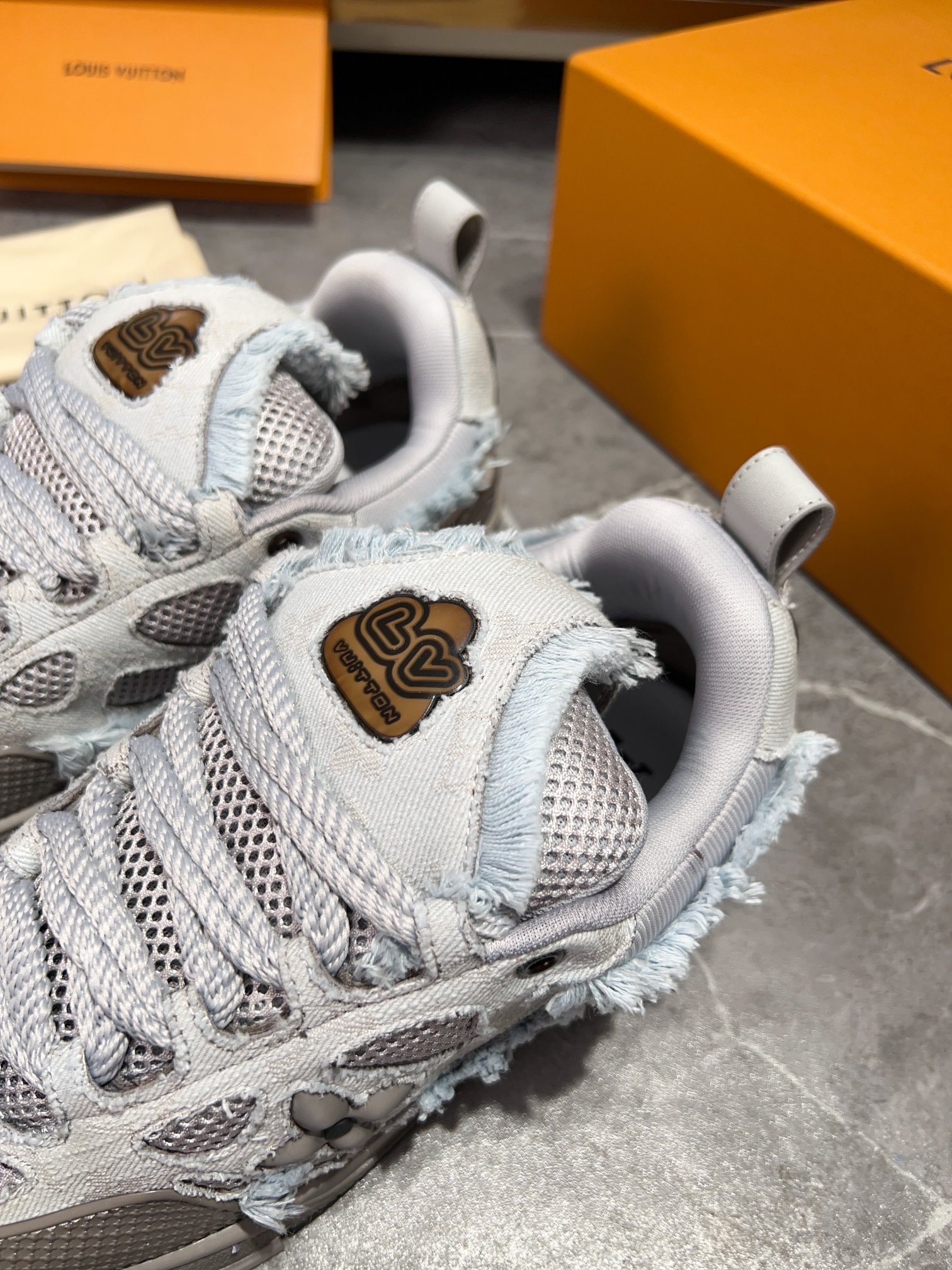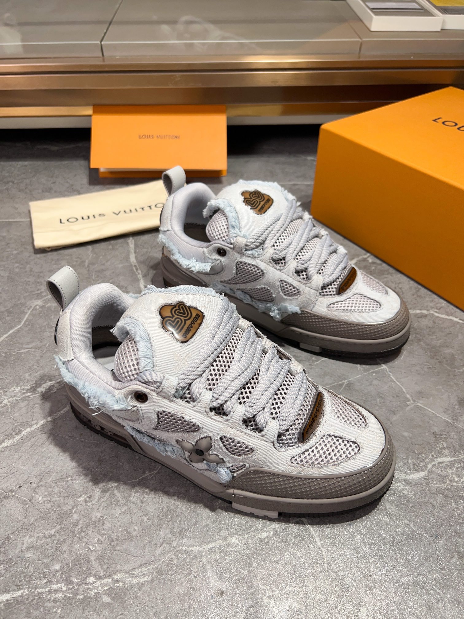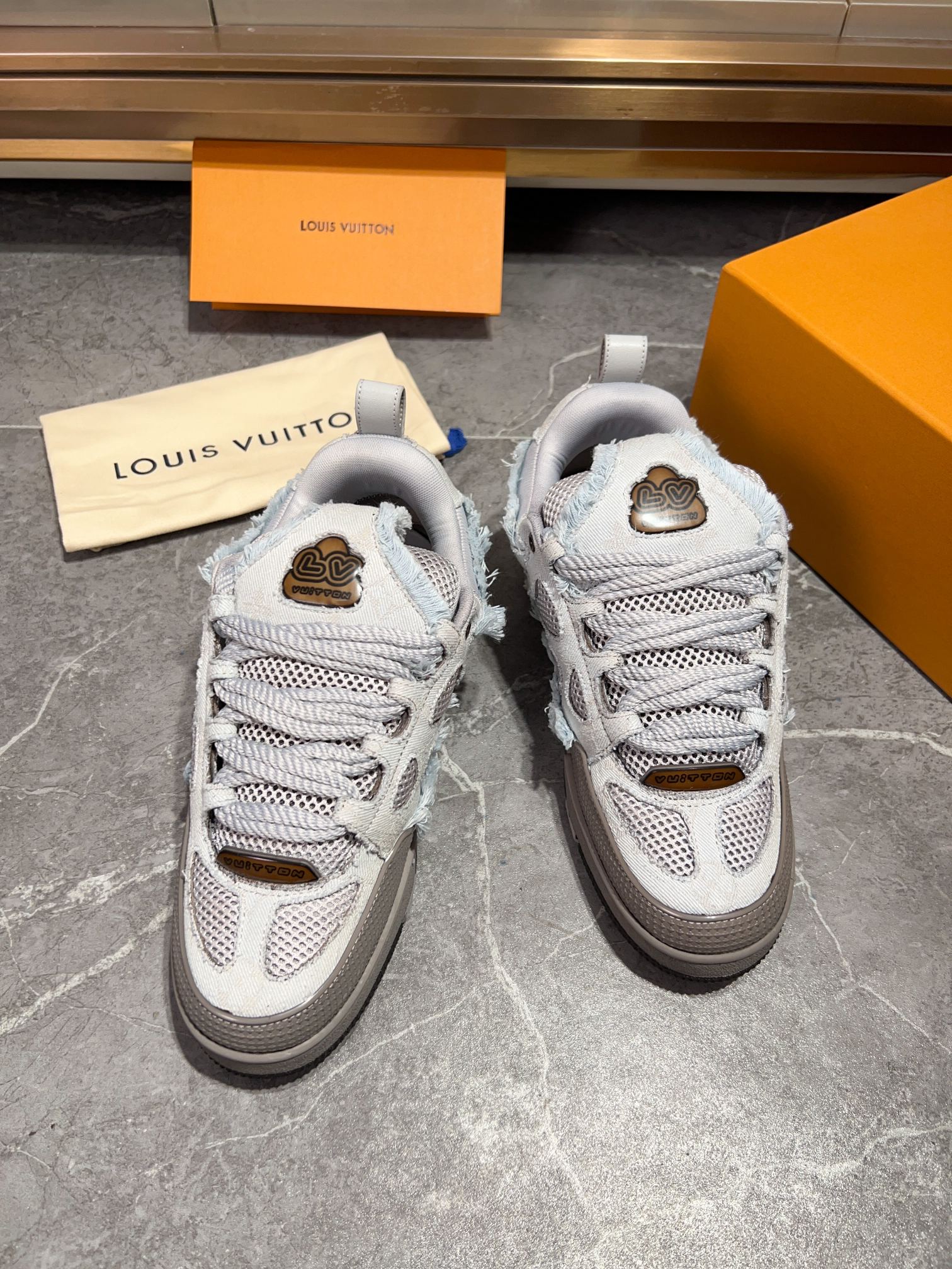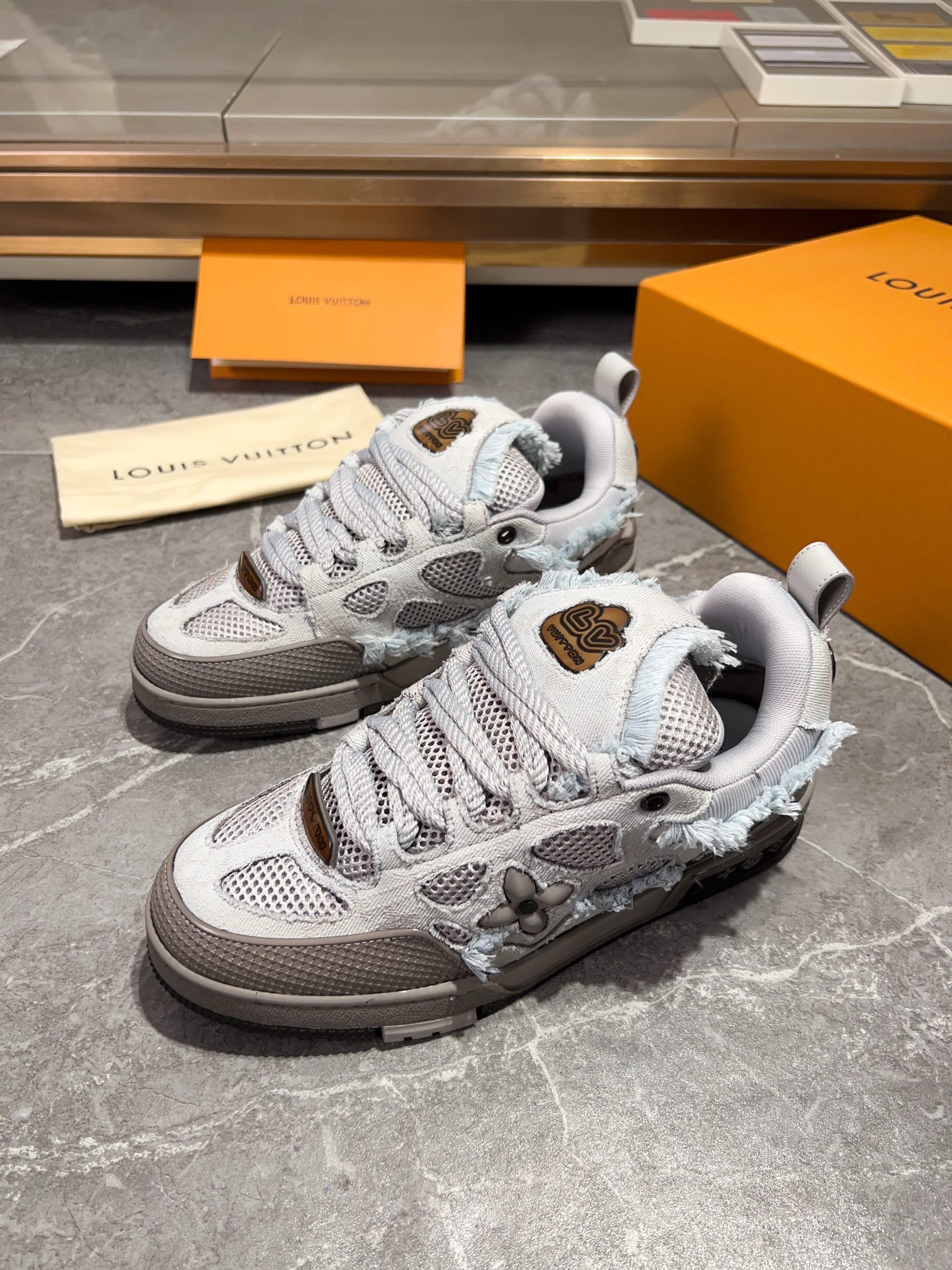 这款鞋子是AAAAA 1:1 质量 (非常棒). 使用了和原版一模一样的材料. 商标部分也保持了和路易威登/Louis Vuitton一样. 图片拍摄是实物鞋子拍摄, 您所收到的实物保证和我们图片一模一样.