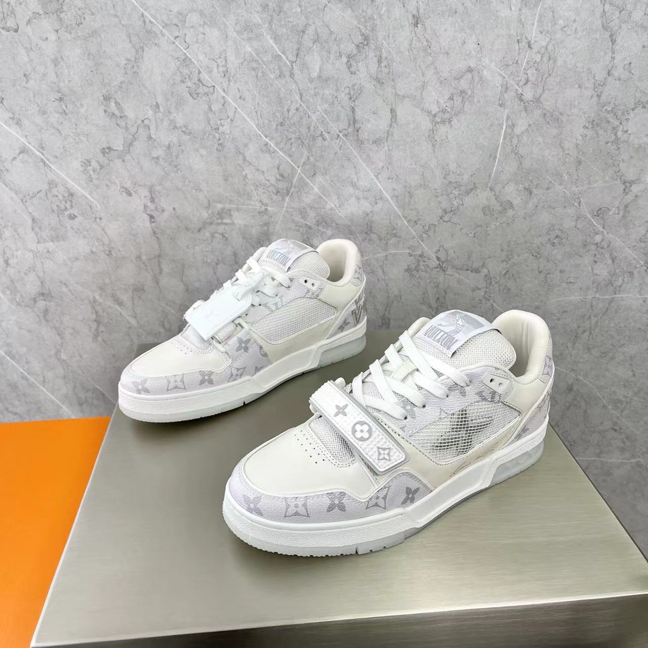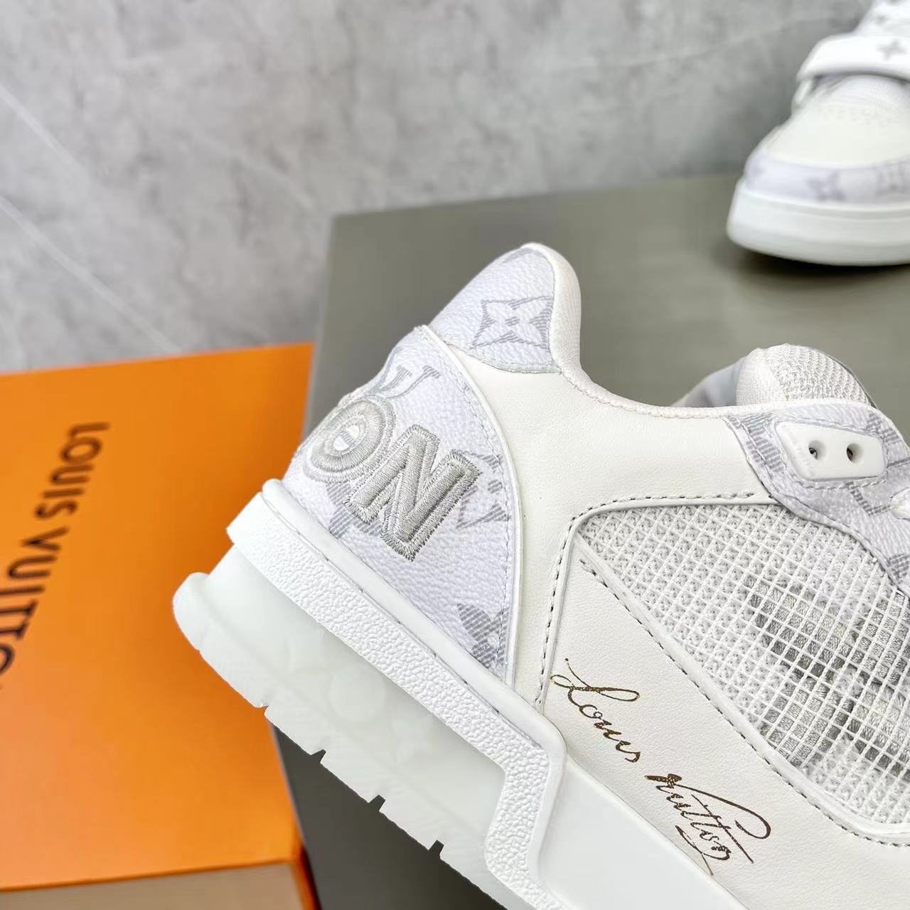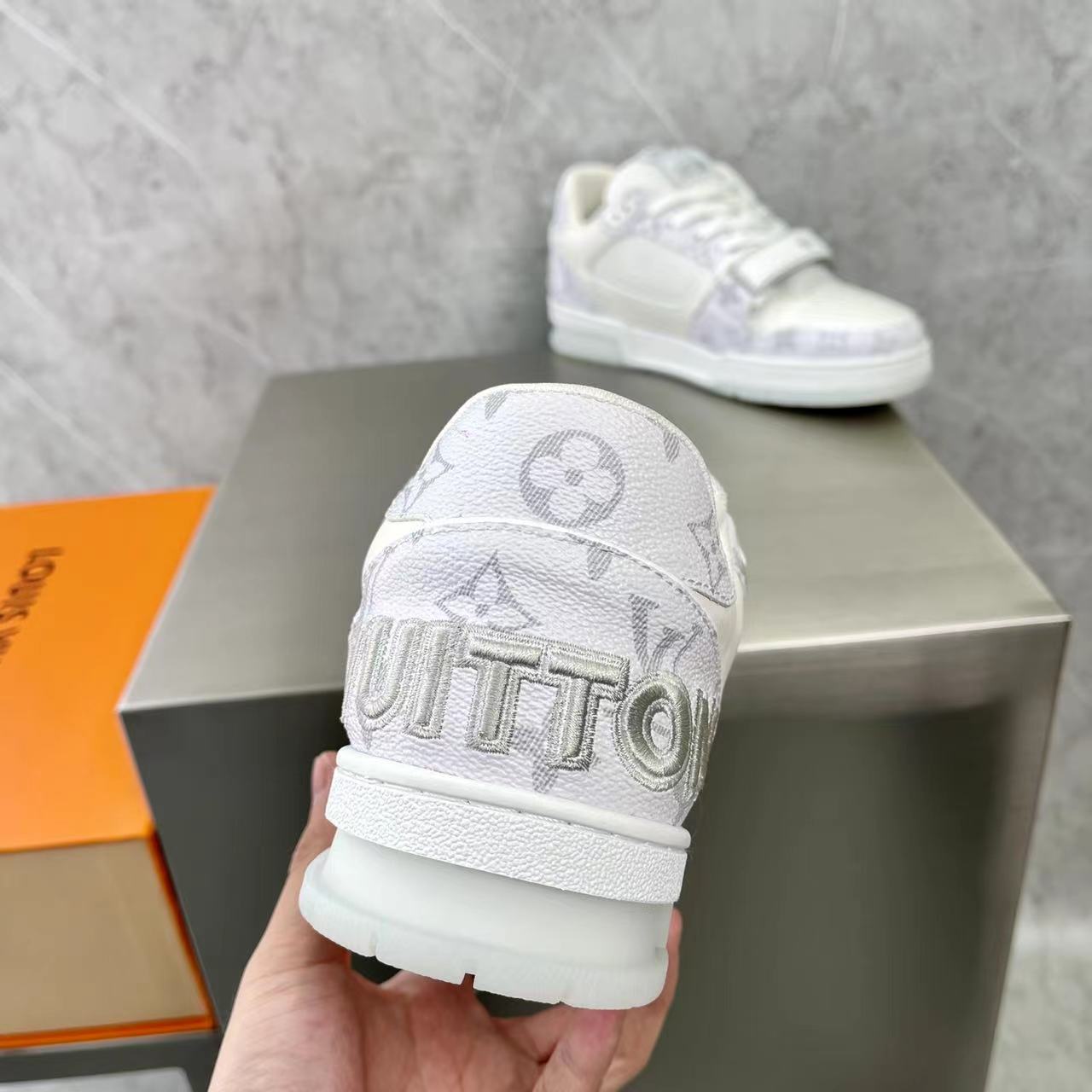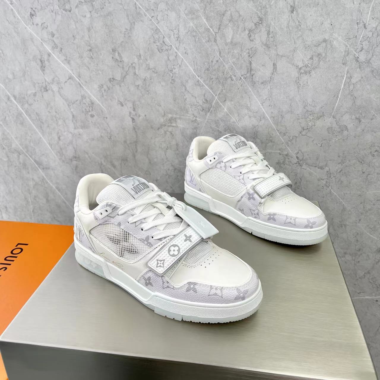 这款鞋子是AAAAA 1:1 质量 (非常棒). 使用了和原版一模一样的材料. 商标部分也保持了和路易威登/Louis Vuitton一样. 图片拍摄是实物鞋子拍摄, 您所收到的实物保证和我们图片一模一样.