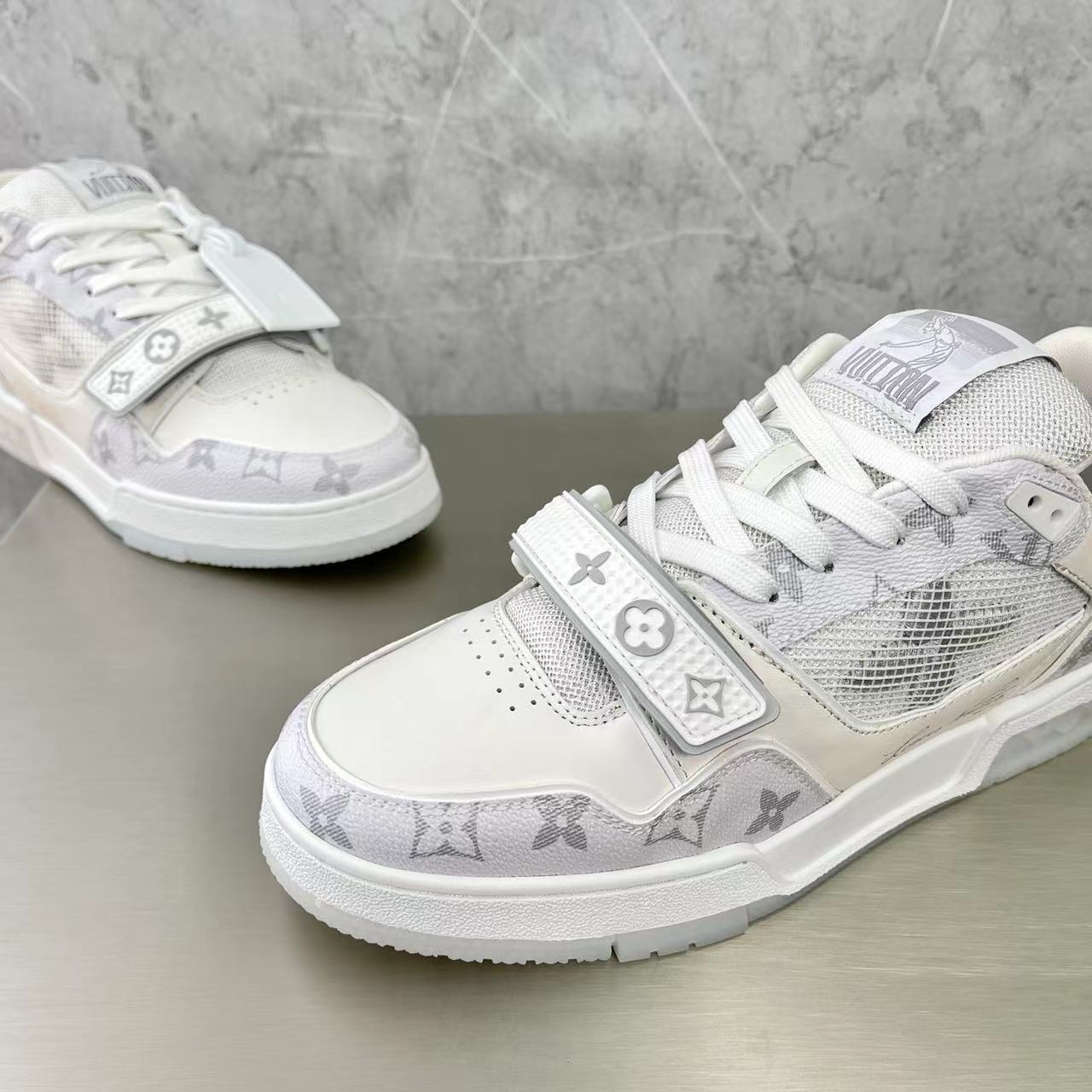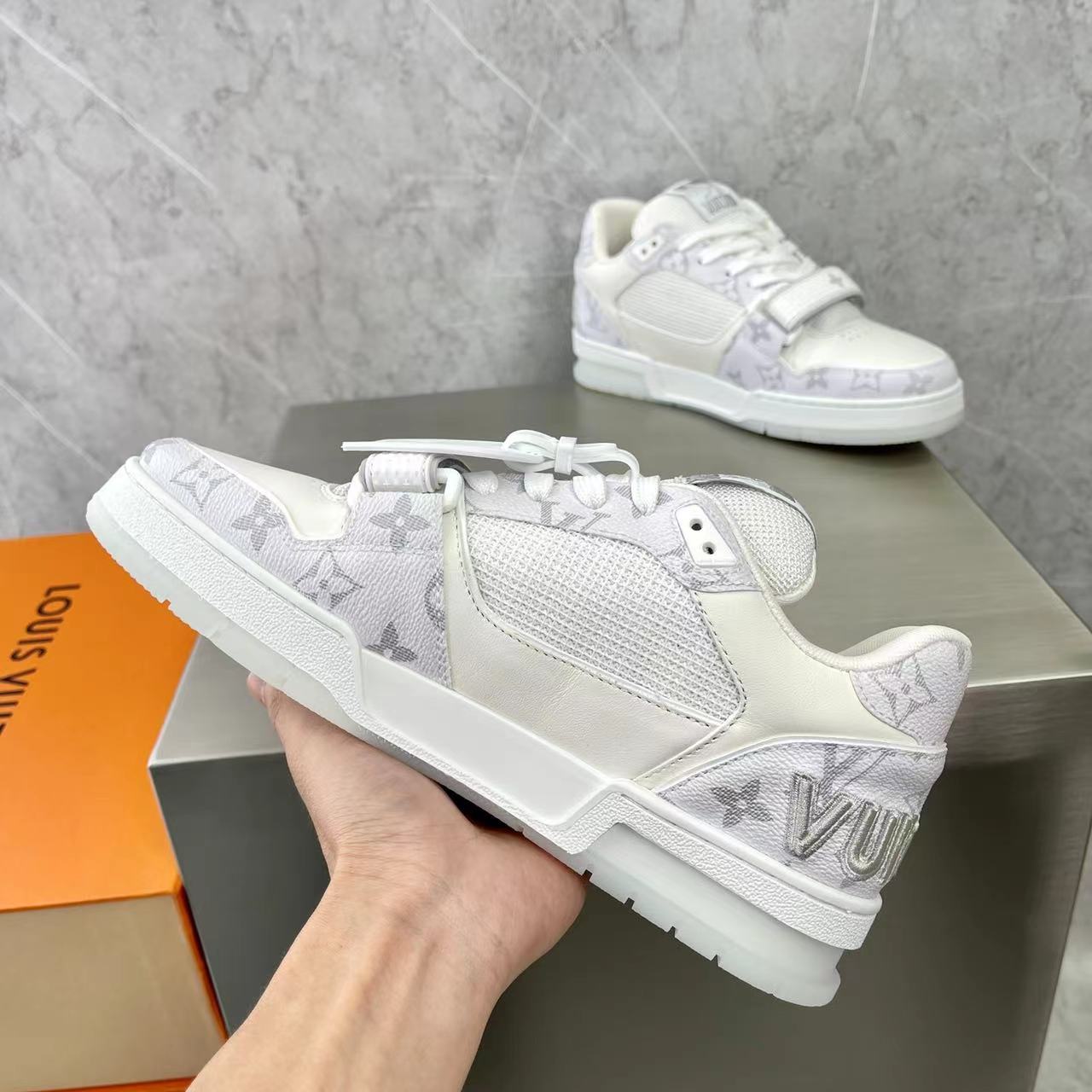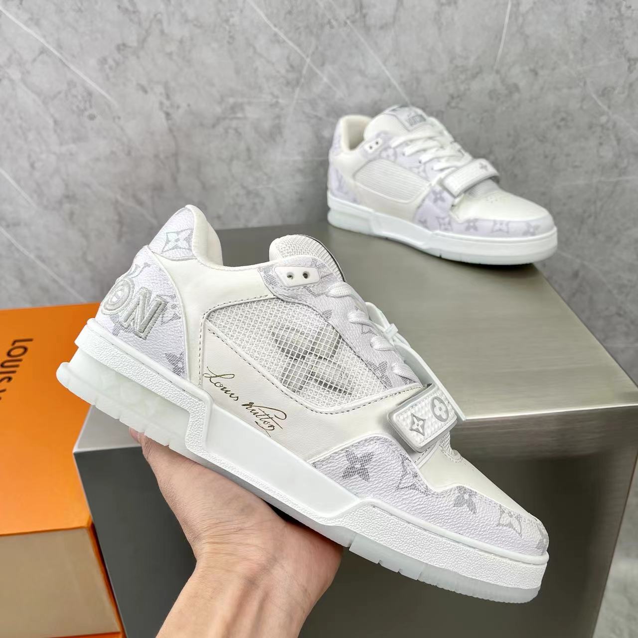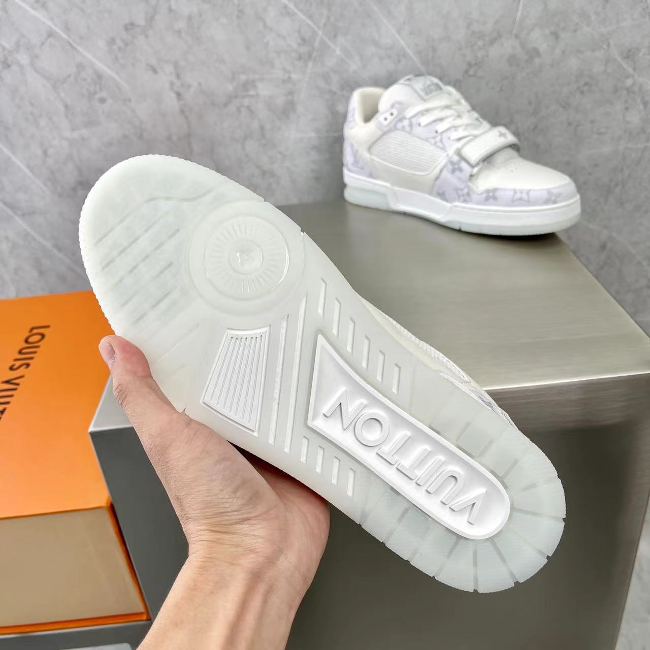 这款鞋子是AAAAA 1:1 质量 (非常棒). 使用了和原版一模一样的材料. 商标部分也保持了和路易威登/Louis Vuitton一样. 图片拍摄是实物鞋子拍摄, 您所收到的实物保证和我们图片一模一样.