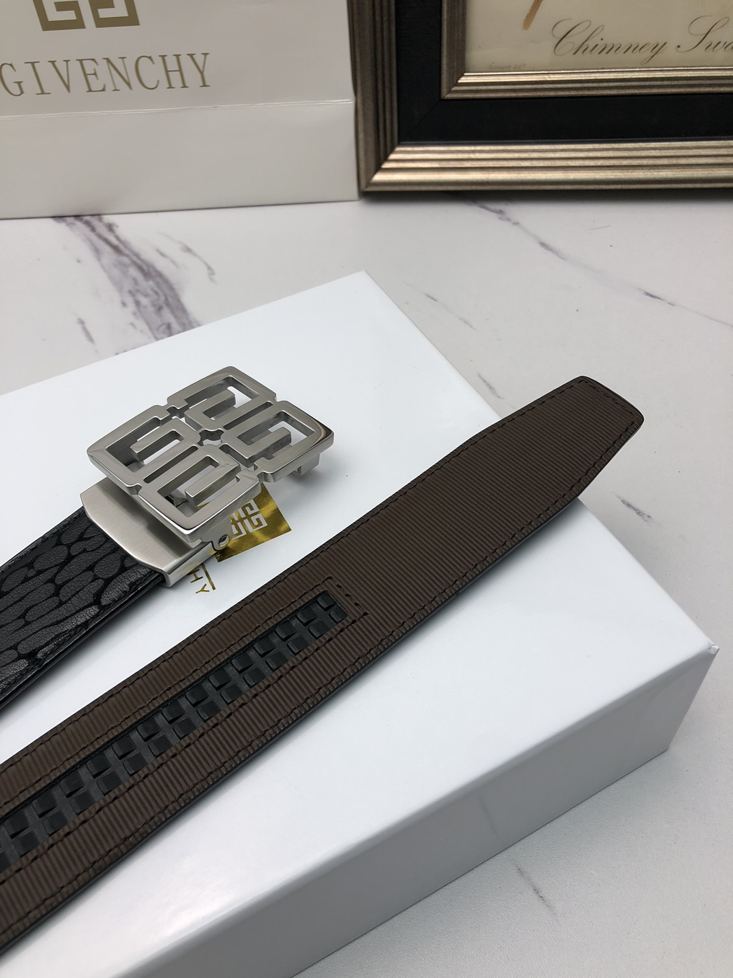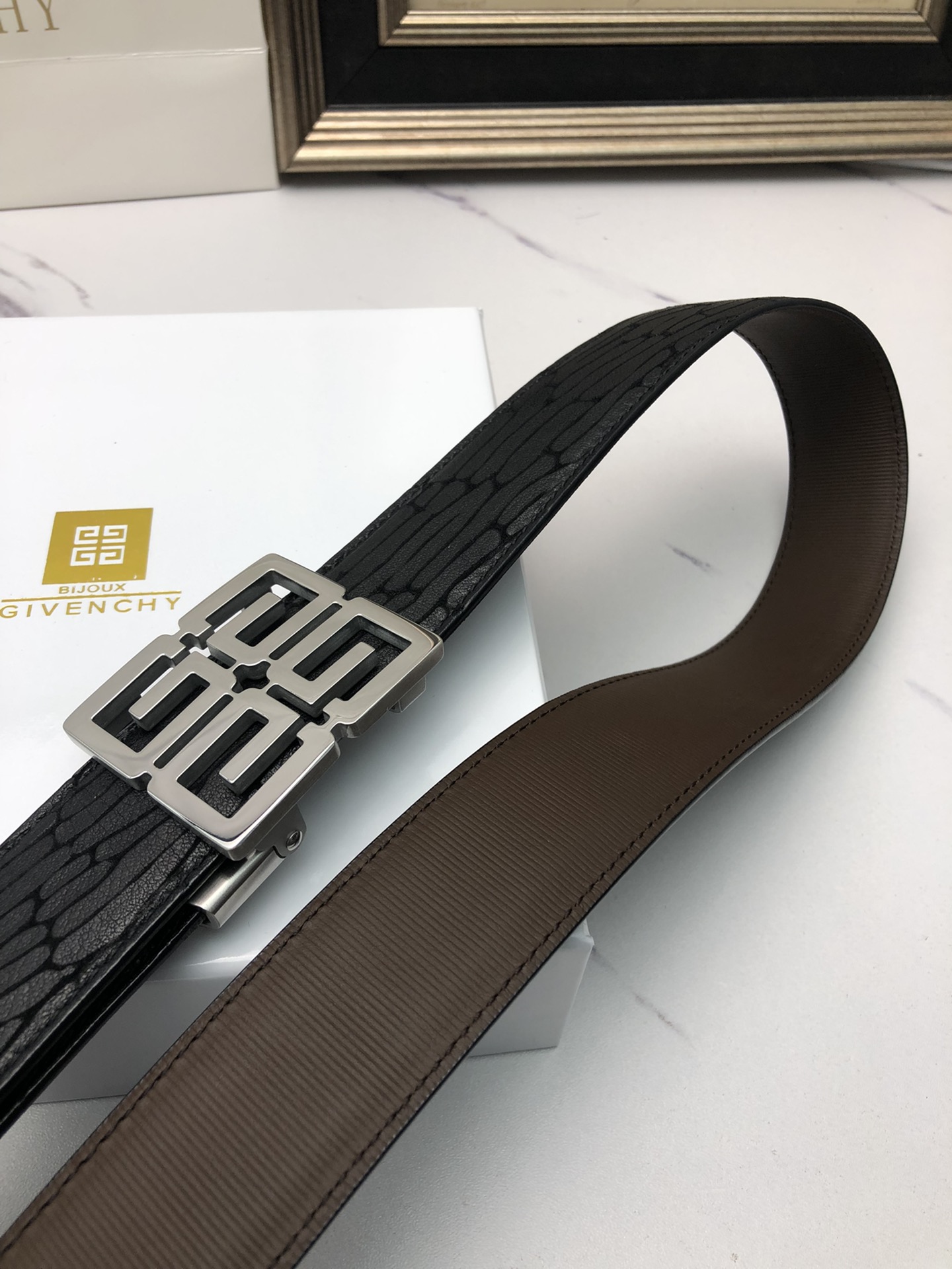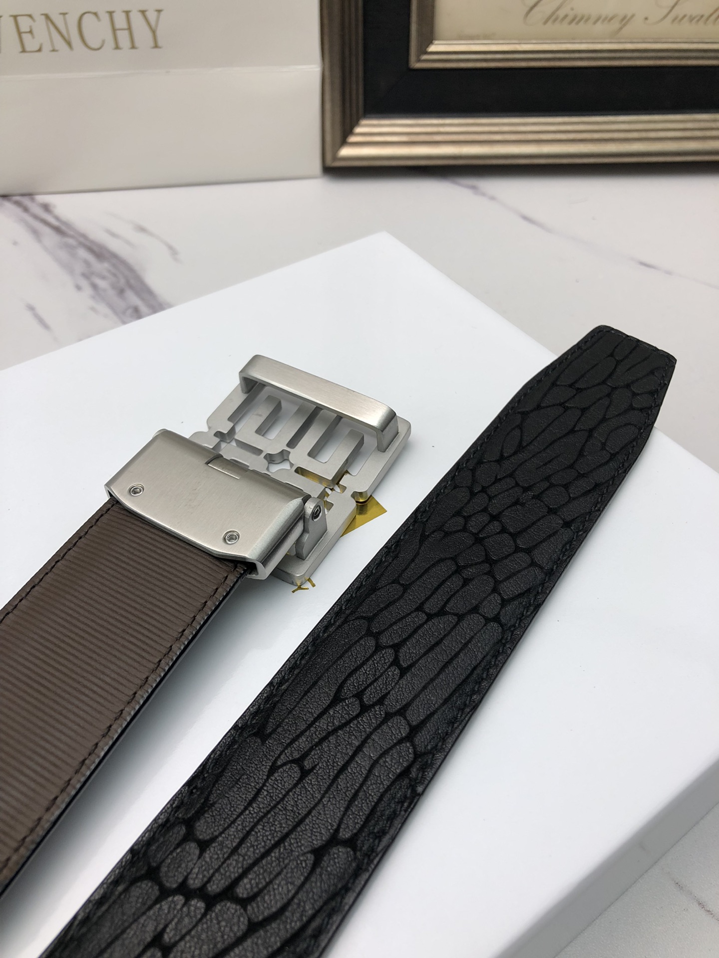 这款皮带是AAAAA 1:1 质量 (非常棒). 使用了和原版一模一样的材料. 商标部分也保持了和纪梵希/Givenchy一样. 图片拍摄是实物皮带拍摄, 您所收到的实物保证和我们图片一模一样.