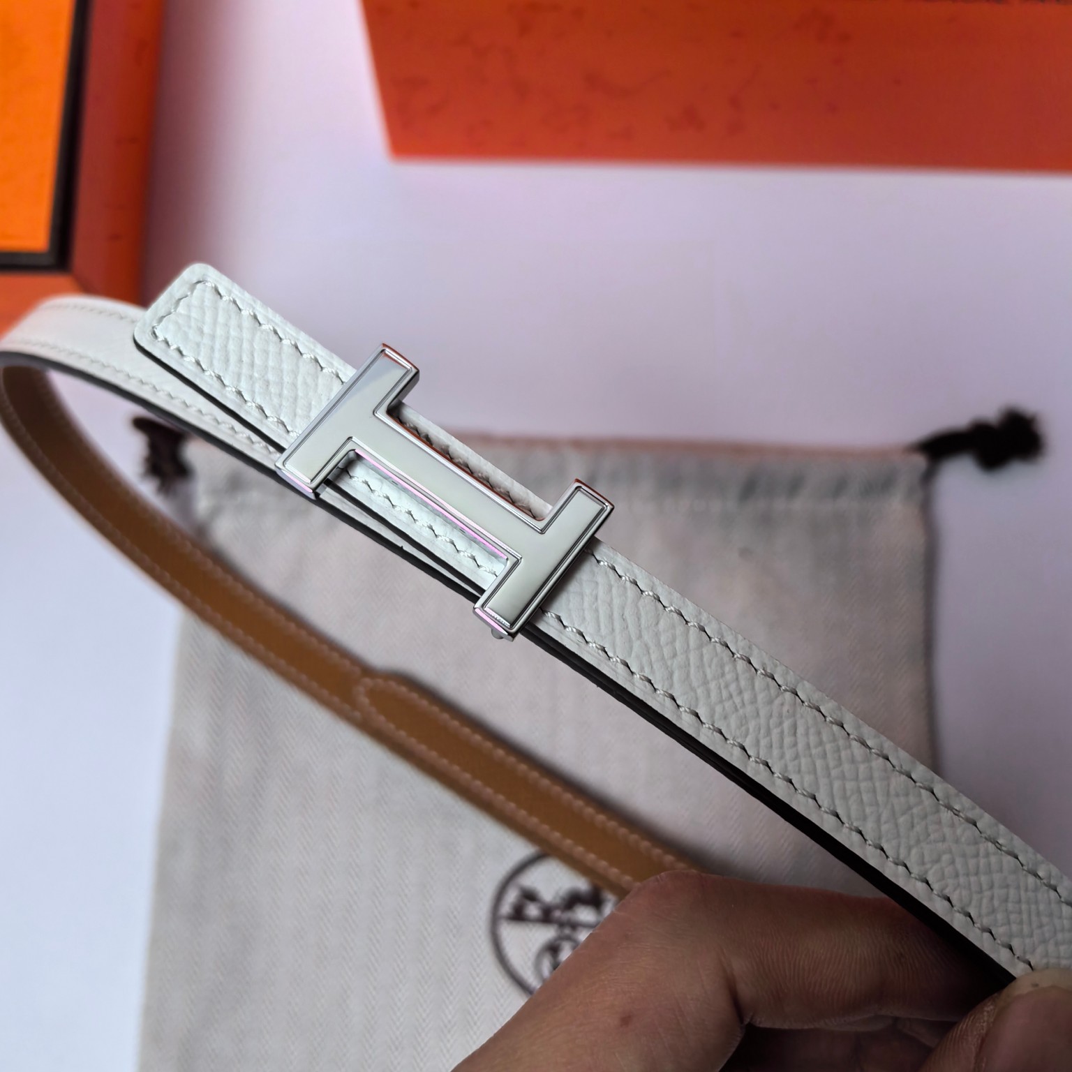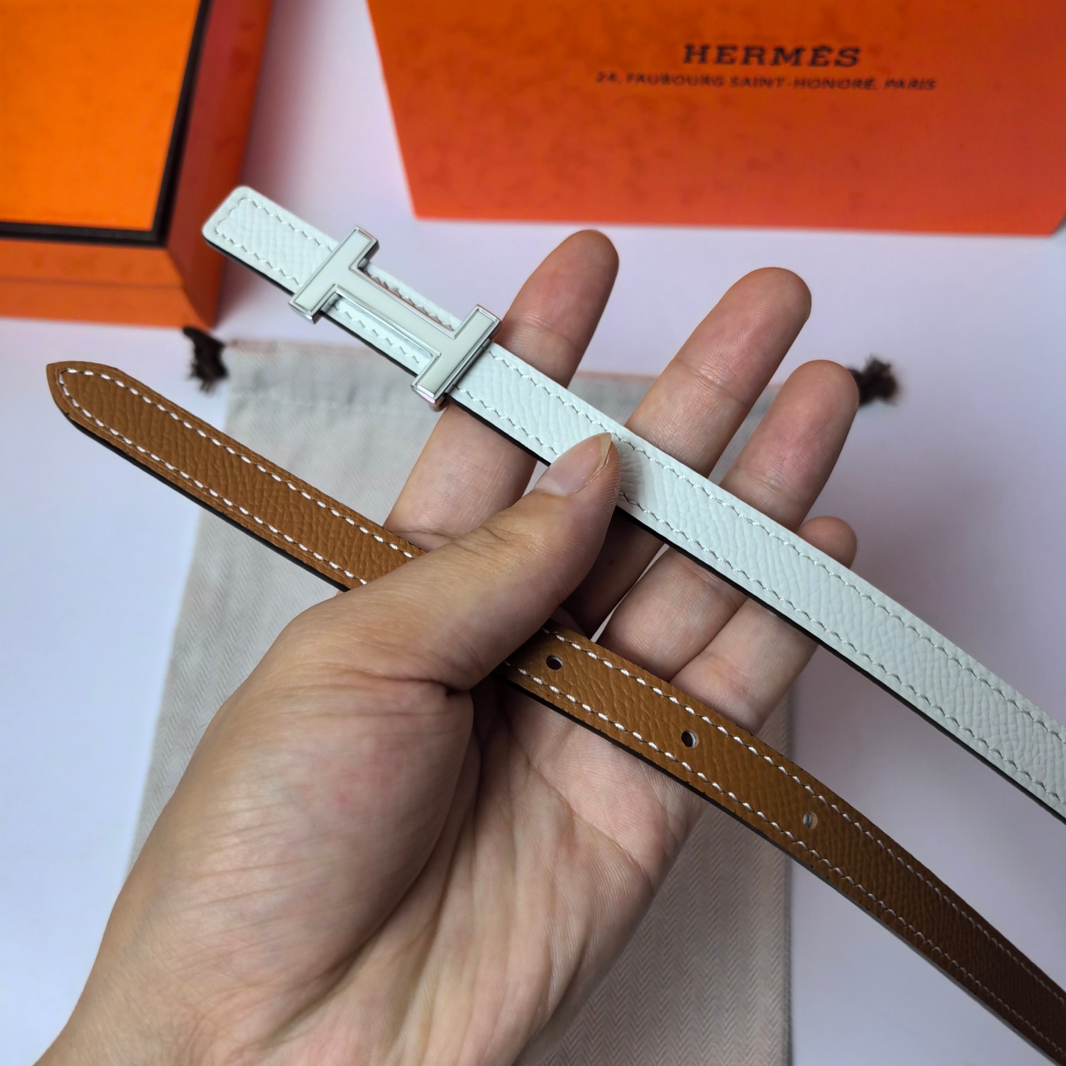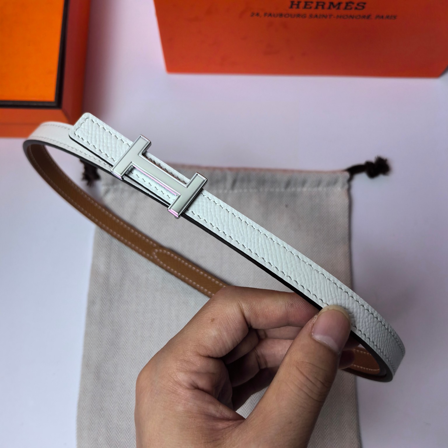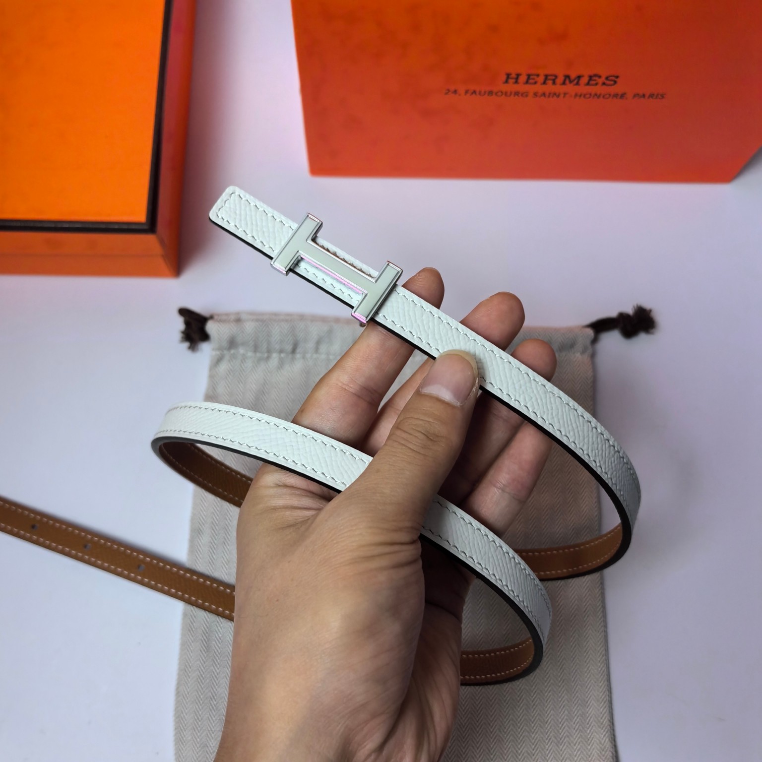 这款皮带是AAAAA 1:1 质量 (非常棒). 使用了和原版一模一样的材料. 商标部分也保持了和爱马仕/Hermes一样. 图片拍摄是实物皮带拍摄, 您所收到的实物保证和我们图片一模一样.