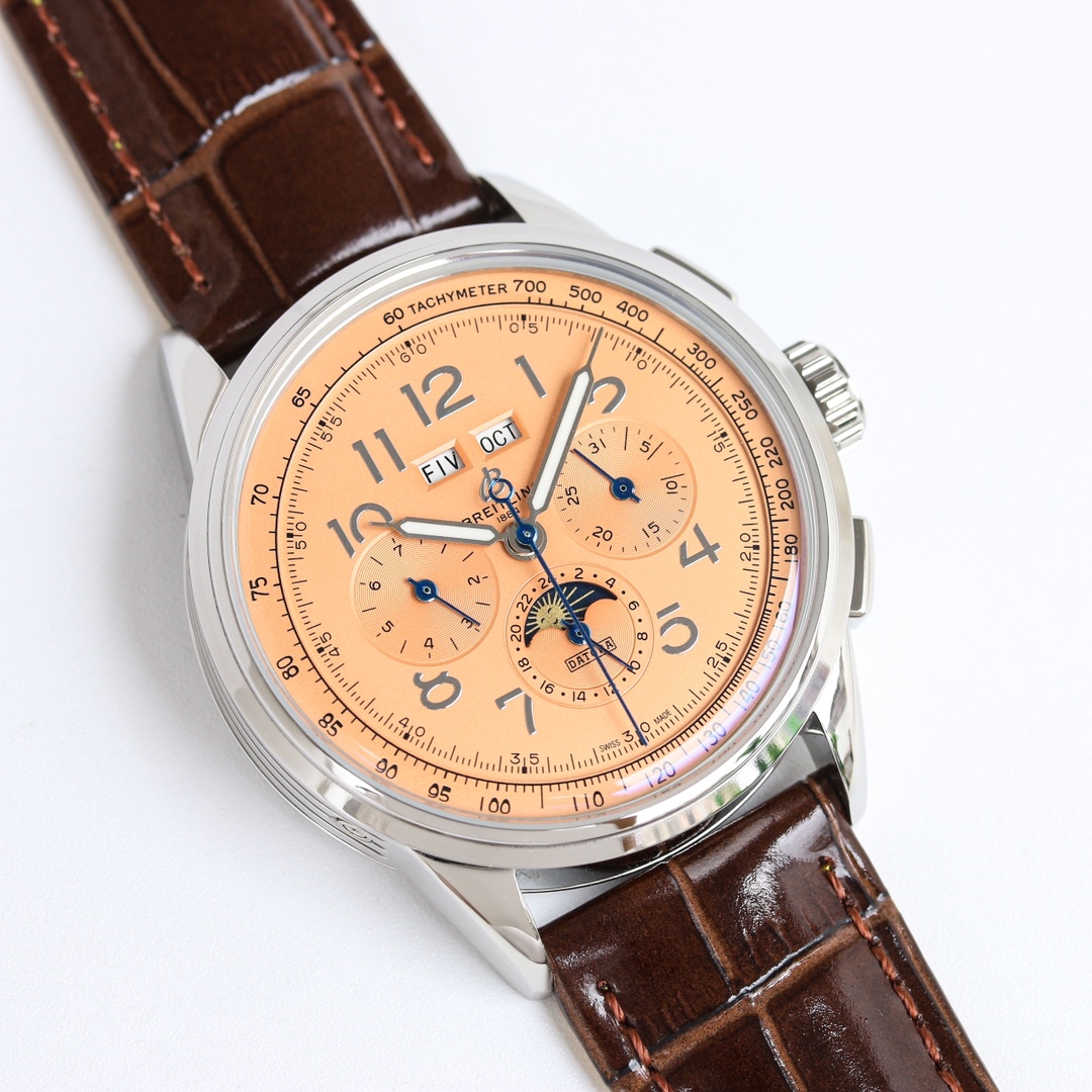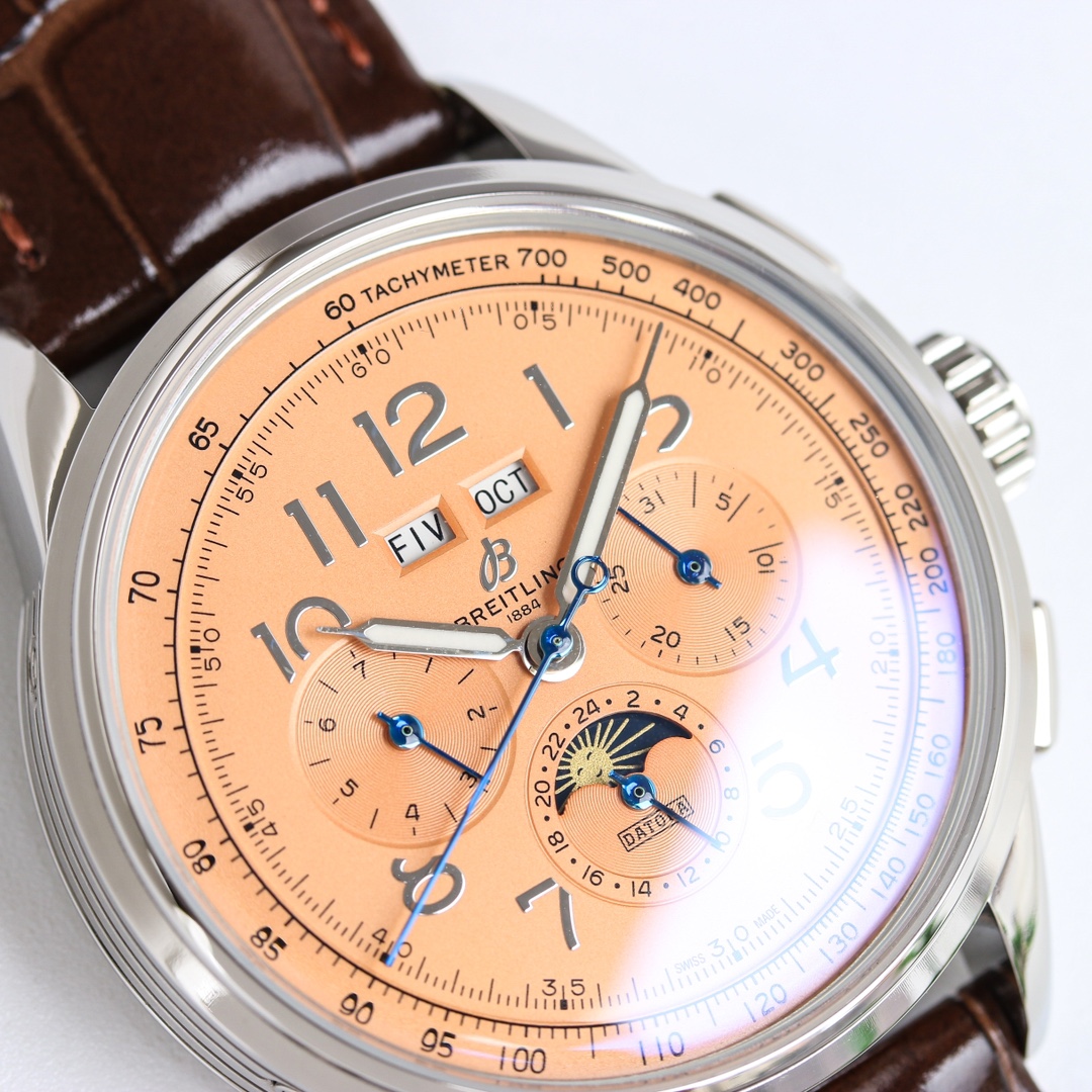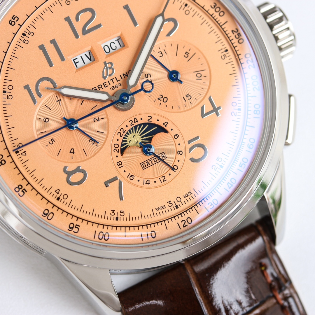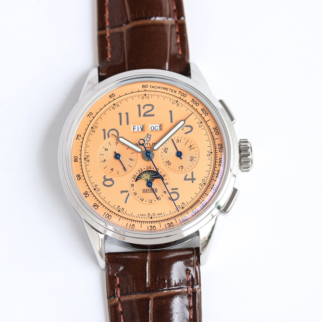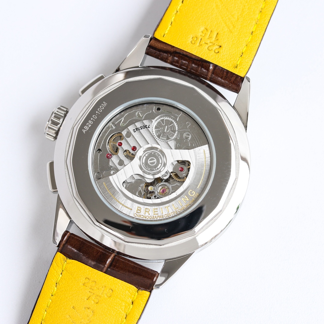 这款手表是AAAAA 1:1 质量 (非常棒). 使用了和原版一模一样的材料. 商标部分也保持了和Breitling一样. 图片拍摄是实物手表拍摄, 您所收到的实物保证和我们图片一模一样.