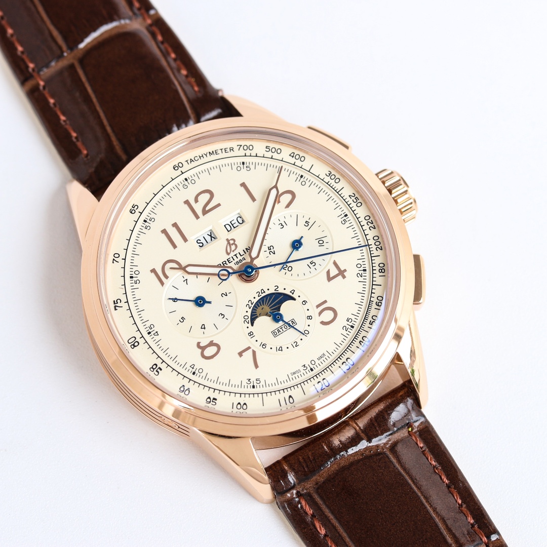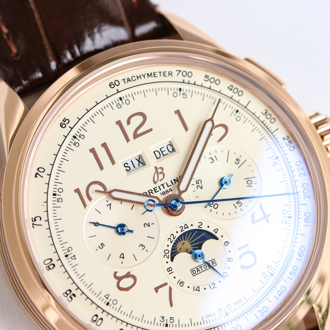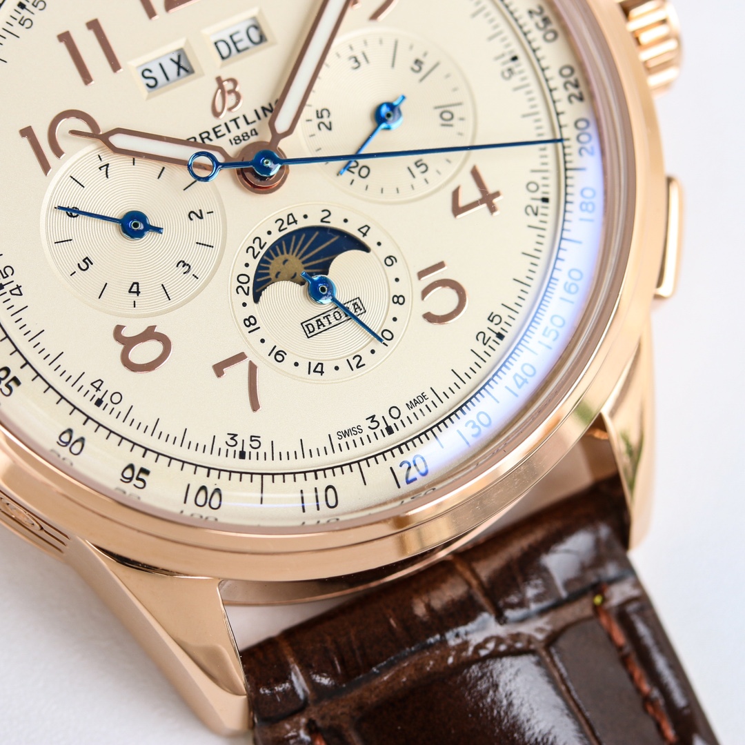 这款手表是AAAAA 1:1 质量 (非常棒). 使用了和原版一模一样的材料. 商标部分也保持了和Breitling一样. 图片拍摄是实物手表拍摄, 您所收到的实物保证和我们图片一模一样.