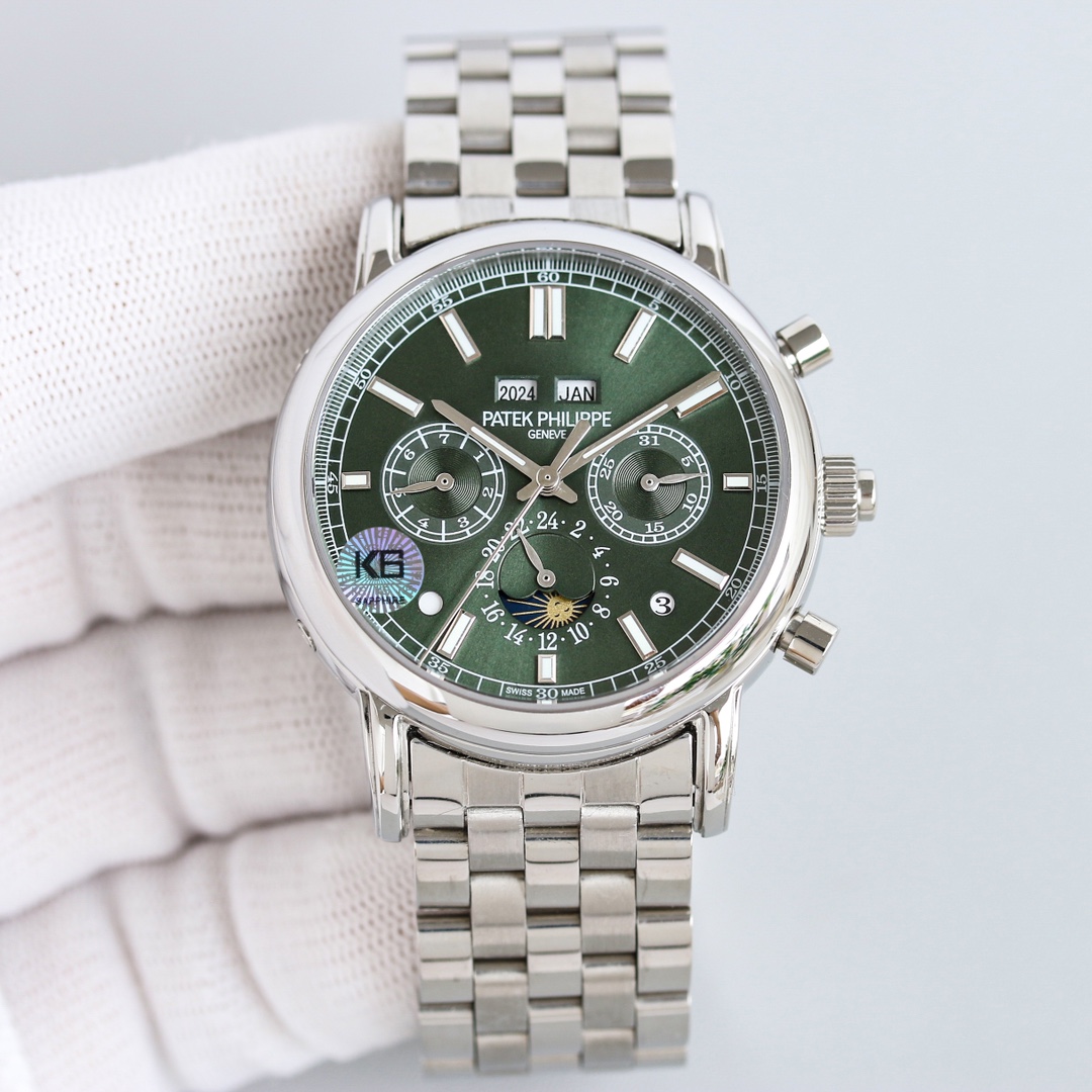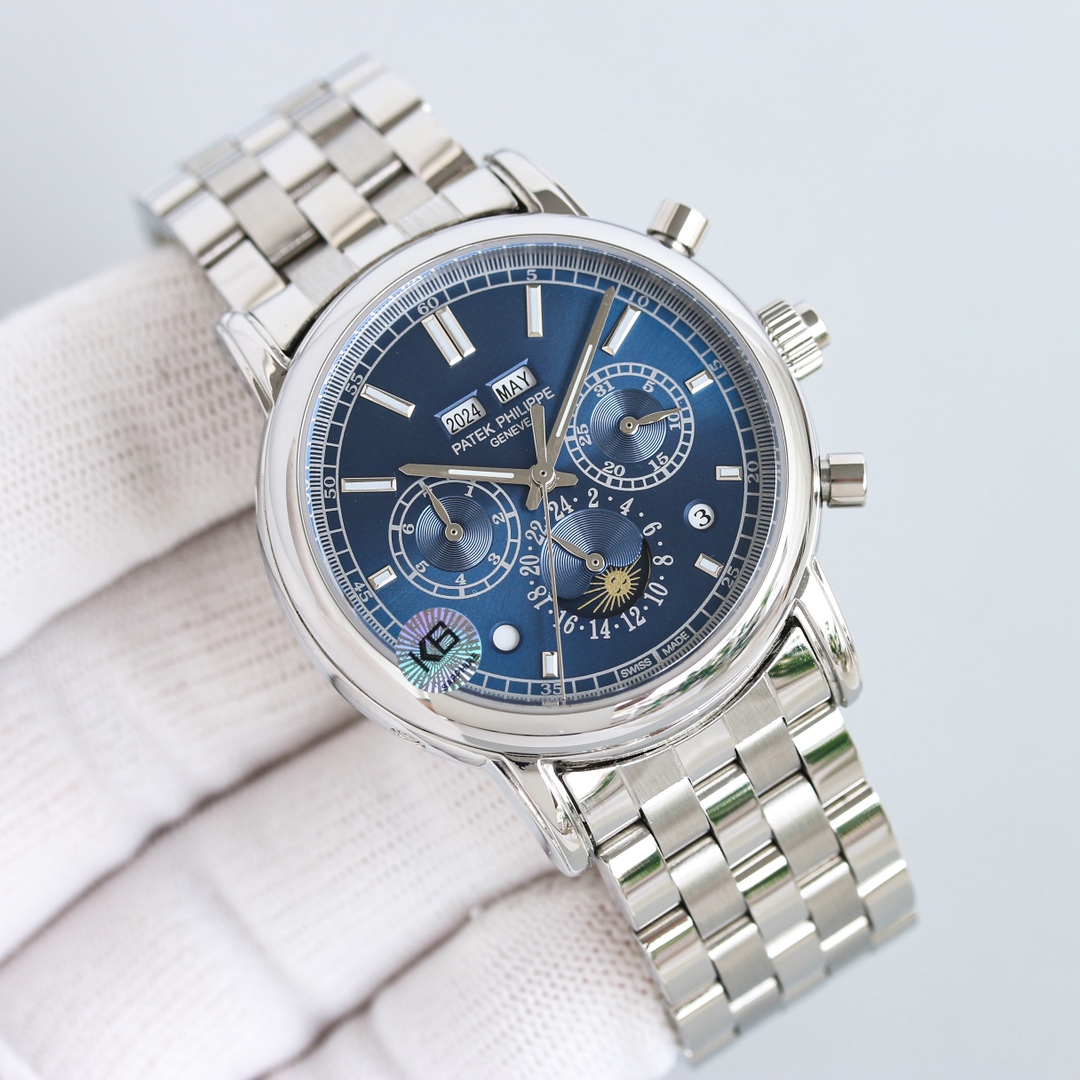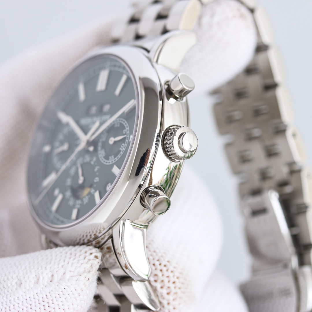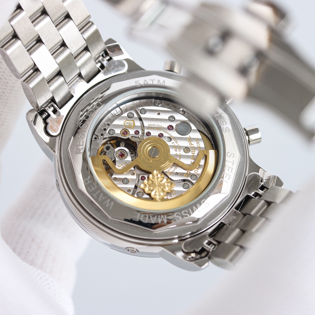 这款手表是AAAAA 1:1 质量 (非常棒). 使用了和原版一模一样的材料. 商标部分也保持了和百达翡丽/Patek Philippe一样. 图片拍摄是实物手表拍摄, 您所收到的实物保证和我们图片一模一样.