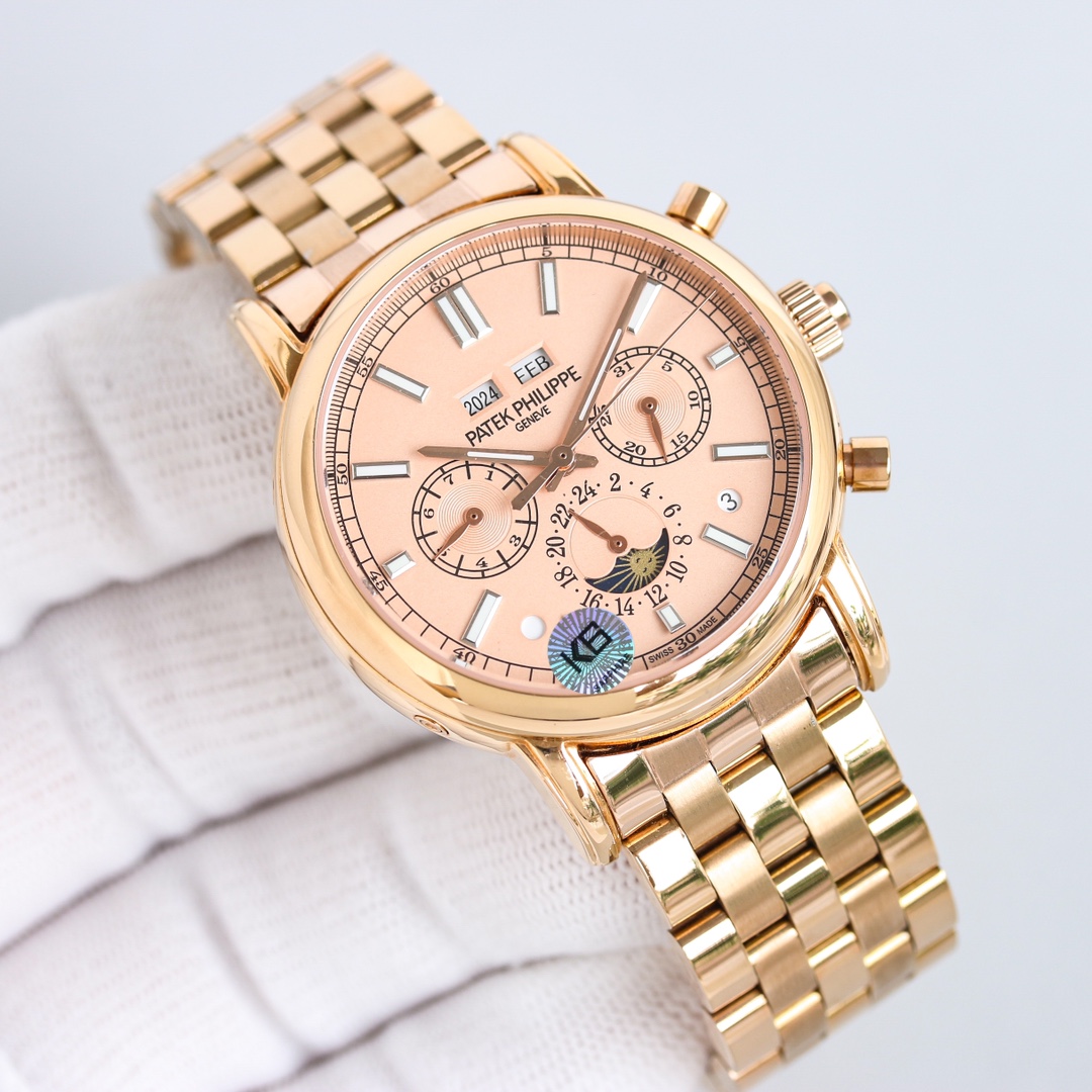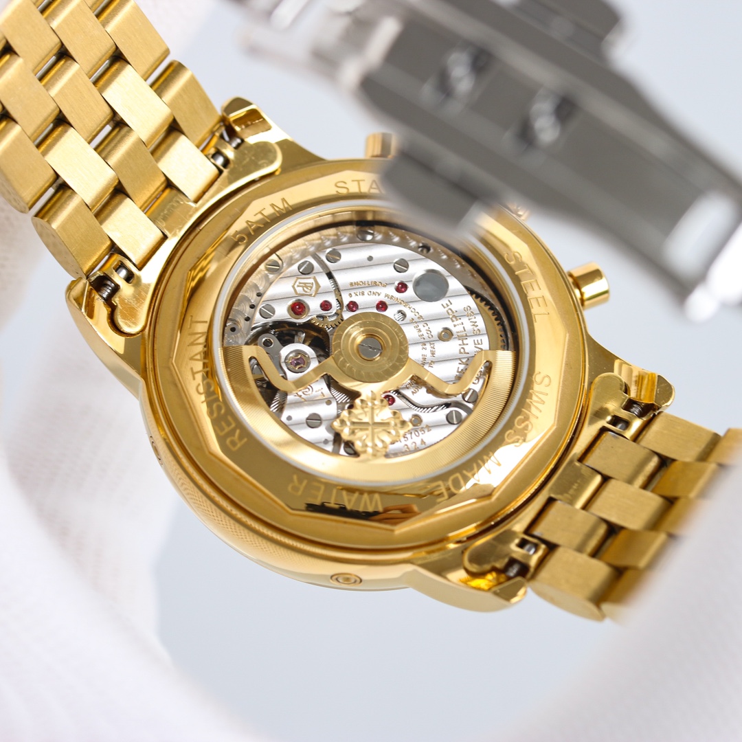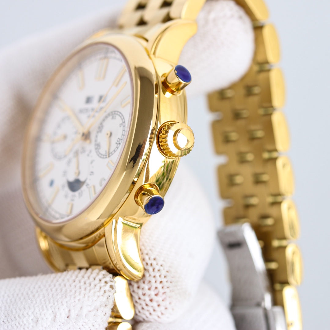这款手表是AAAAA 1:1 质量 (非常棒). 使用了和原版一模一样的材料. 商标部分也保持了和百达翡丽/Patek Philippe一样. 图片拍摄是实物手表拍摄, 您所收到的实物保证和我们图片一模一样.