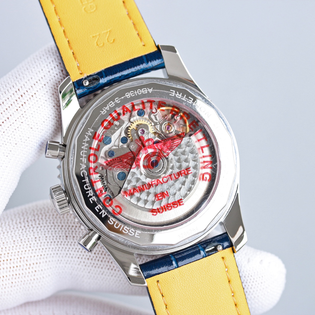 这款手表是AAAAA 1:1 质量 (非常棒). 使用了和原版一模一样的材料. 商标部分也保持了和Breitling一样. 图片拍摄是实物手表拍摄, 您所收到的实物保证和我们图片一模一样.