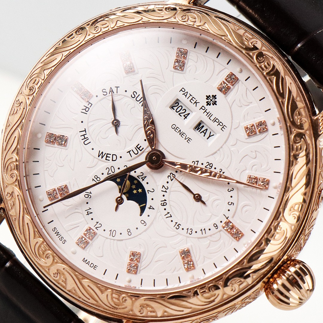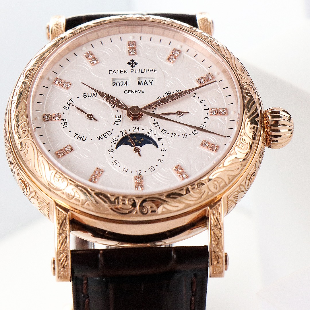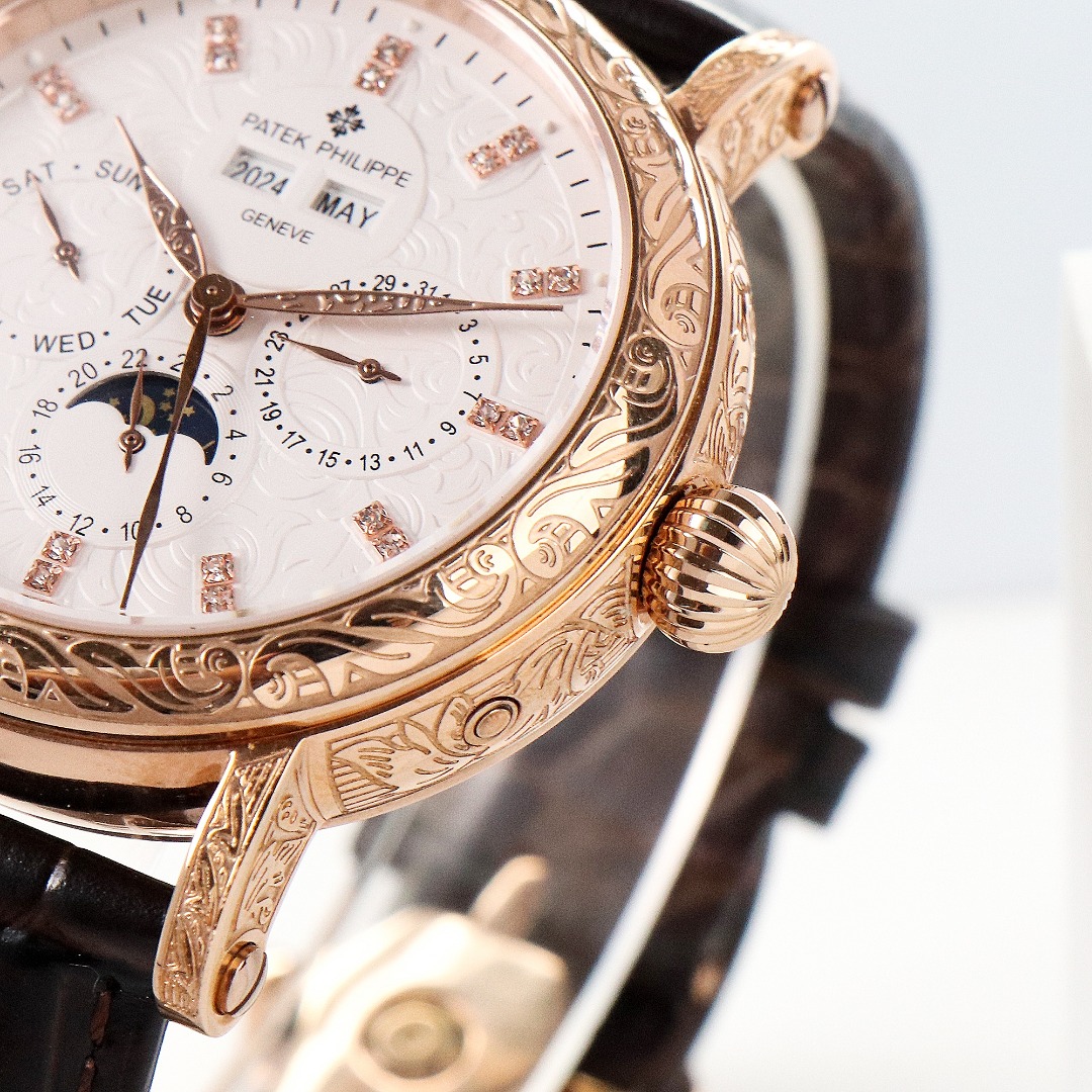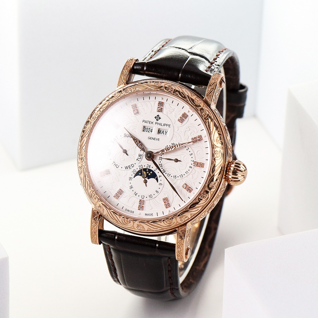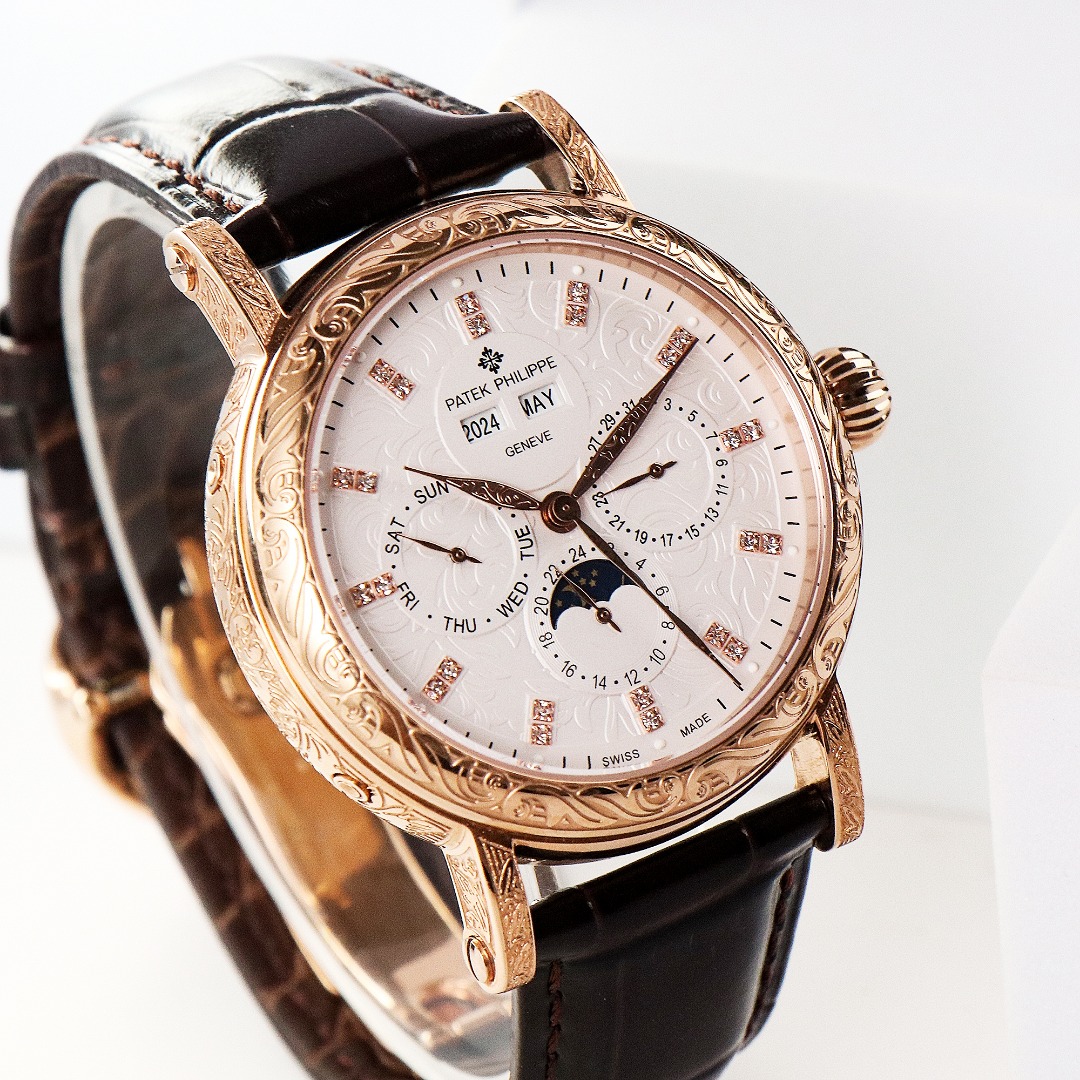 这款手表是AAAAA 1:1 质量 (非常棒). 使用了和原版一模一样的材料. 商标部分也保持了和百达翡丽/Patek Philippe一样. 图片拍摄是实物手表拍摄, 您所收到的实物保证和我们图片一模一样.