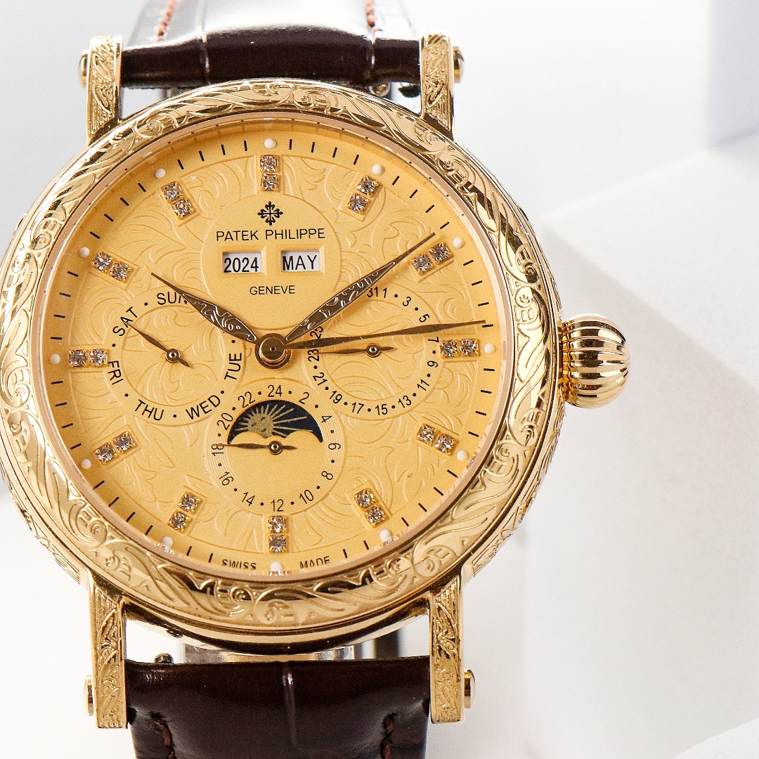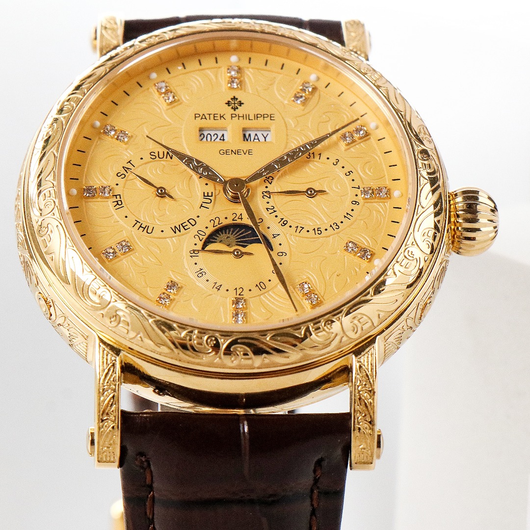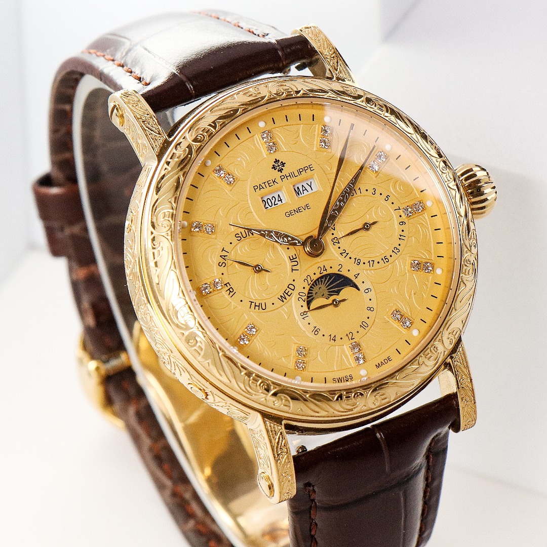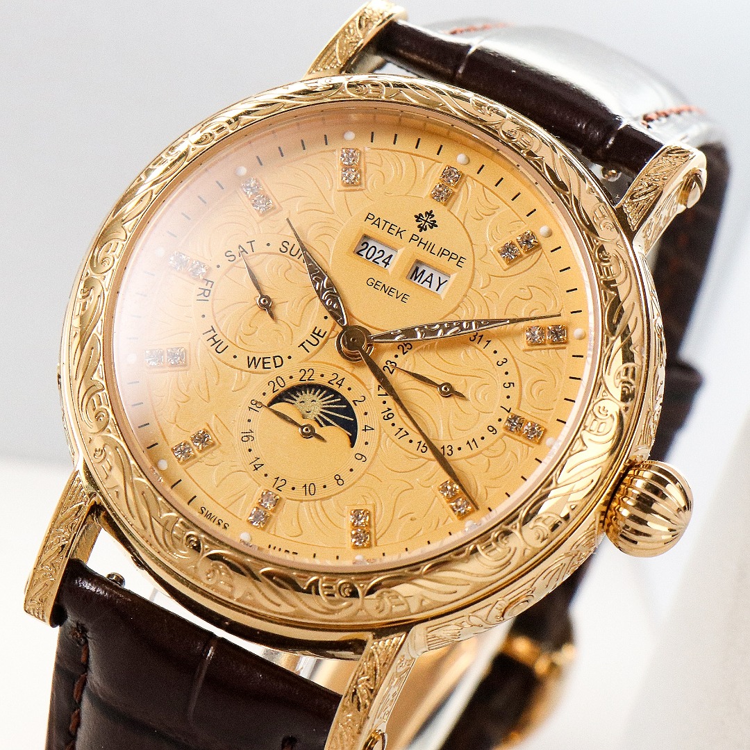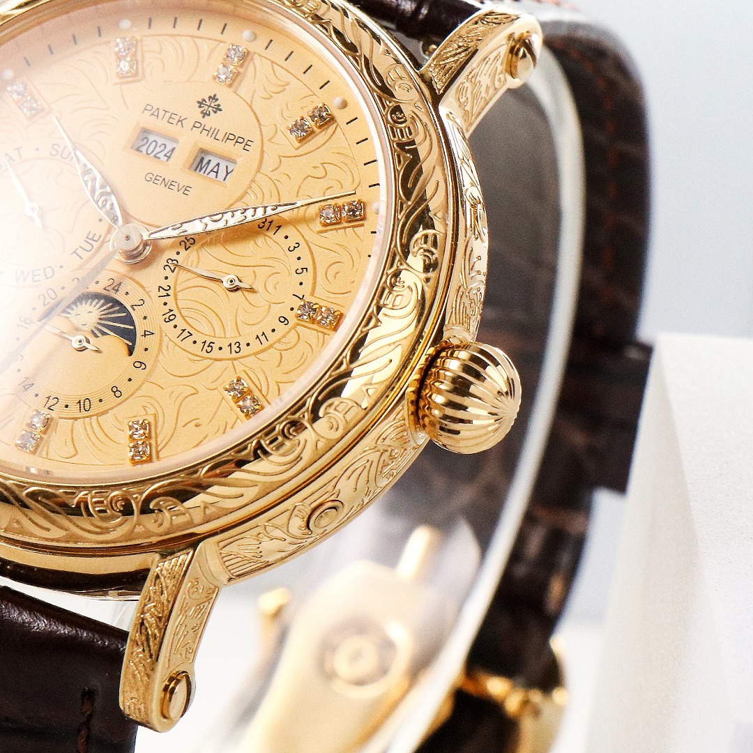 这款手表是AAAAA 1:1 质量 (非常棒). 使用了和原版一模一样的材料. 商标部分也保持了和百达翡丽/Patek Philippe一样. 图片拍摄是实物手表拍摄, 您所收到的实物保证和我们图片一模一样.