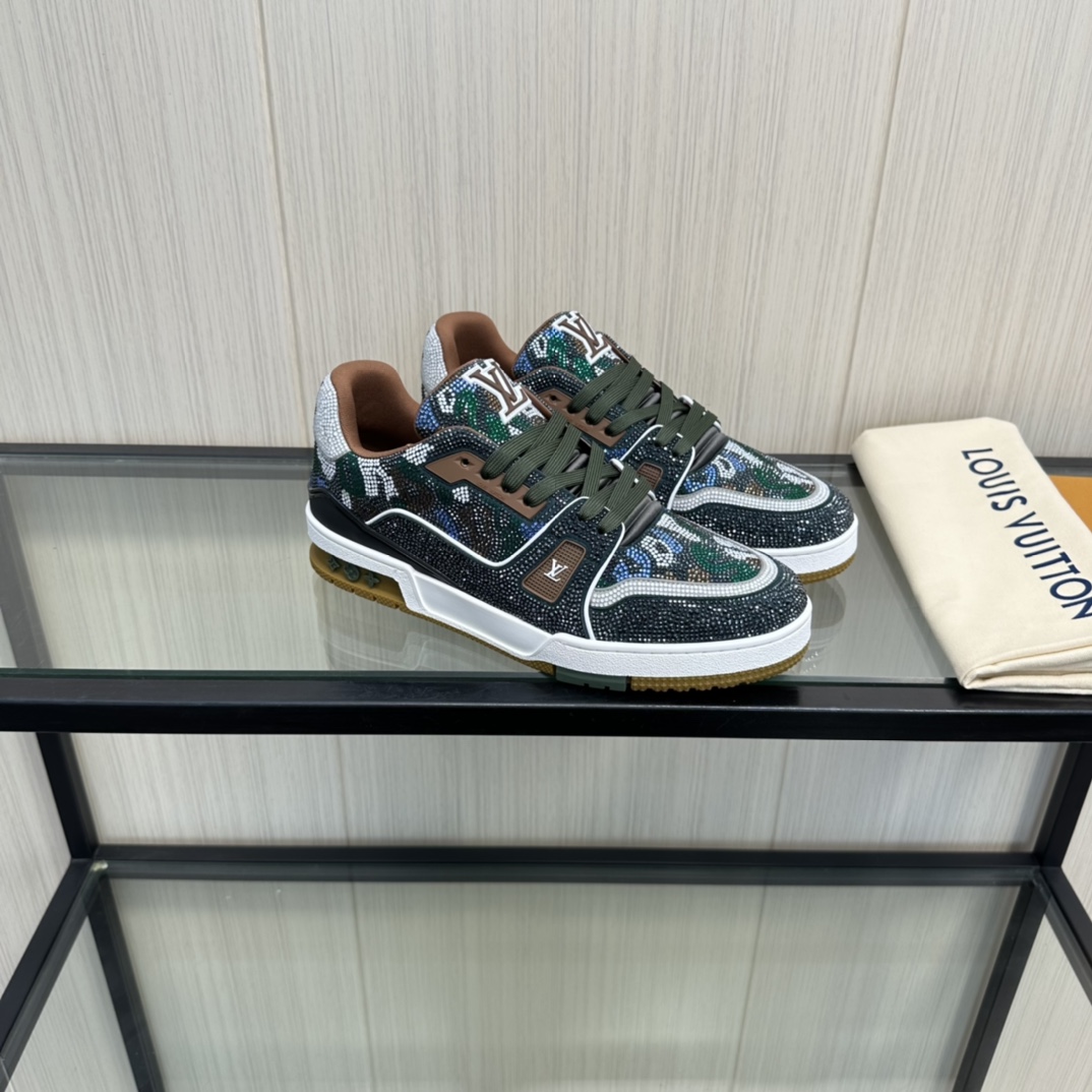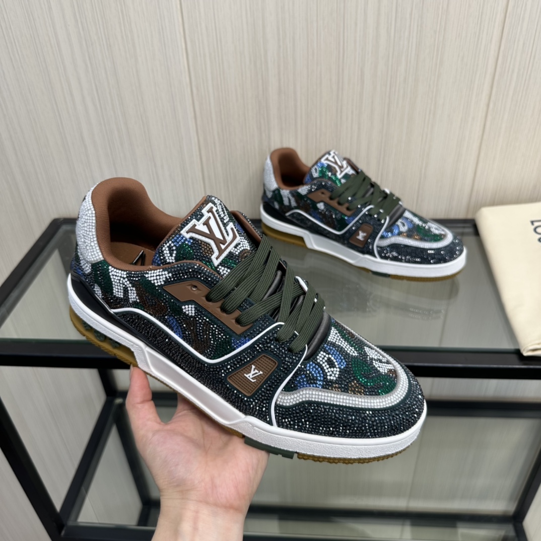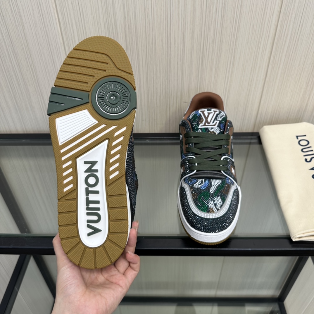 这款鞋子是AAAAA 1:1 质量 (非常棒). 使用了和原版一模一样的材料. 商标部分也保持了和路易威登/Louis Vuitton一样. 图片拍摄是实物鞋子拍摄, 您所收到的实物保证和我们图片一模一样.
