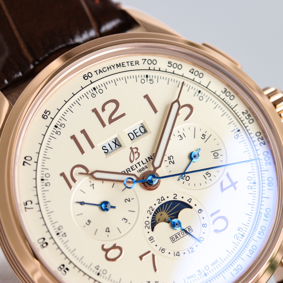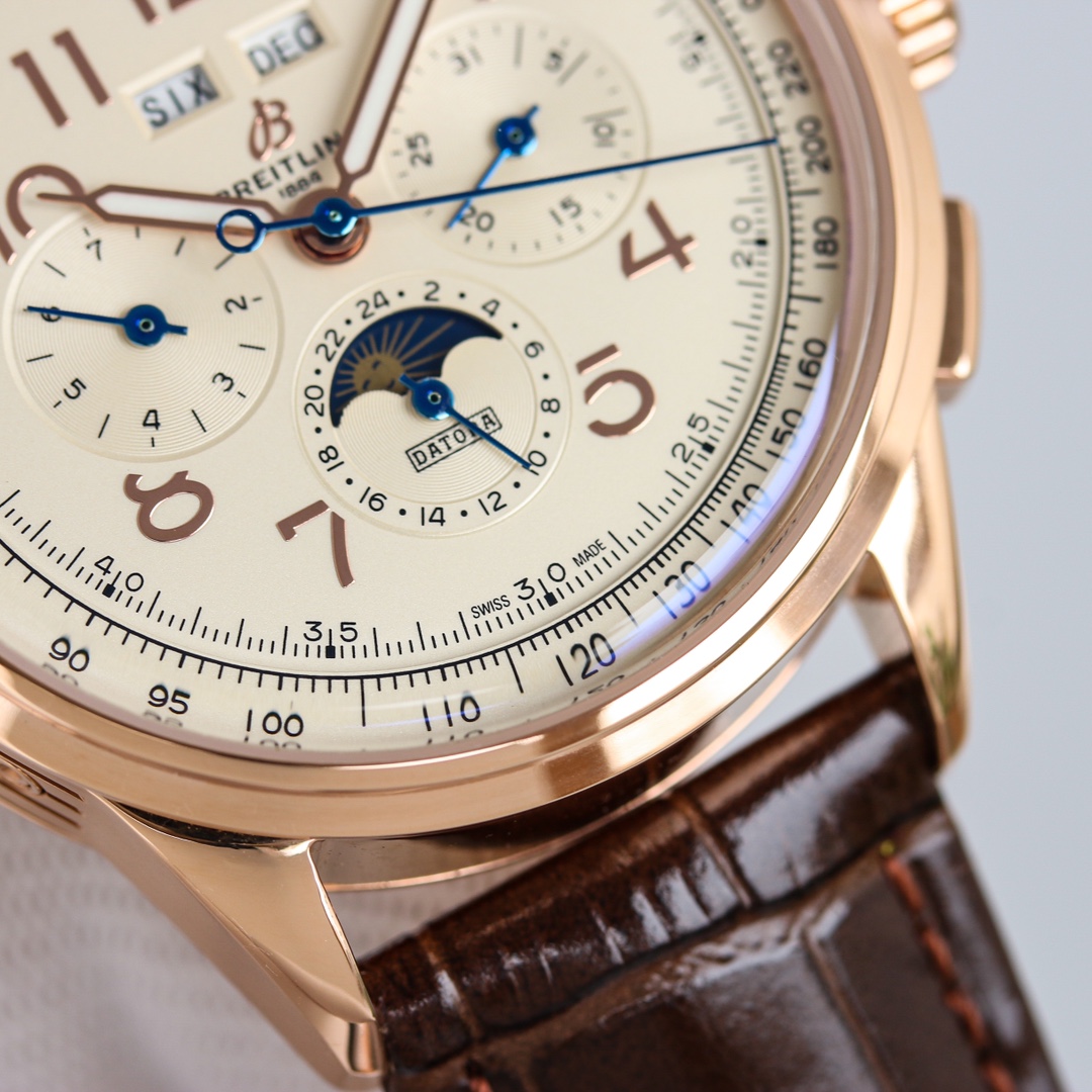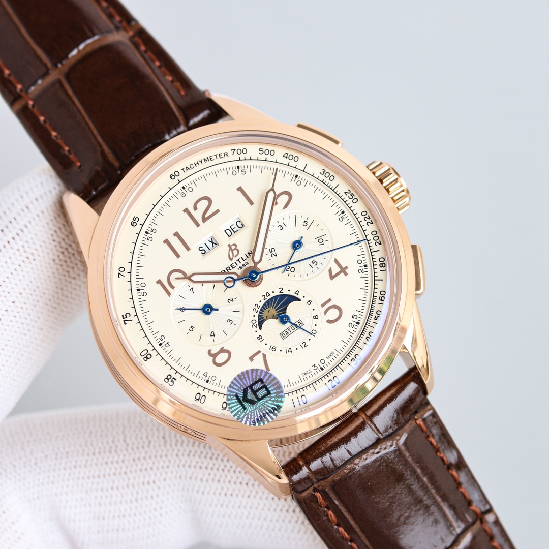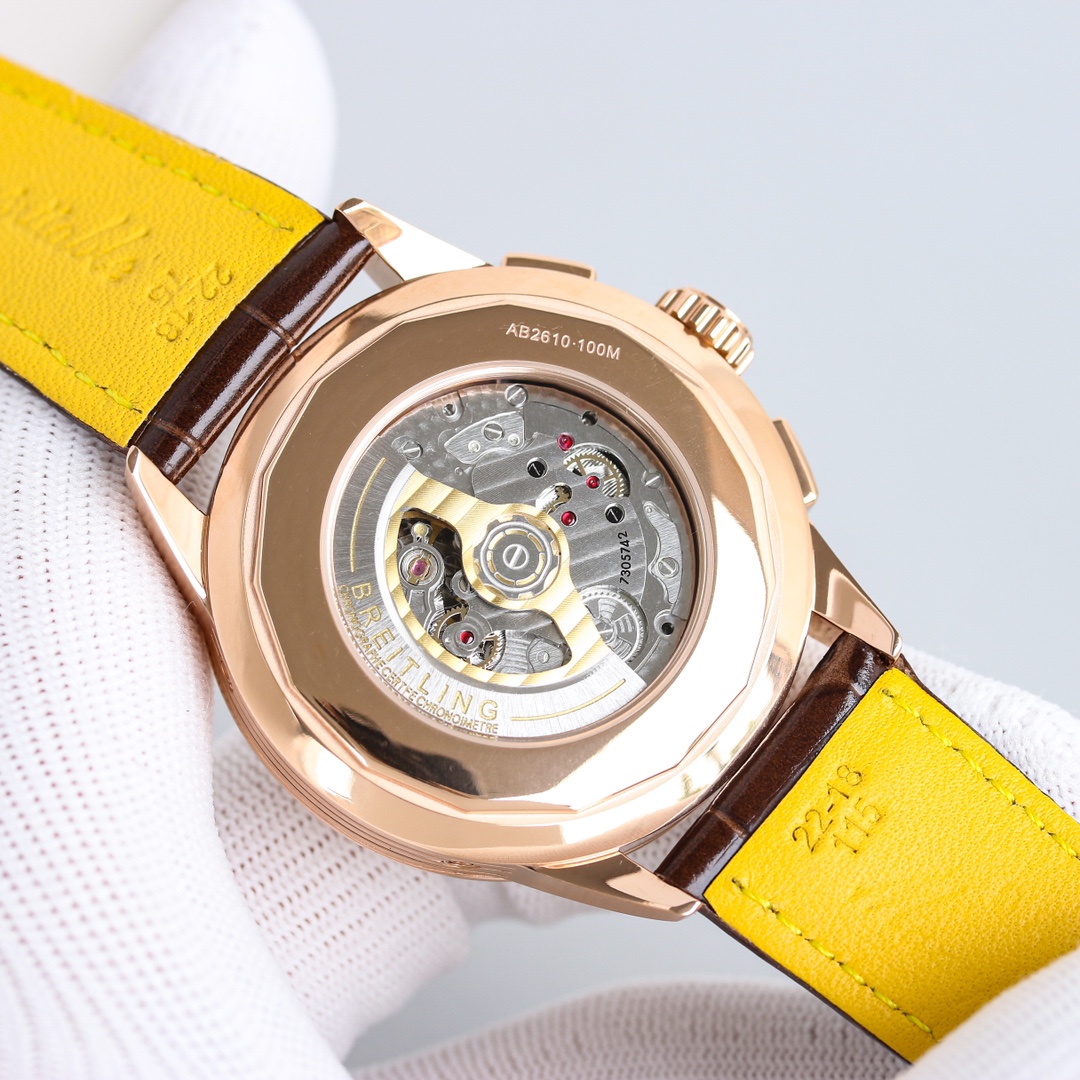 这款手表是AAAAA 1:1 质量 (非常棒). 使用了和原版一模一样的材料. 商标部分也保持了和Breitling一样. 图片拍摄是实物手表拍摄, 您所收到的实物保证和我们图片一模一样.