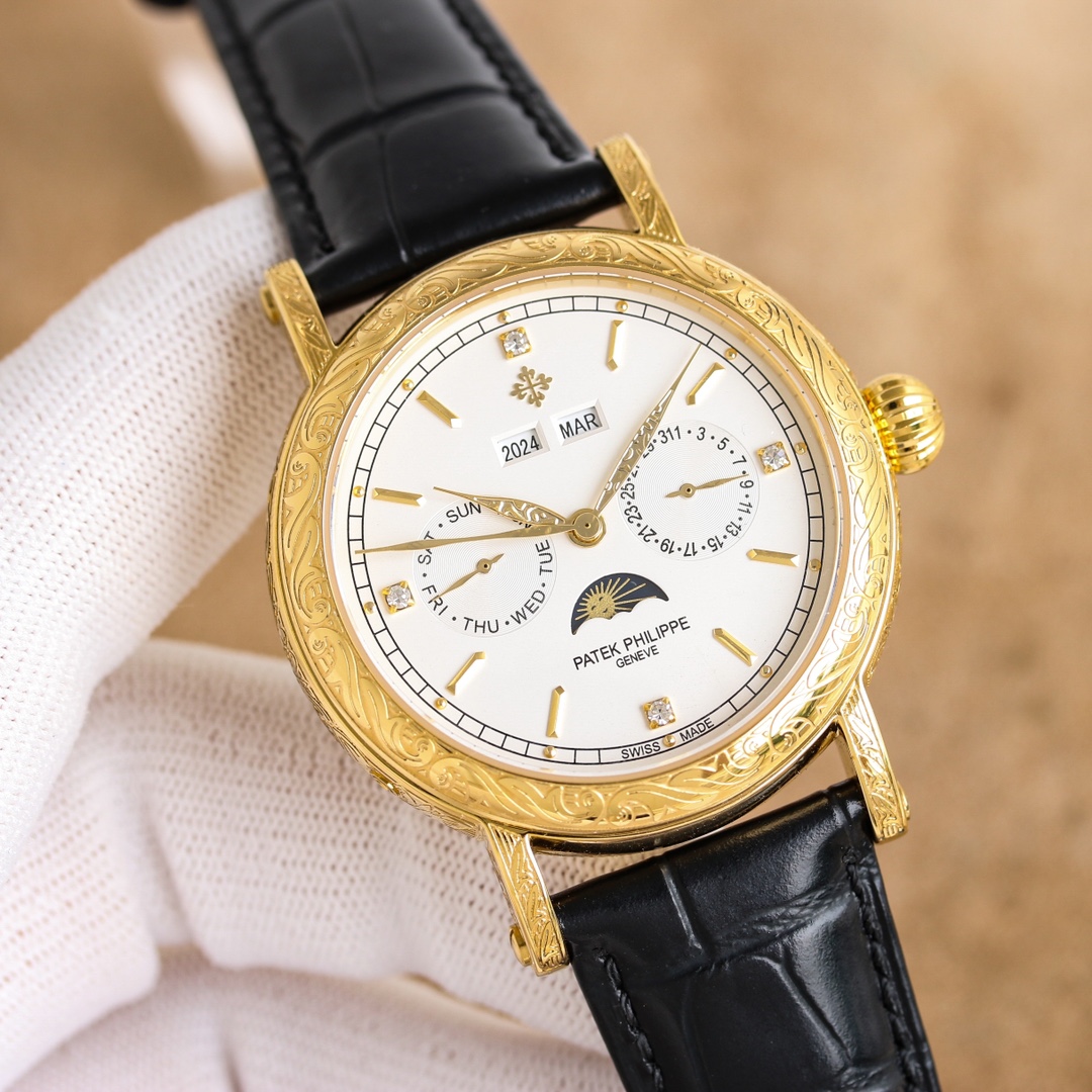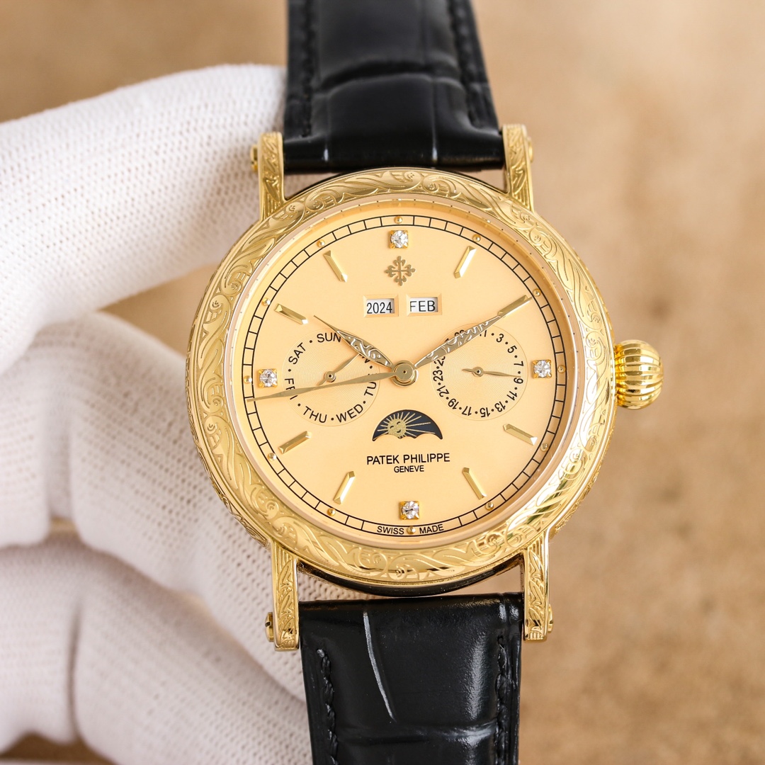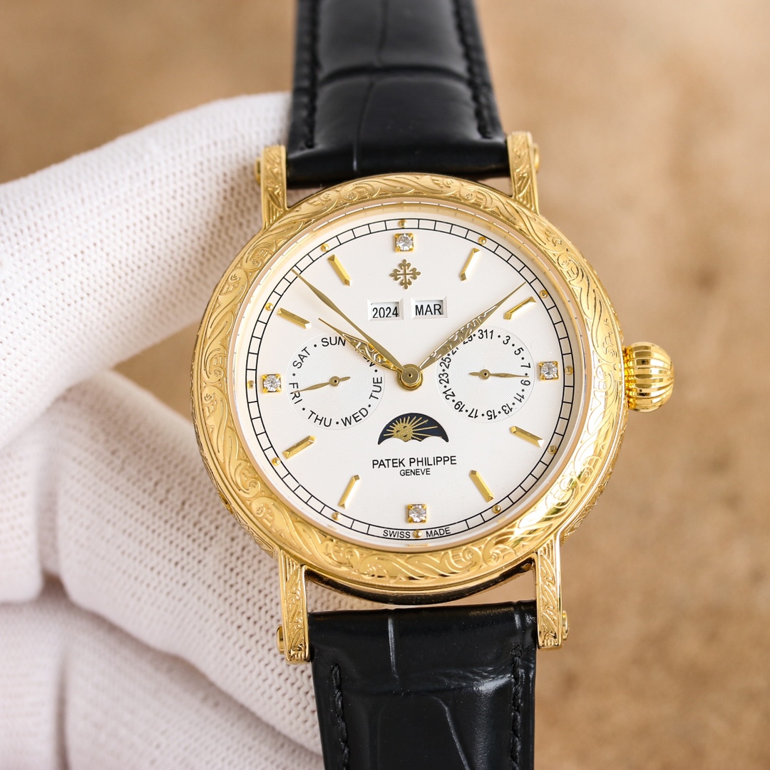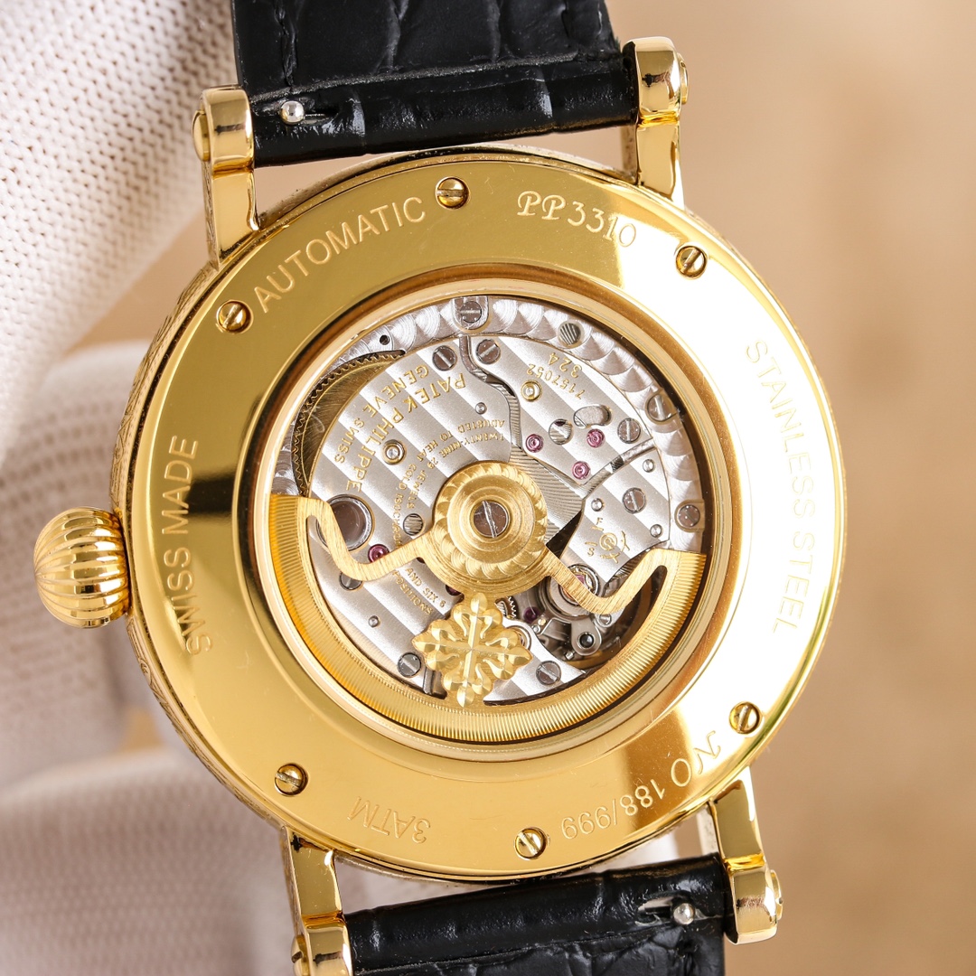 这款手表是AAAAA 1:1 质量 (非常棒). 使用了和原版一模一样的材料. 商标部分也保持了和百达翡丽/Patek Philippe一样. 图片拍摄是实物手表拍摄, 您所收到的实物保证和我们图片一模一样.