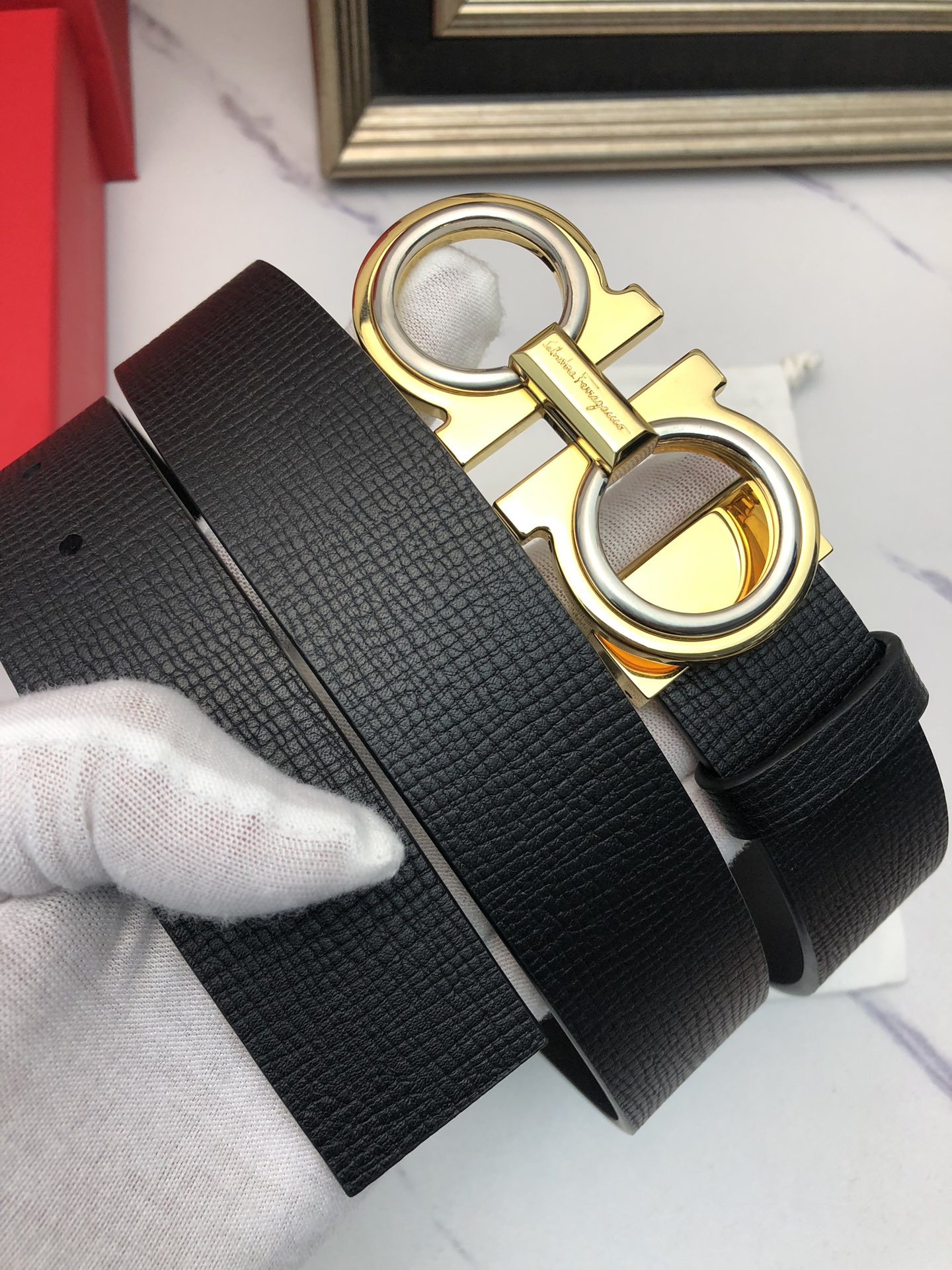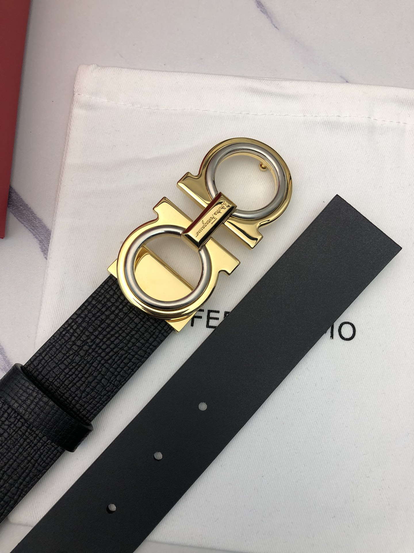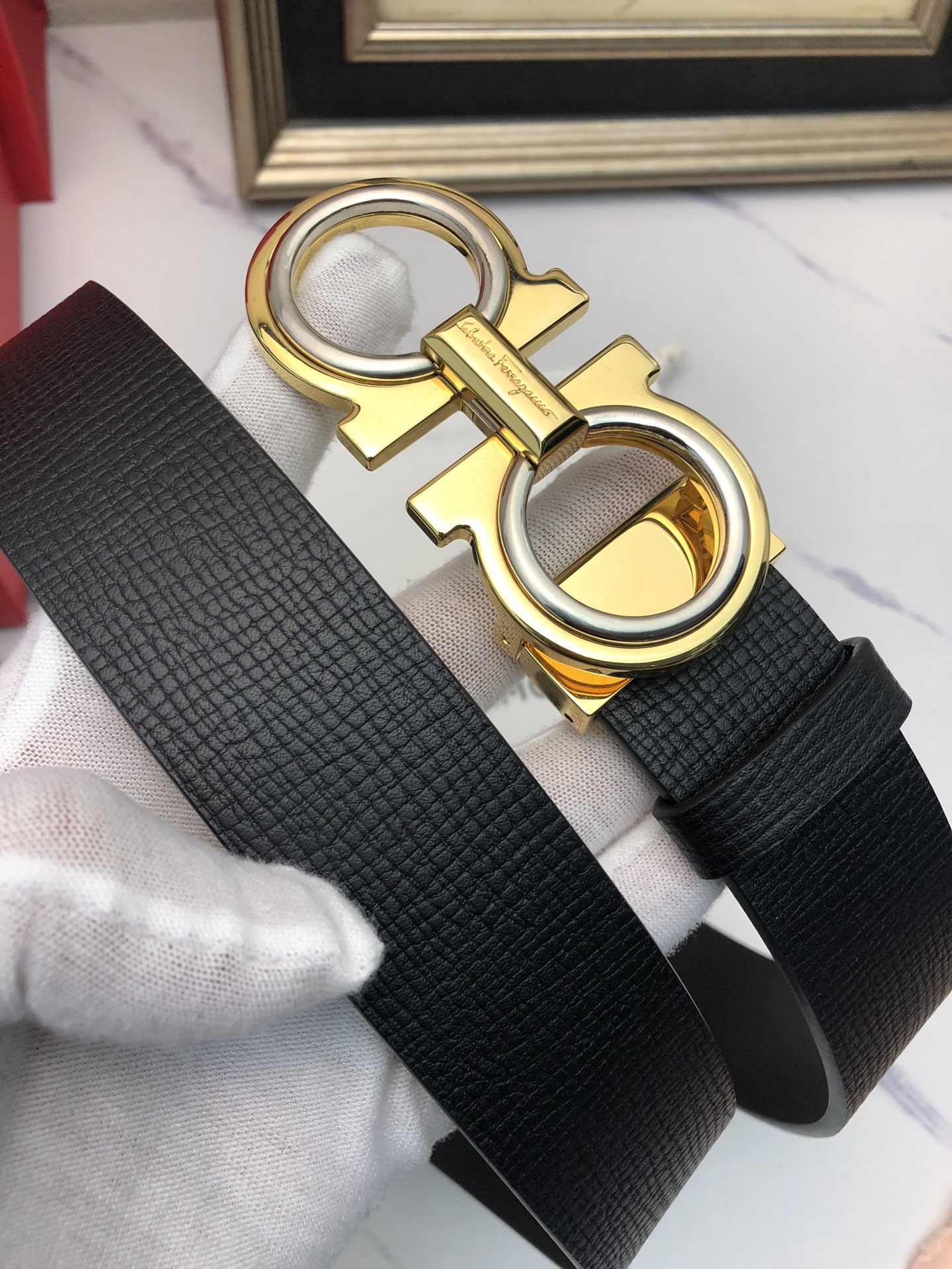 这款皮带是AAAAA 1:1 质量 (非常棒). 使用了和原版一模一样的材料. 商标部分也保持了和菲拉格慕/Salvatore Ferragamo一样. 图片拍摄是实物皮带拍摄, 您所收到的实物保证和我们图片一模一样.