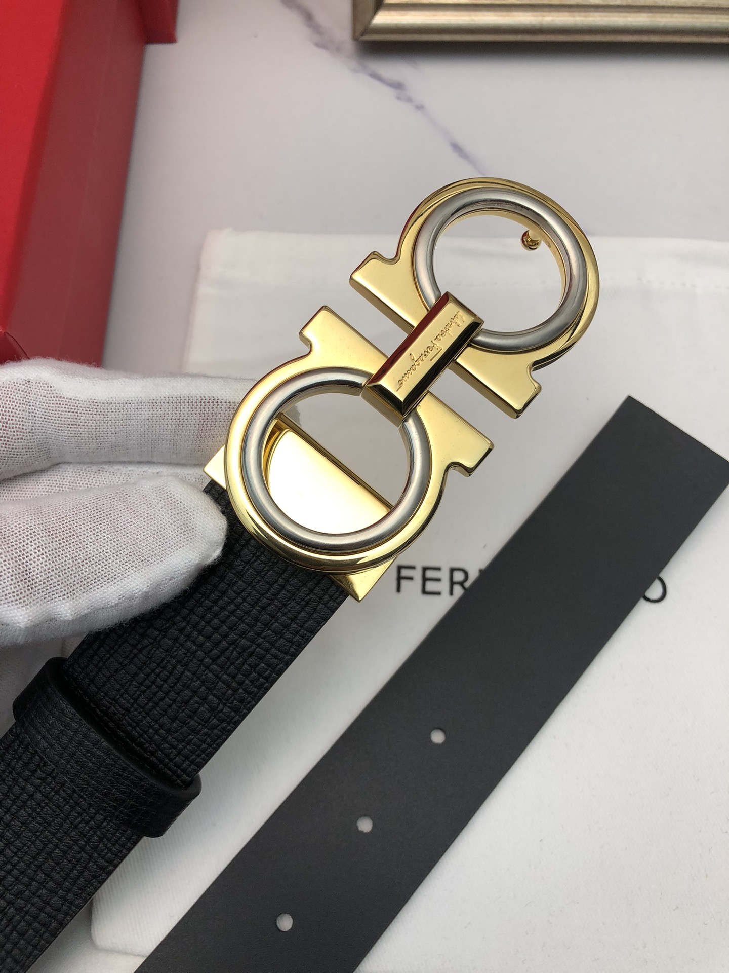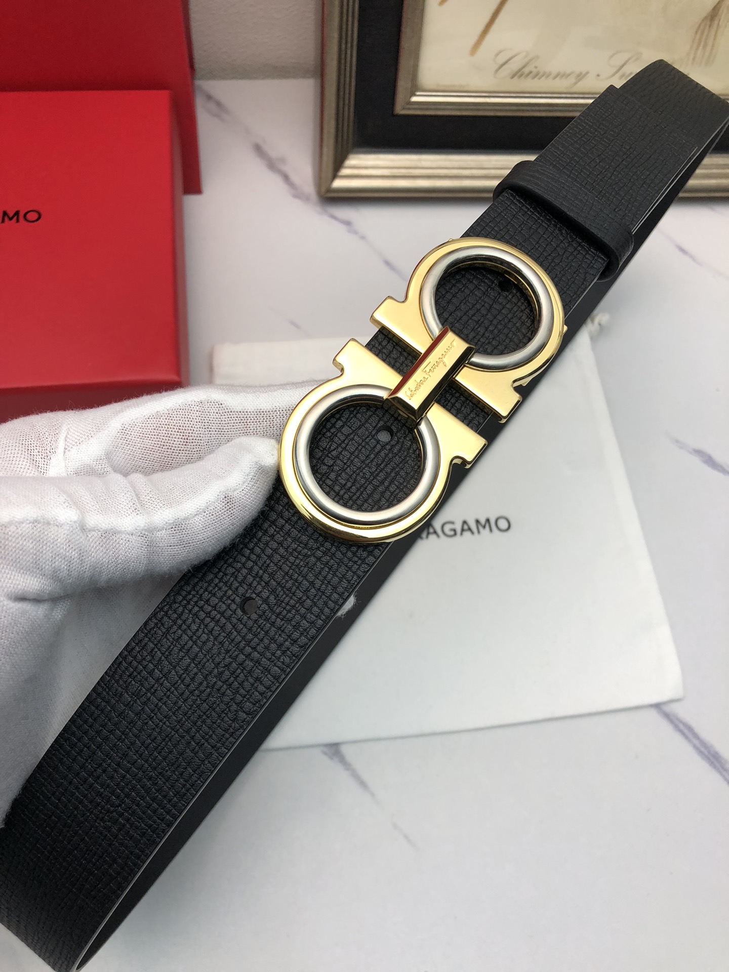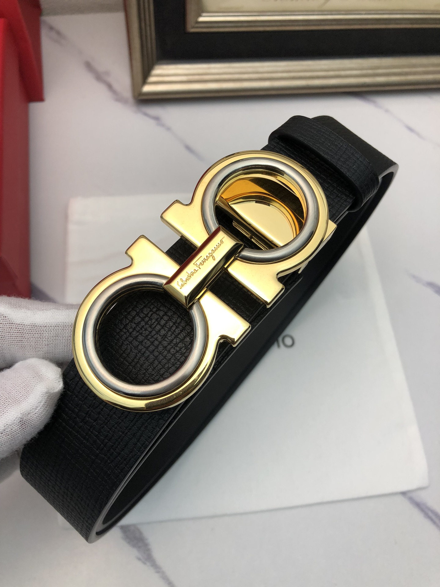 这款皮带是AAAAA 1:1 质量 (非常棒). 使用了和原版一模一样的材料. 商标部分也保持了和菲拉格慕/Salvatore Ferragamo一样. 图片拍摄是实物皮带拍摄, 您所收到的实物保证和我们图片一模一样.