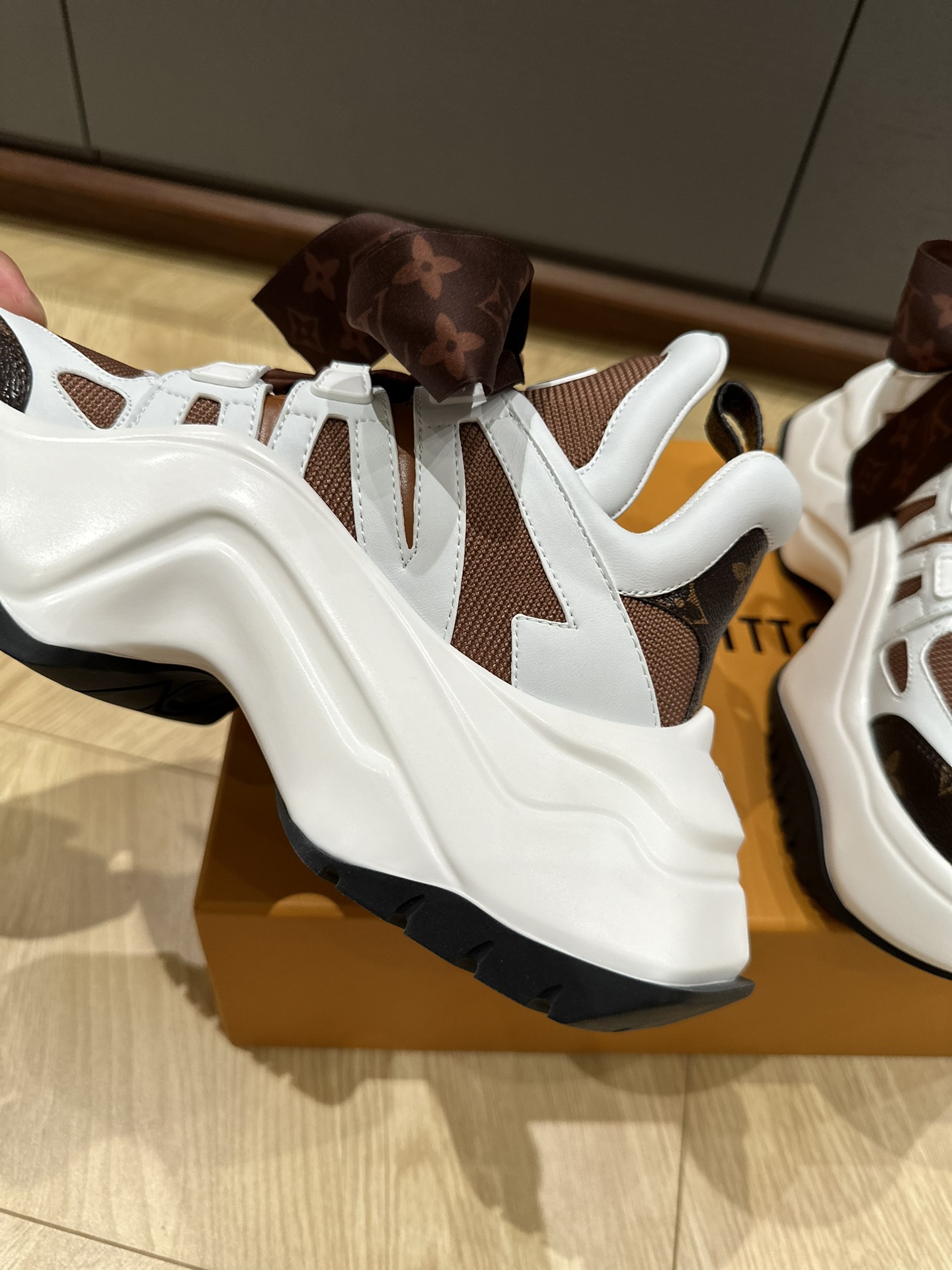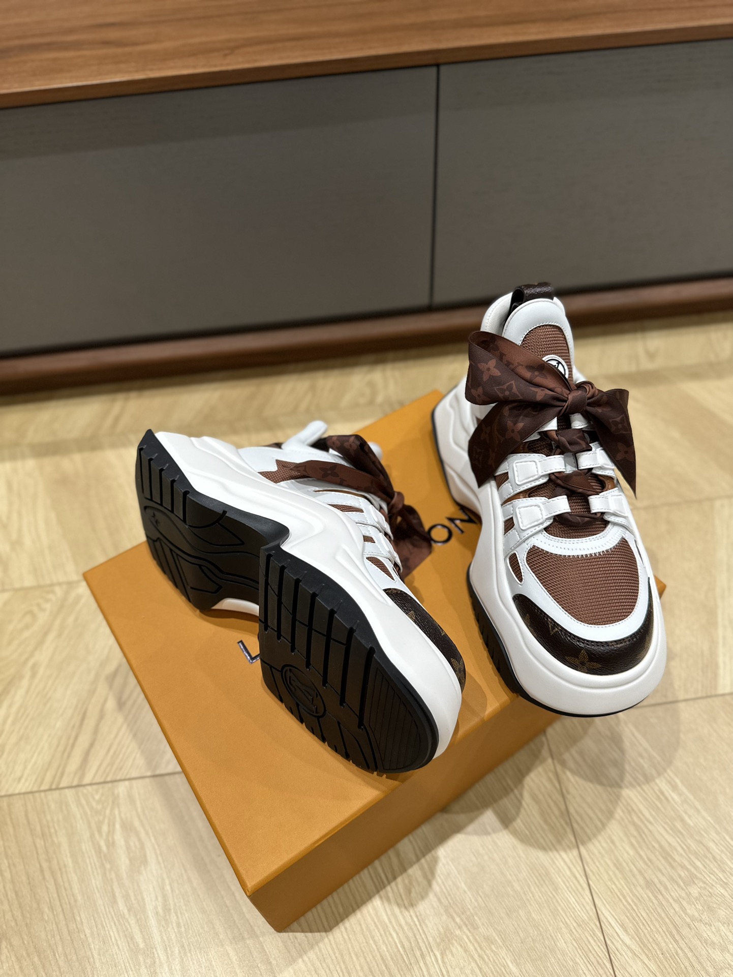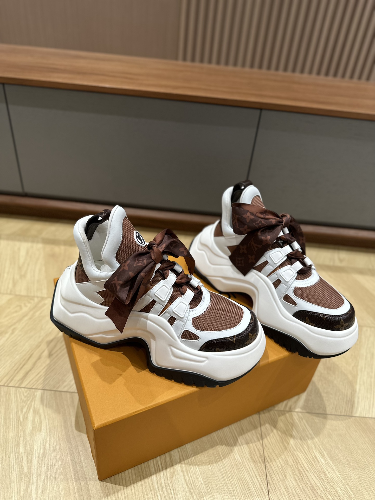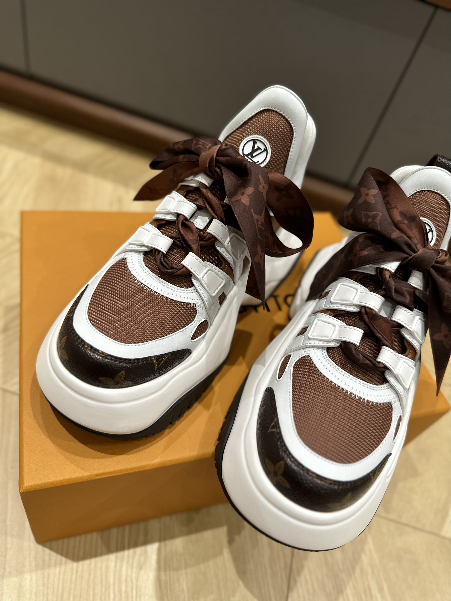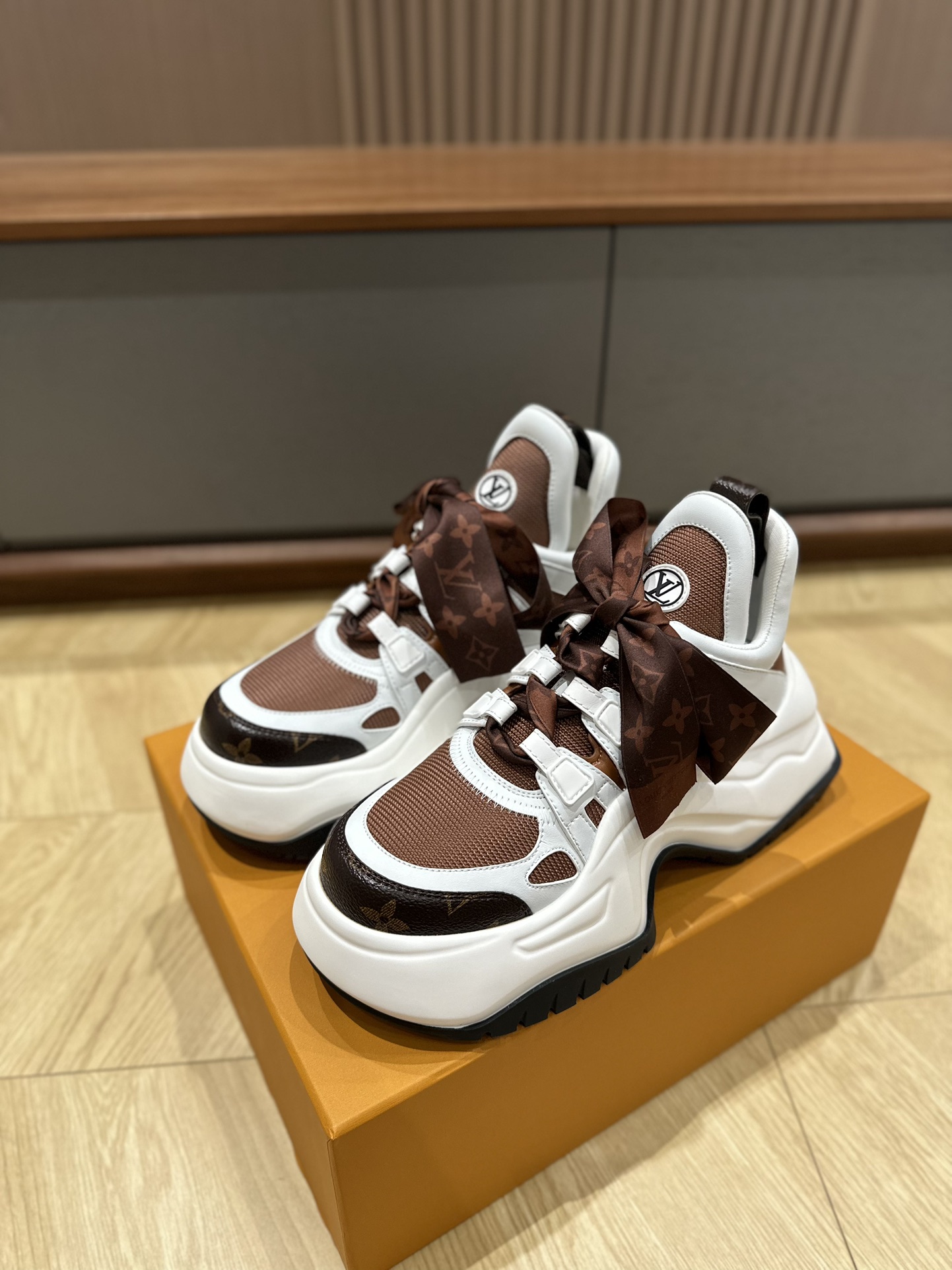 这款鞋子是AAAAA 1:1 质量 (非常棒). 使用了和原版一模一样的材料. 商标部分也保持了和路易威登/Louis Vuitton一样. 图片拍摄是实物鞋子拍摄, 您所收到的实物保证和我们图片一模一样.