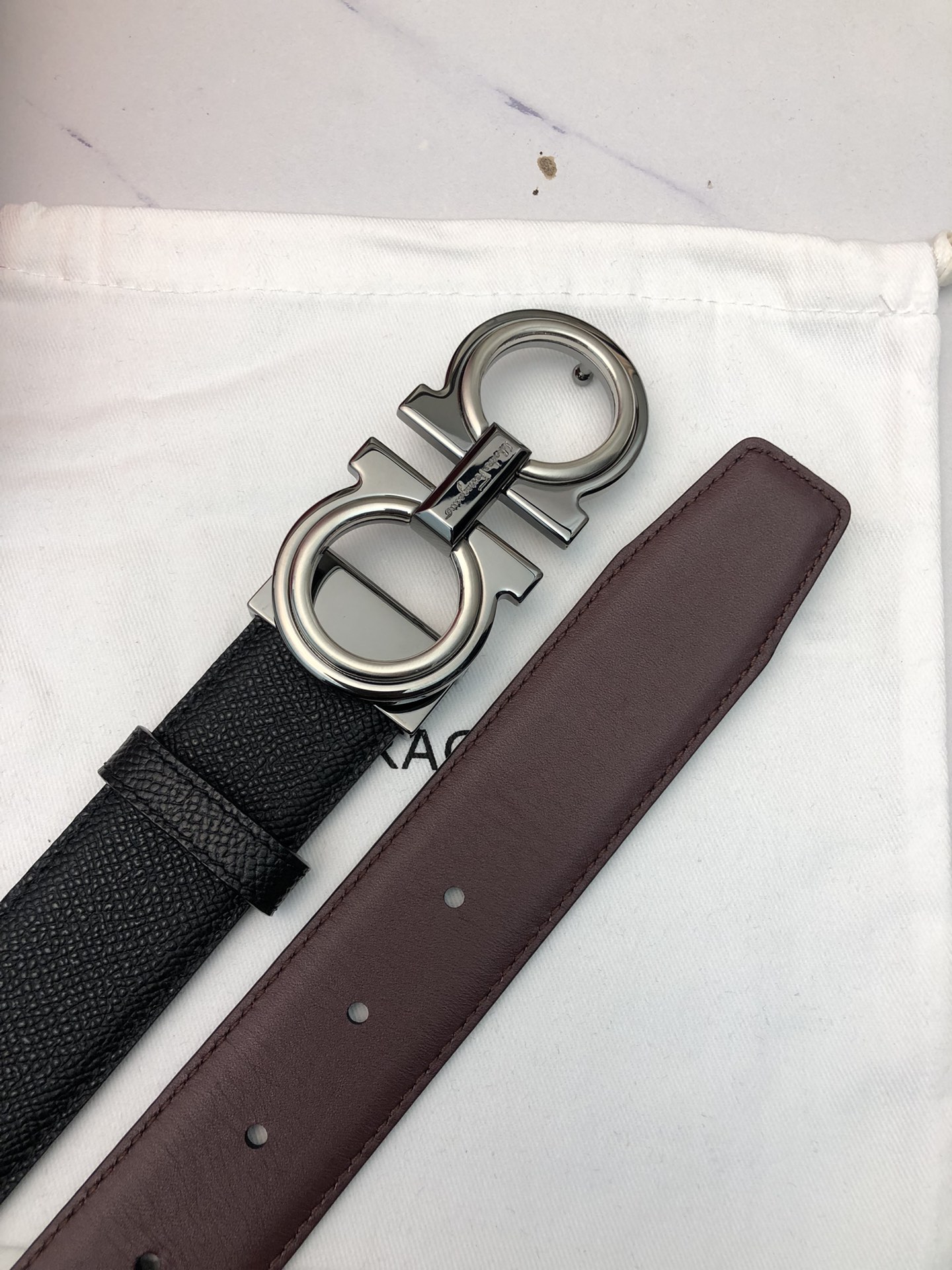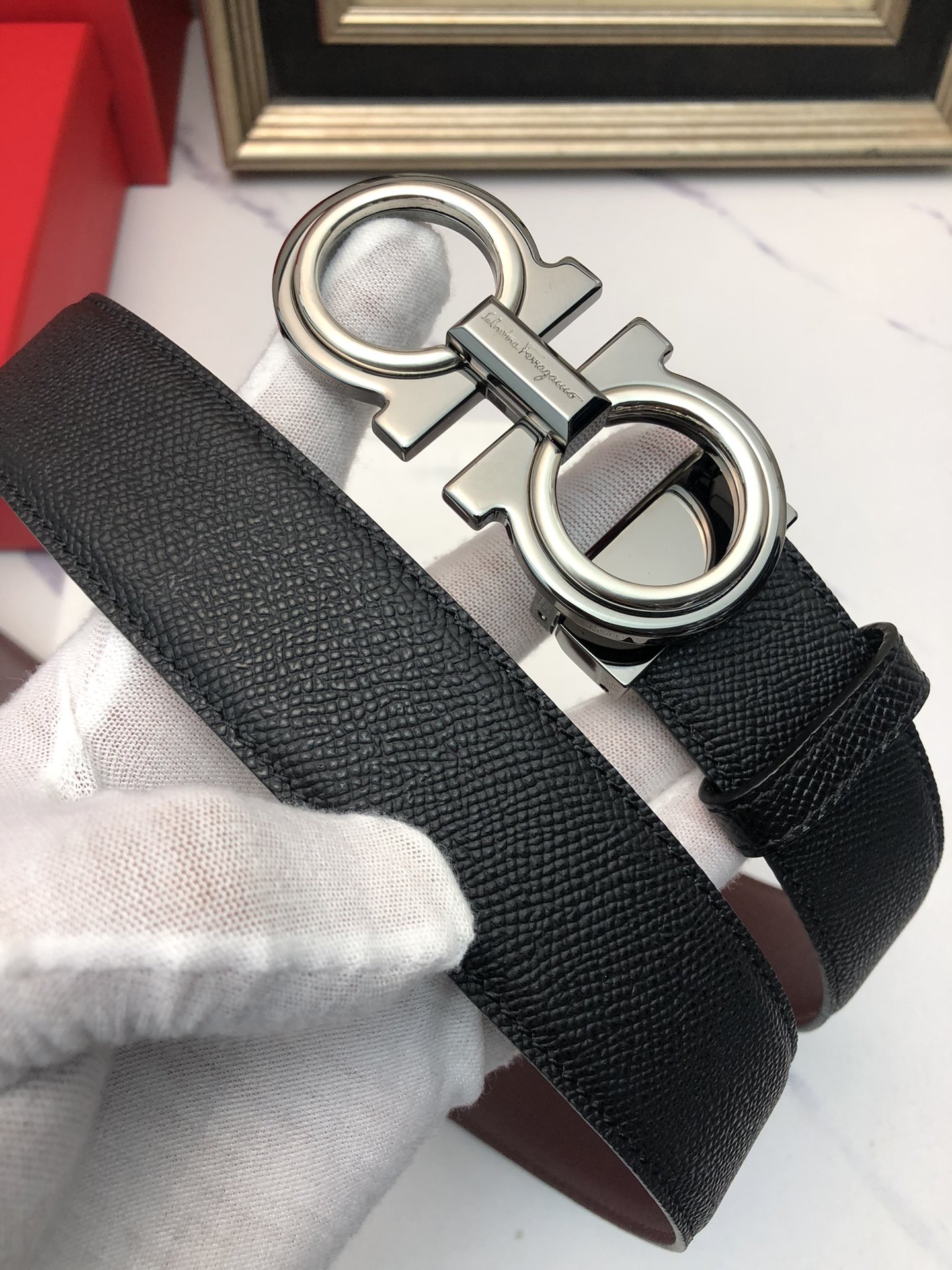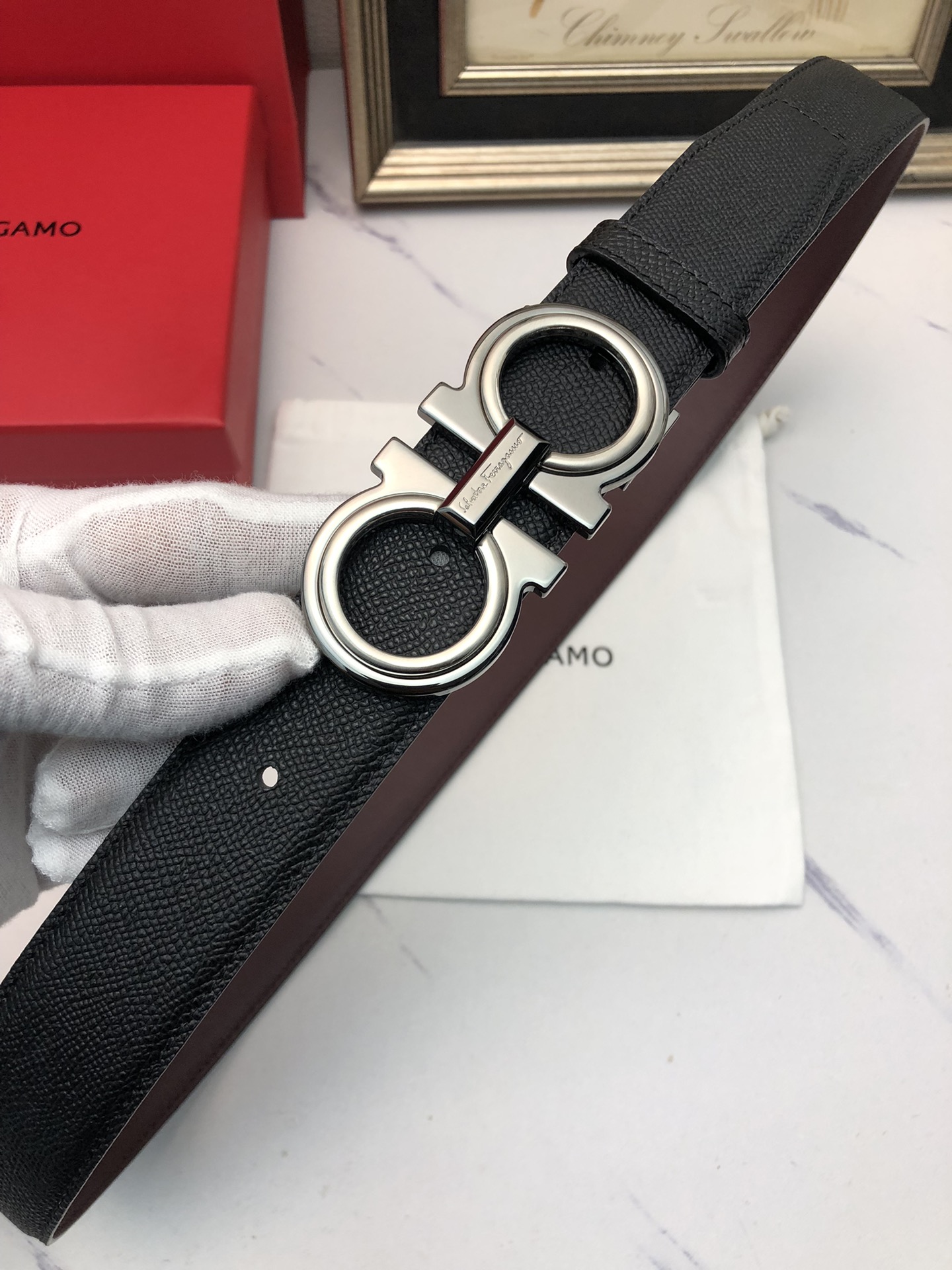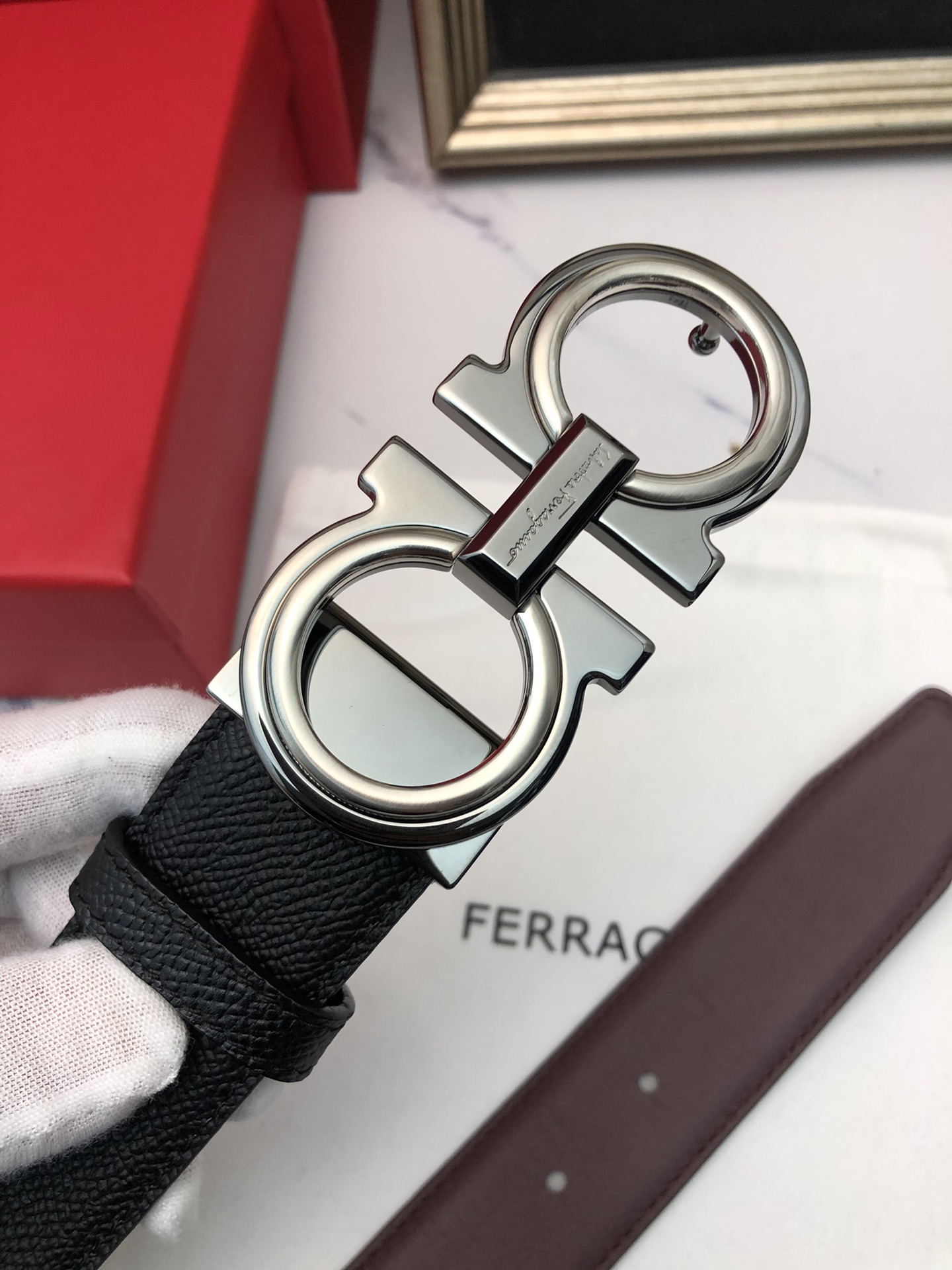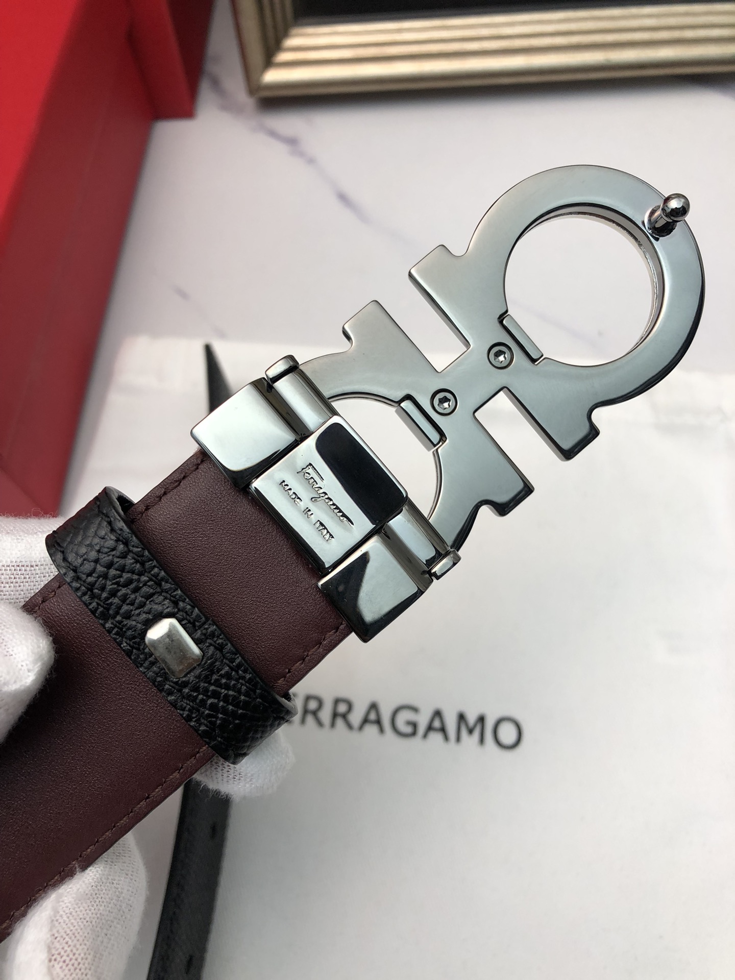 这款皮带是AAAAA 1:1 质量 (非常棒). 使用了和原版一模一样的材料. 商标部分也保持了和菲拉格慕/Salvatore Ferragamo一样. 图片拍摄是实物皮带拍摄, 您所收到的实物保证和我们图片一模一样.