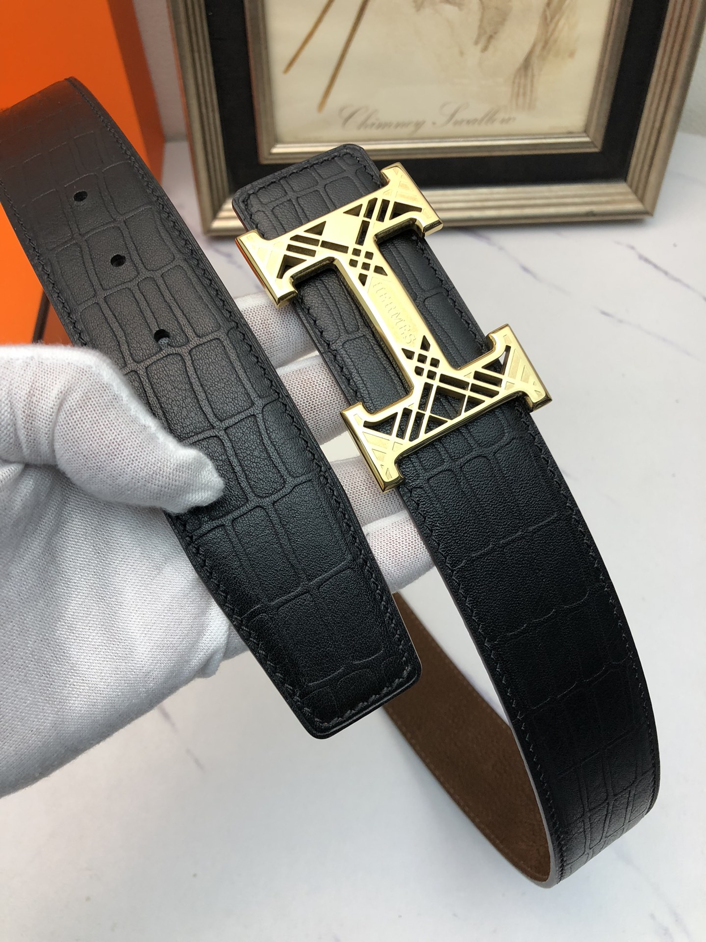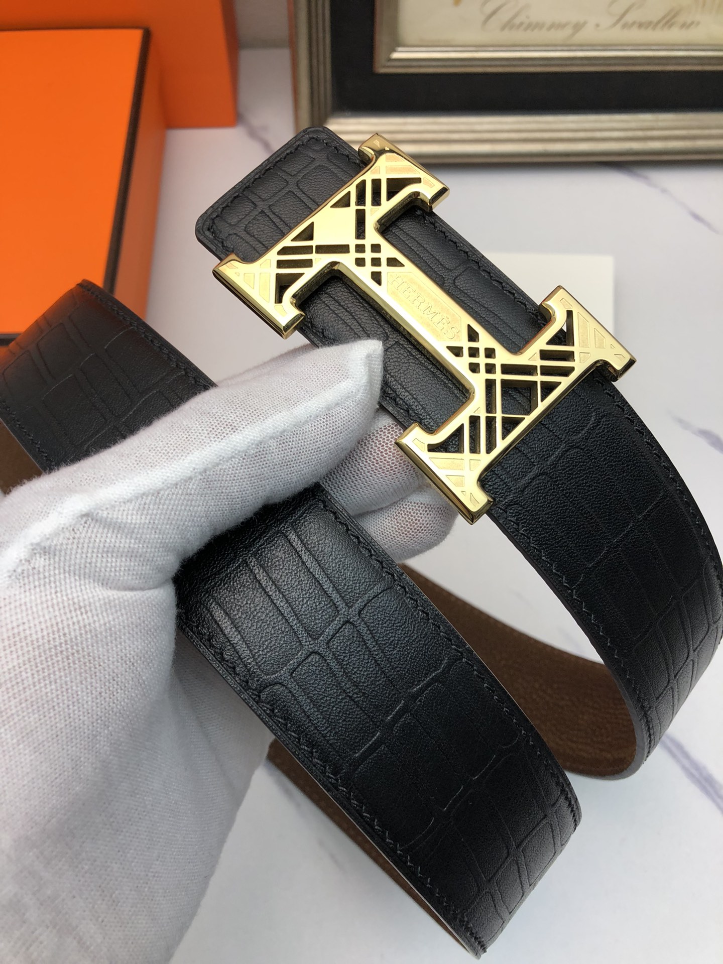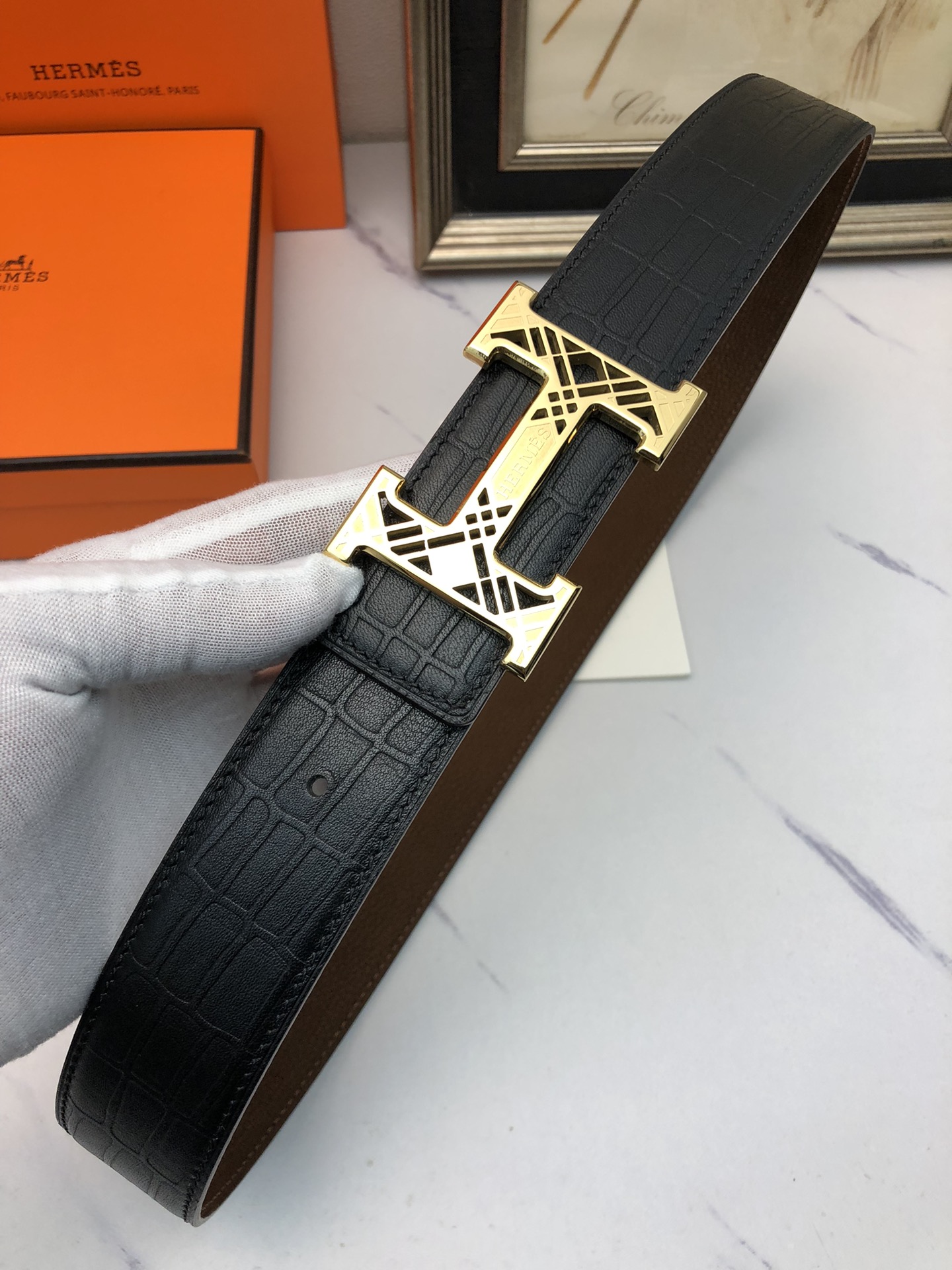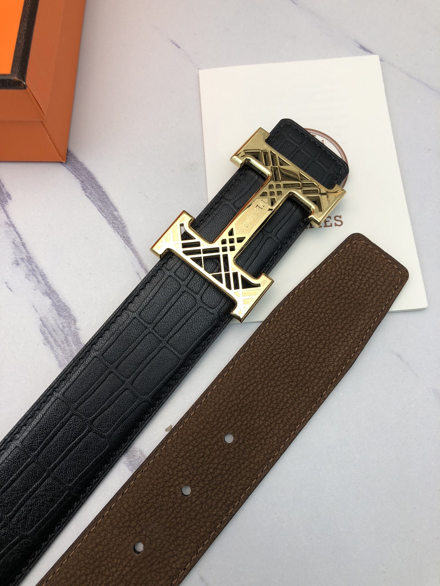 这款皮带是AAAAA 1:1 质量 (非常棒). 使用了和原版一模一样的材料. 商标部分也保持了和爱马仕/Hermes一样. 图片拍摄是实物皮带拍摄, 您所收到的实物保证和我们图片一模一样.