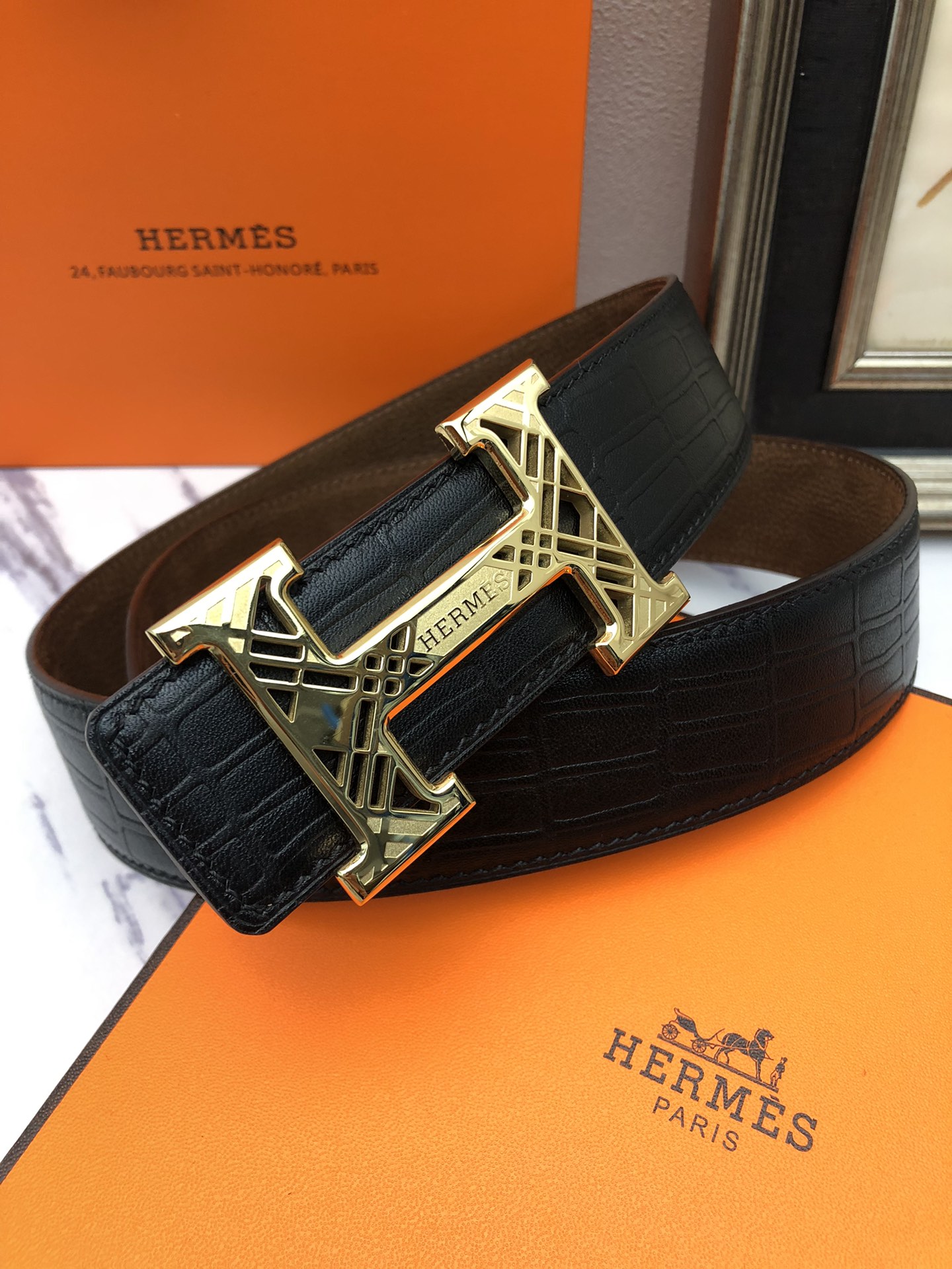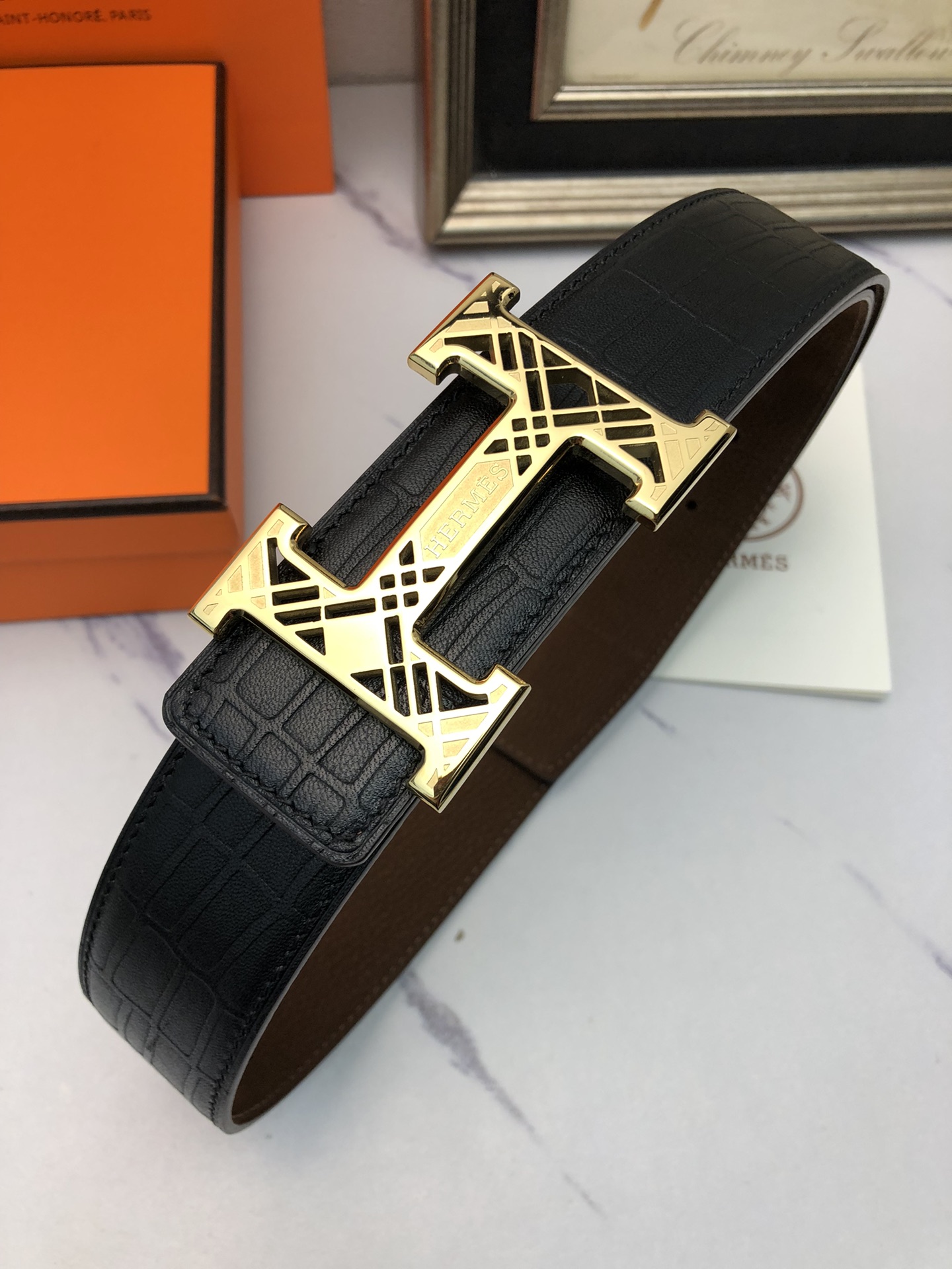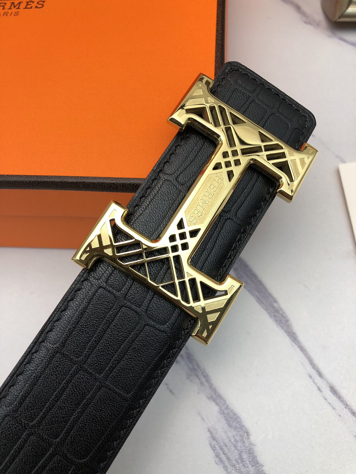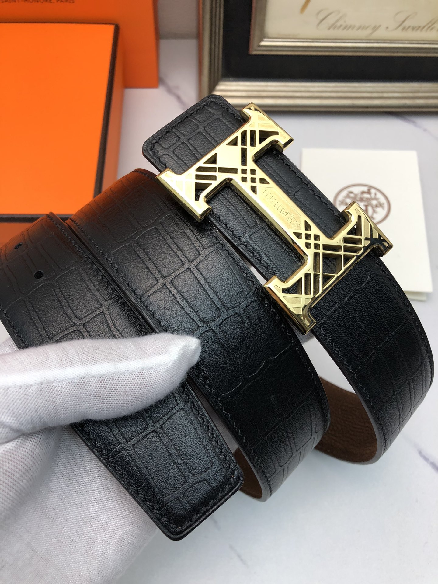 这款皮带是AAAAA 1:1 质量 (非常棒). 使用了和原版一模一样的材料. 商标部分也保持了和爱马仕/Hermes一样. 图片拍摄是实物皮带拍摄, 您所收到的实物保证和我们图片一模一样.