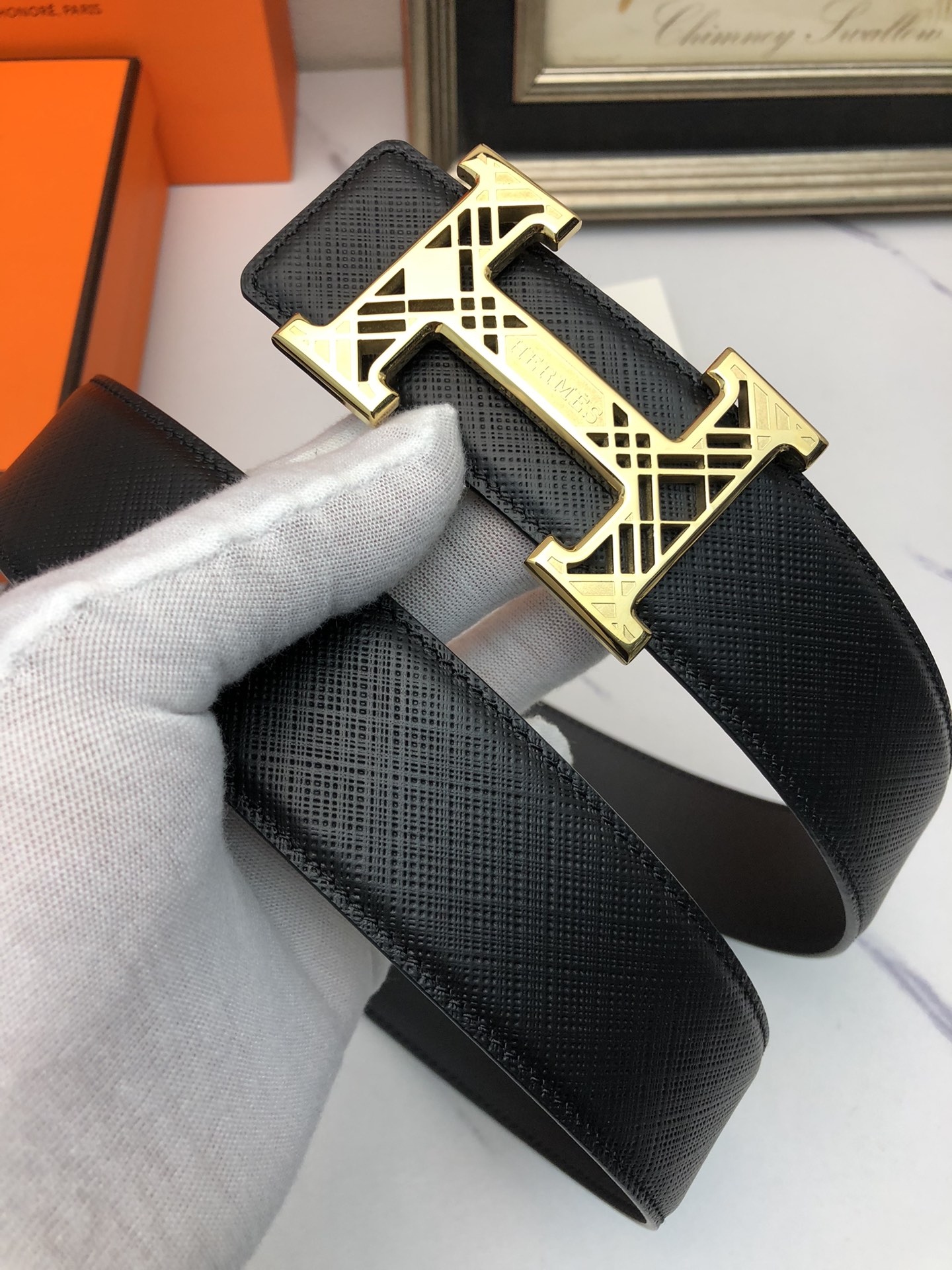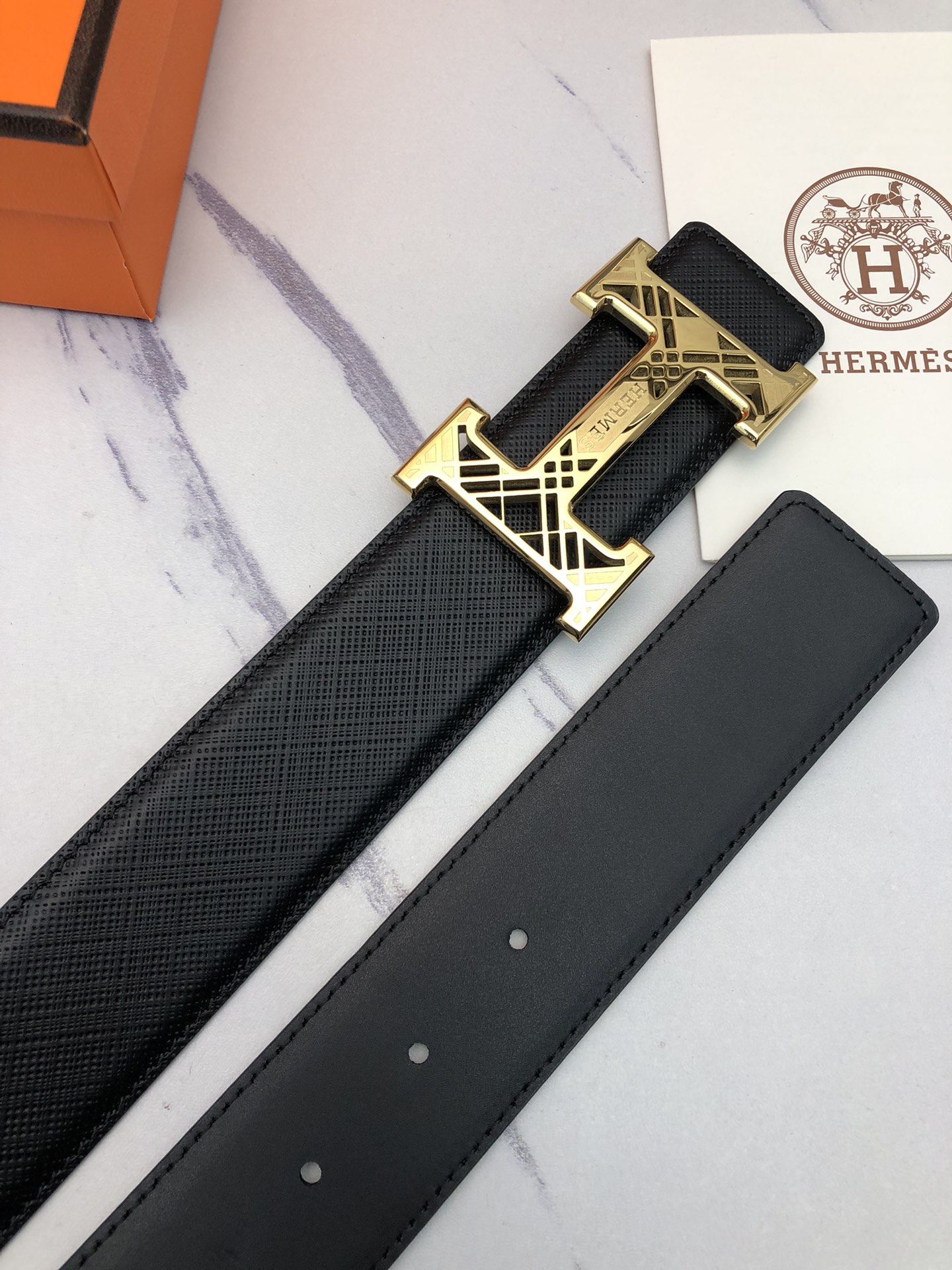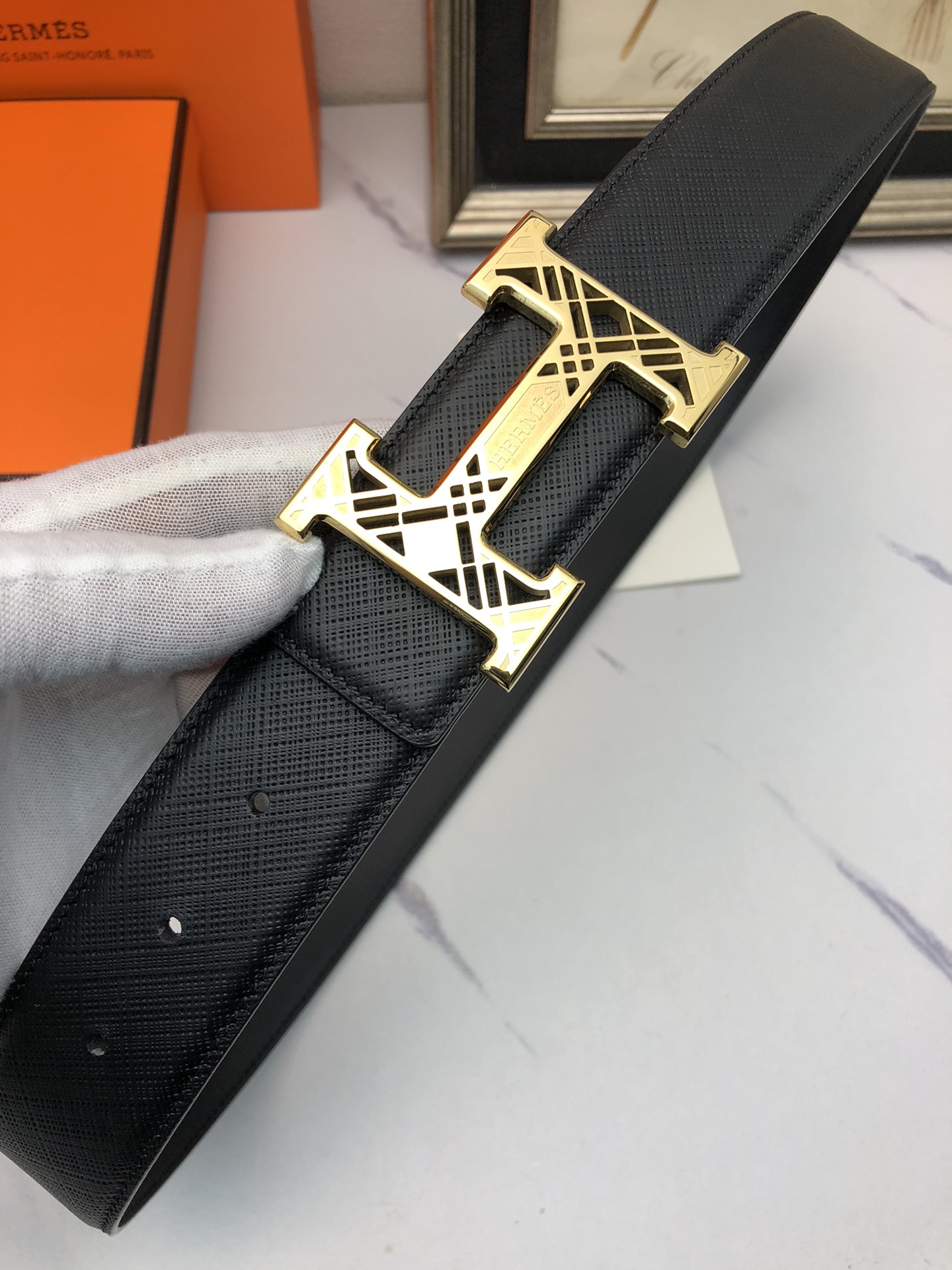 这款皮带是AAAAA 1:1 质量 (非常棒). 使用了和原版一模一样的材料. 商标部分也保持了和爱马仕/Hermes一样. 图片拍摄是实物皮带拍摄, 您所收到的实物保证和我们图片一模一样.