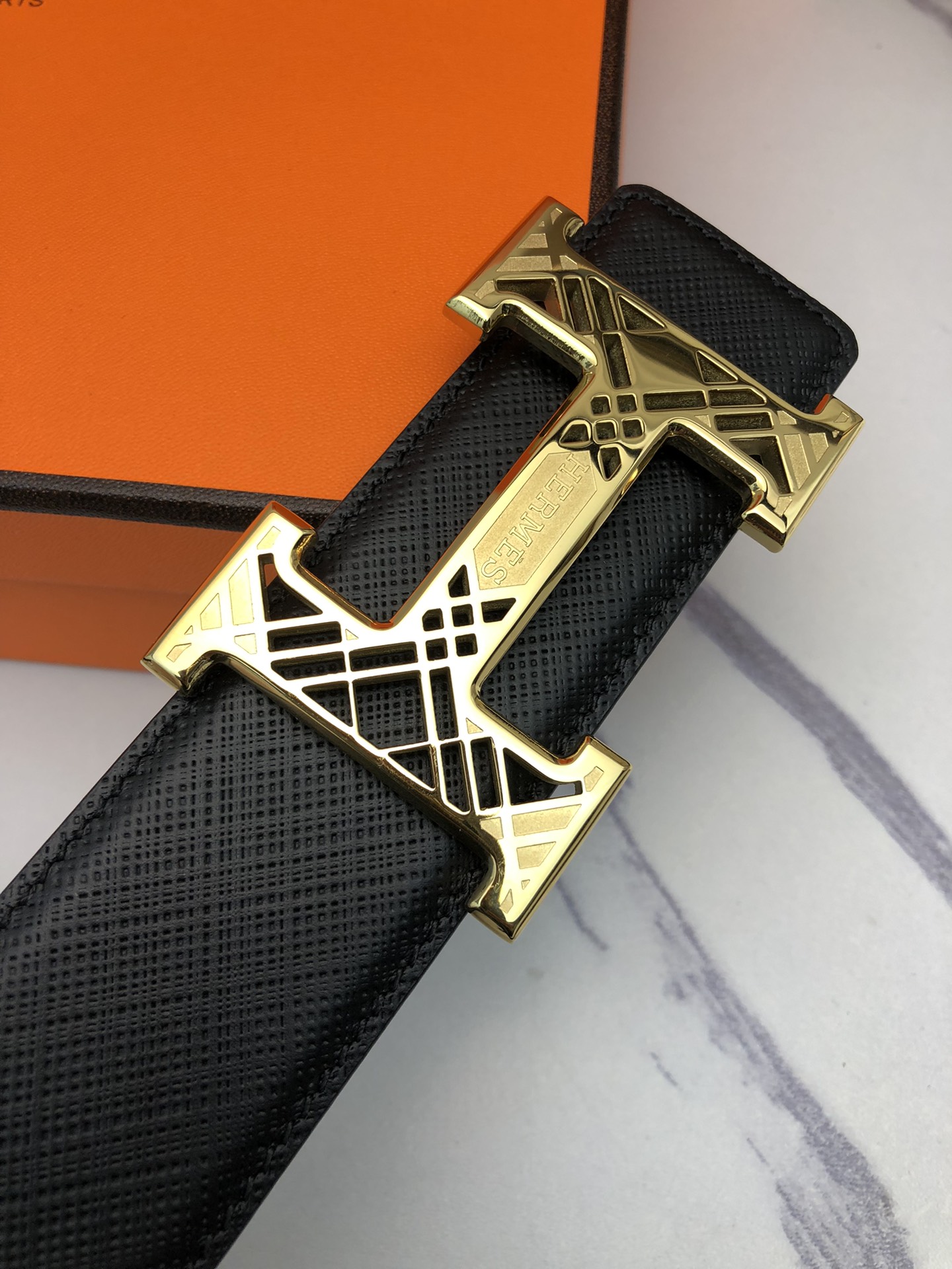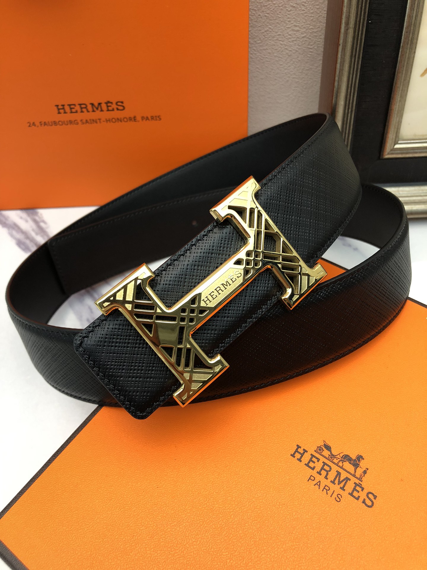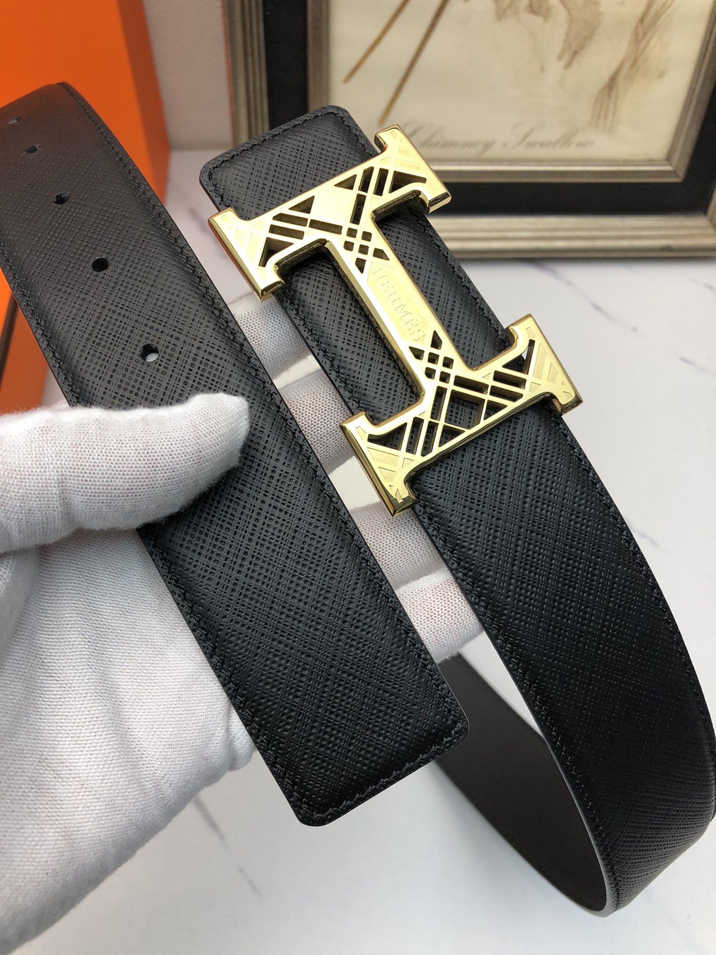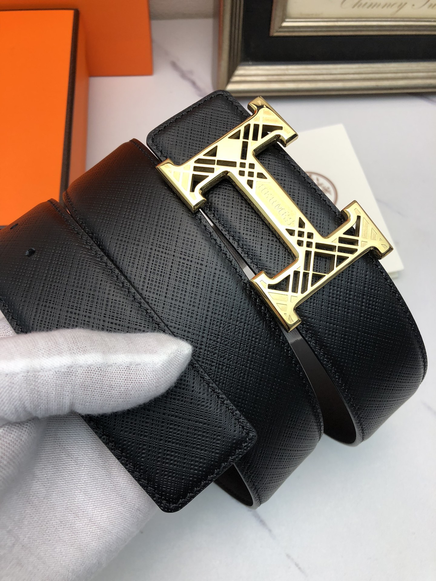 这款皮带是AAAAA 1:1 质量 (非常棒). 使用了和原版一模一样的材料. 商标部分也保持了和爱马仕/Hermes一样. 图片拍摄是实物皮带拍摄, 您所收到的实物保证和我们图片一模一样.