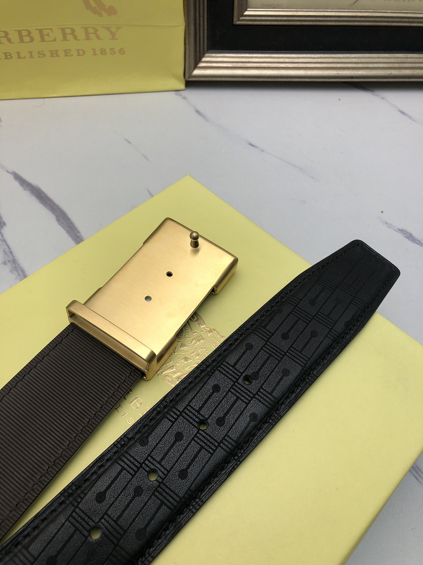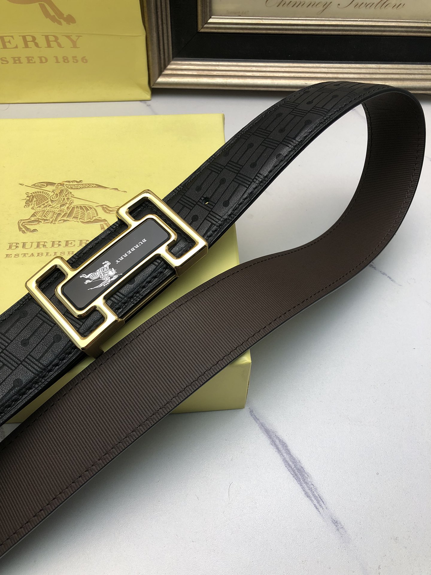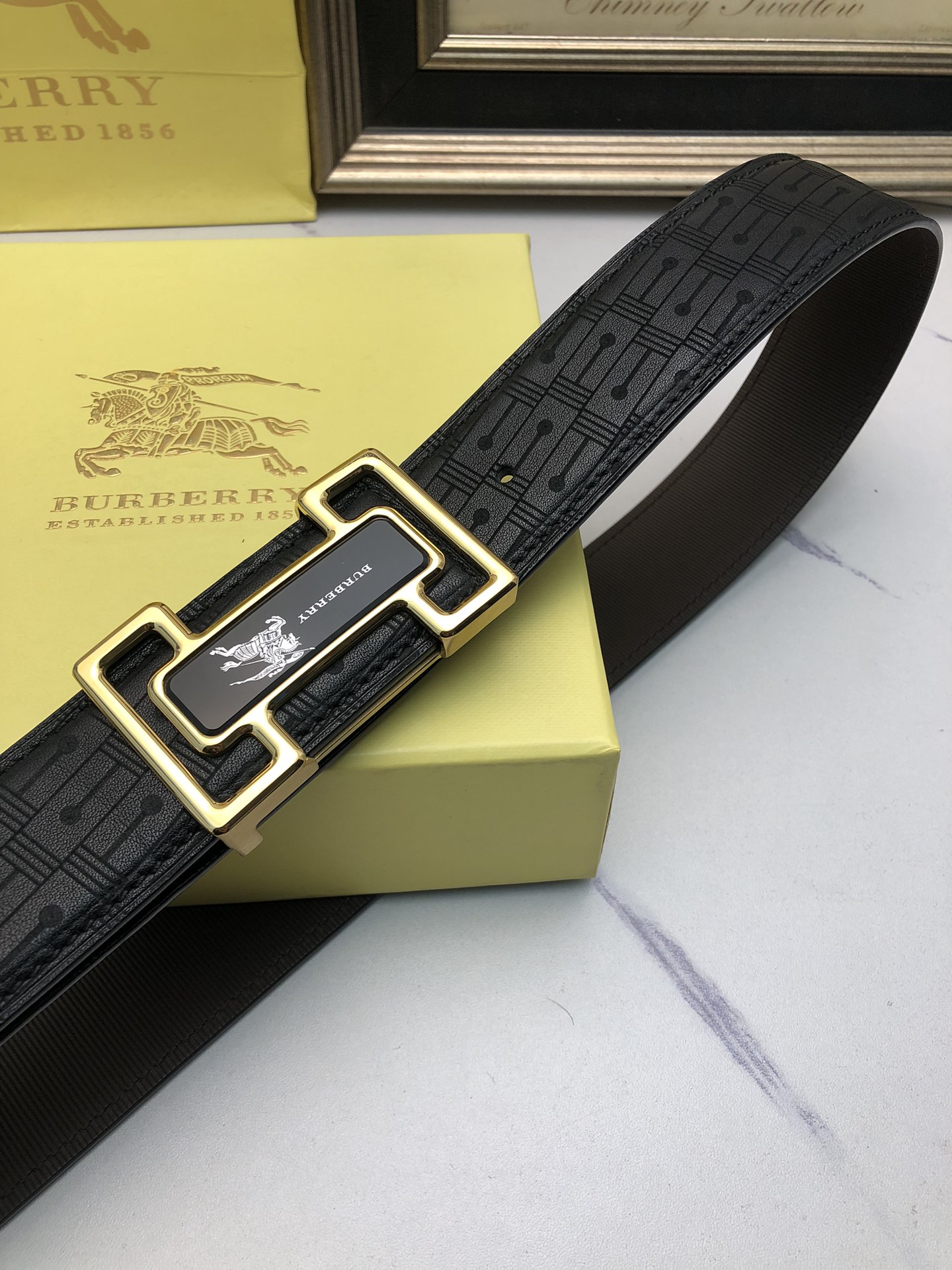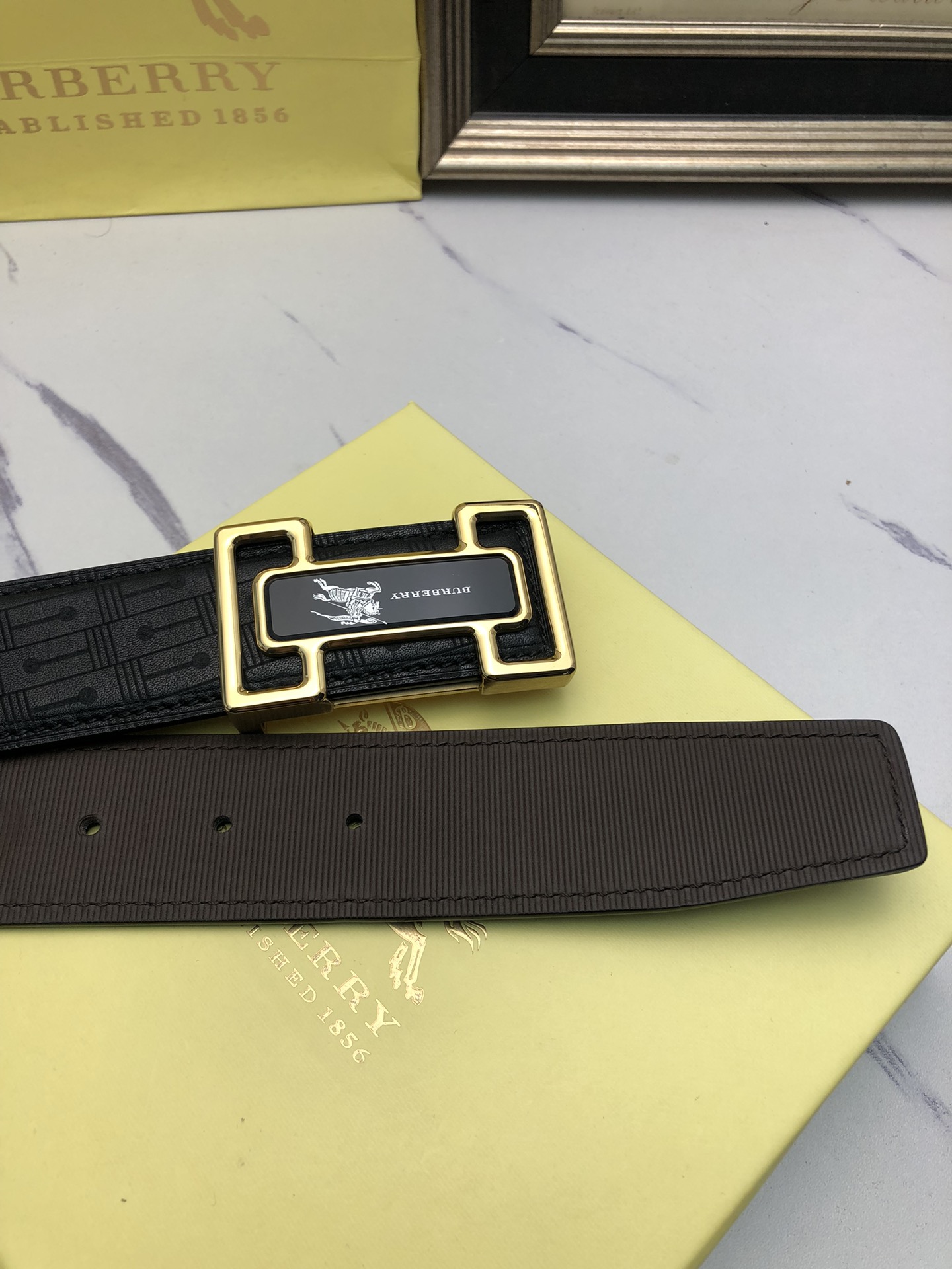 这款皮带是AAAAA 1:1 质量 (非常棒). 使用了和原版一模一样的材料. 商标部分也保持了和巴宝莉/Burberry一样. 图片拍摄是实物皮带拍摄, 您所收到的实物保证和我们图片一模一样.