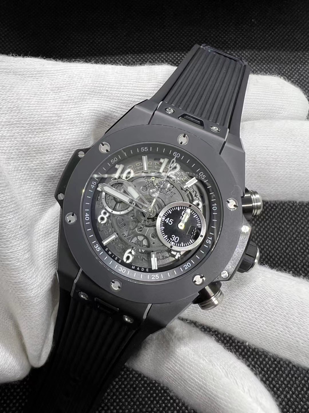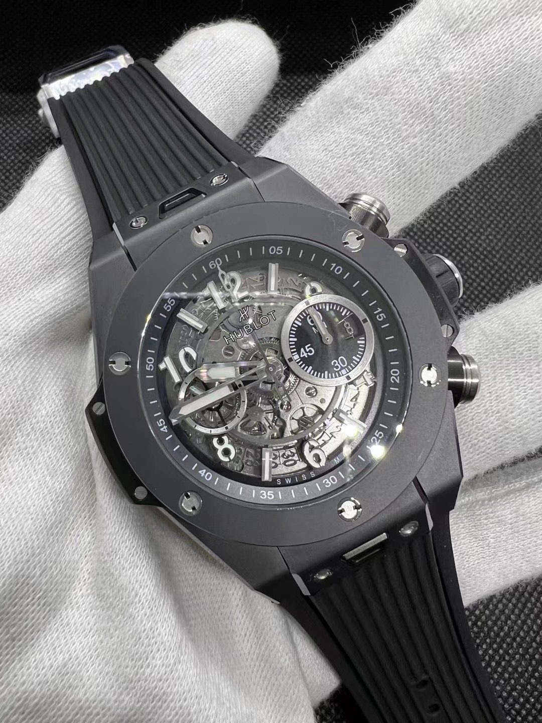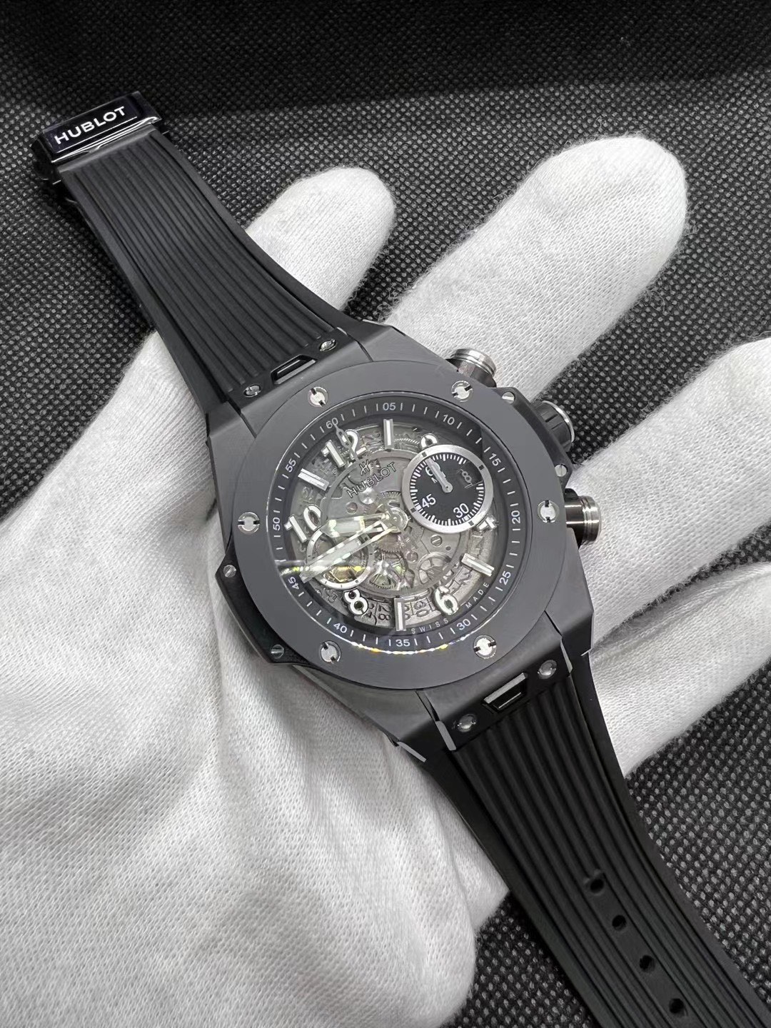 这款手表是AAAAA 1:1 质量 (非常棒). 使用了和原版一模一样的材料. 商标部分也保持了和Hublot一样. 图片拍摄是实物手表拍摄, 您所收到的实物保证和我们图片一模一样.