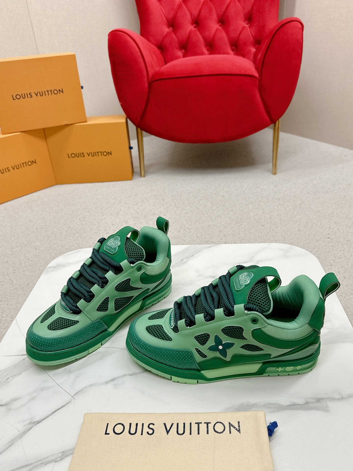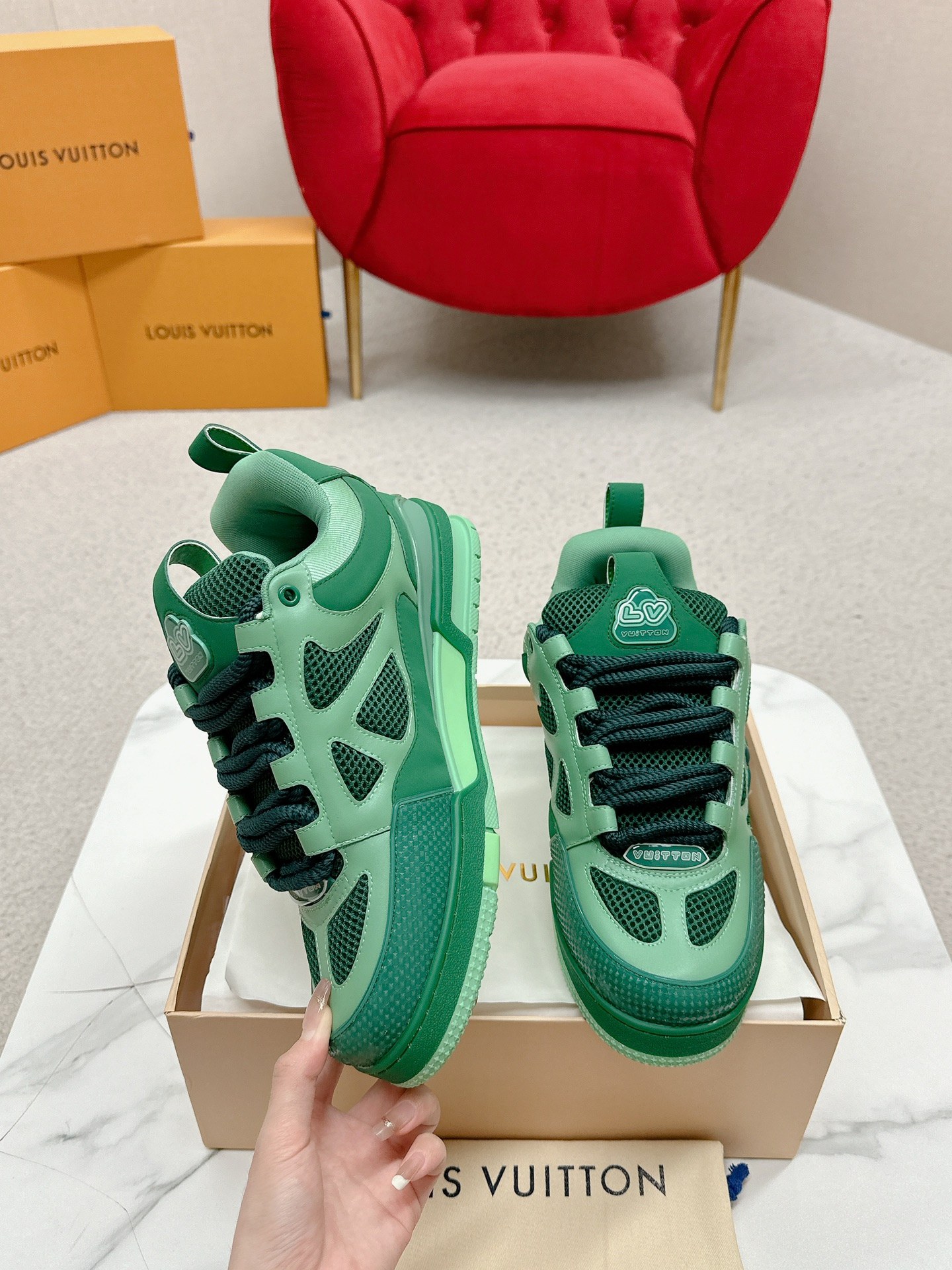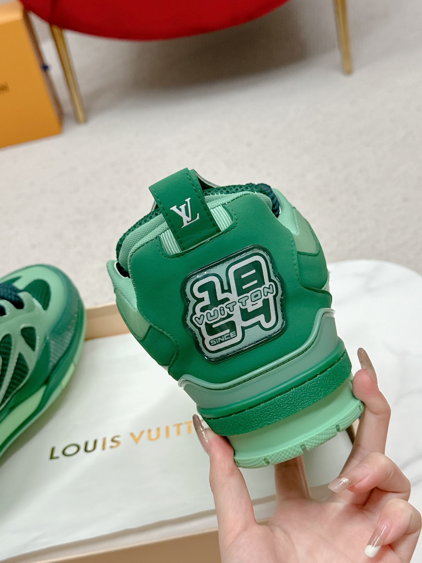 这款鞋子是AAAAA 1:1 质量 (非常棒). 使用了和原版一模一样的材料. 商标部分也保持了和路易威登/Louis Vuitton一样. 图片拍摄是实物鞋子拍摄, 您所收到的实物保证和我们图片一模一样.