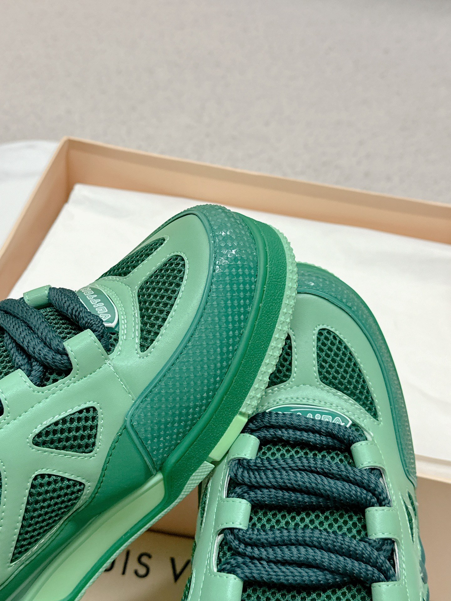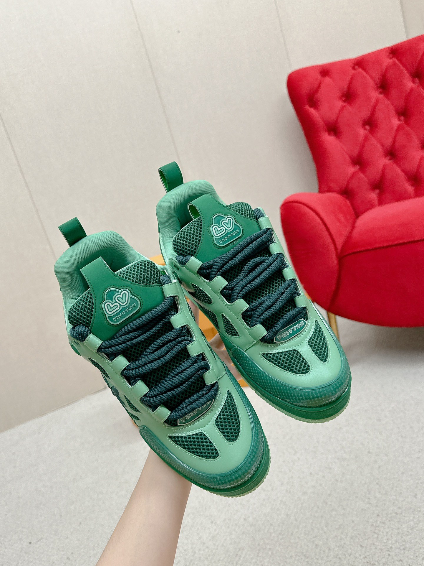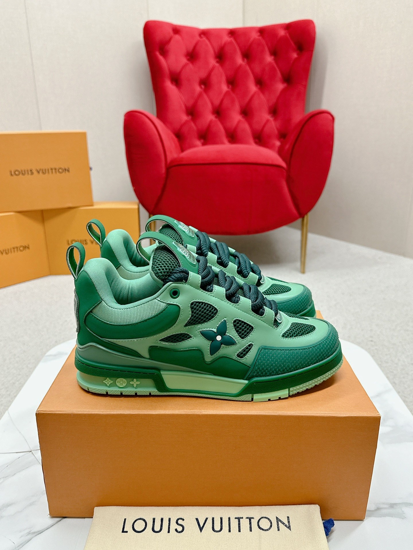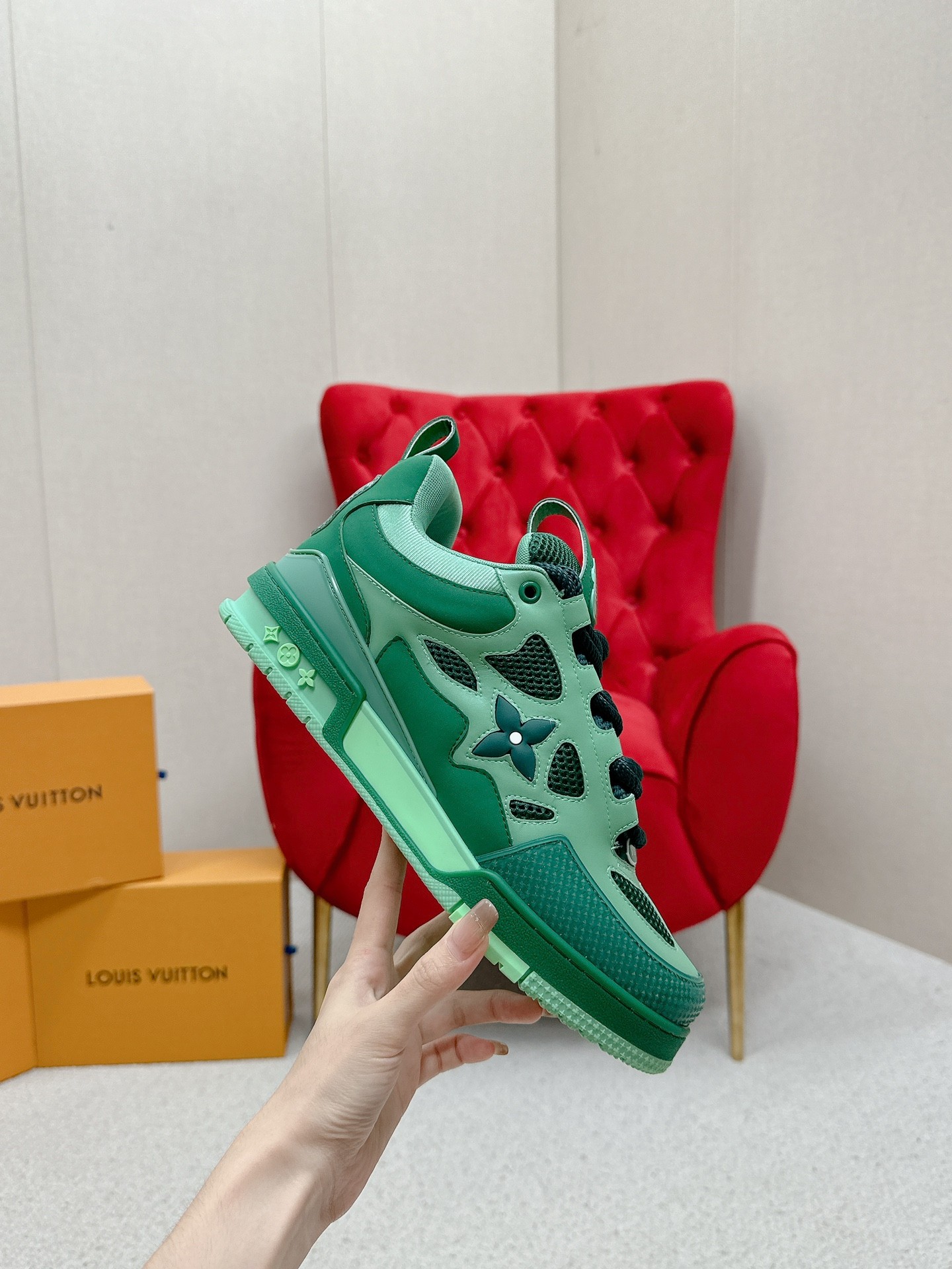 这款鞋子是AAAAA 1:1 质量 (非常棒). 使用了和原版一模一样的材料. 商标部分也保持了和路易威登/Louis Vuitton一样. 图片拍摄是实物鞋子拍摄, 您所收到的实物保证和我们图片一模一样.