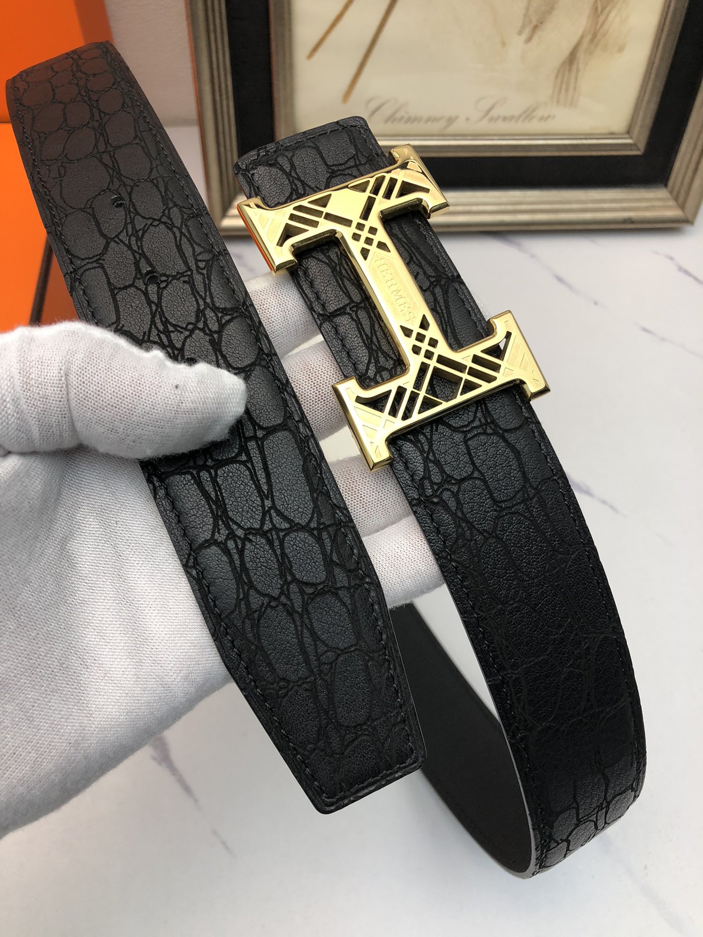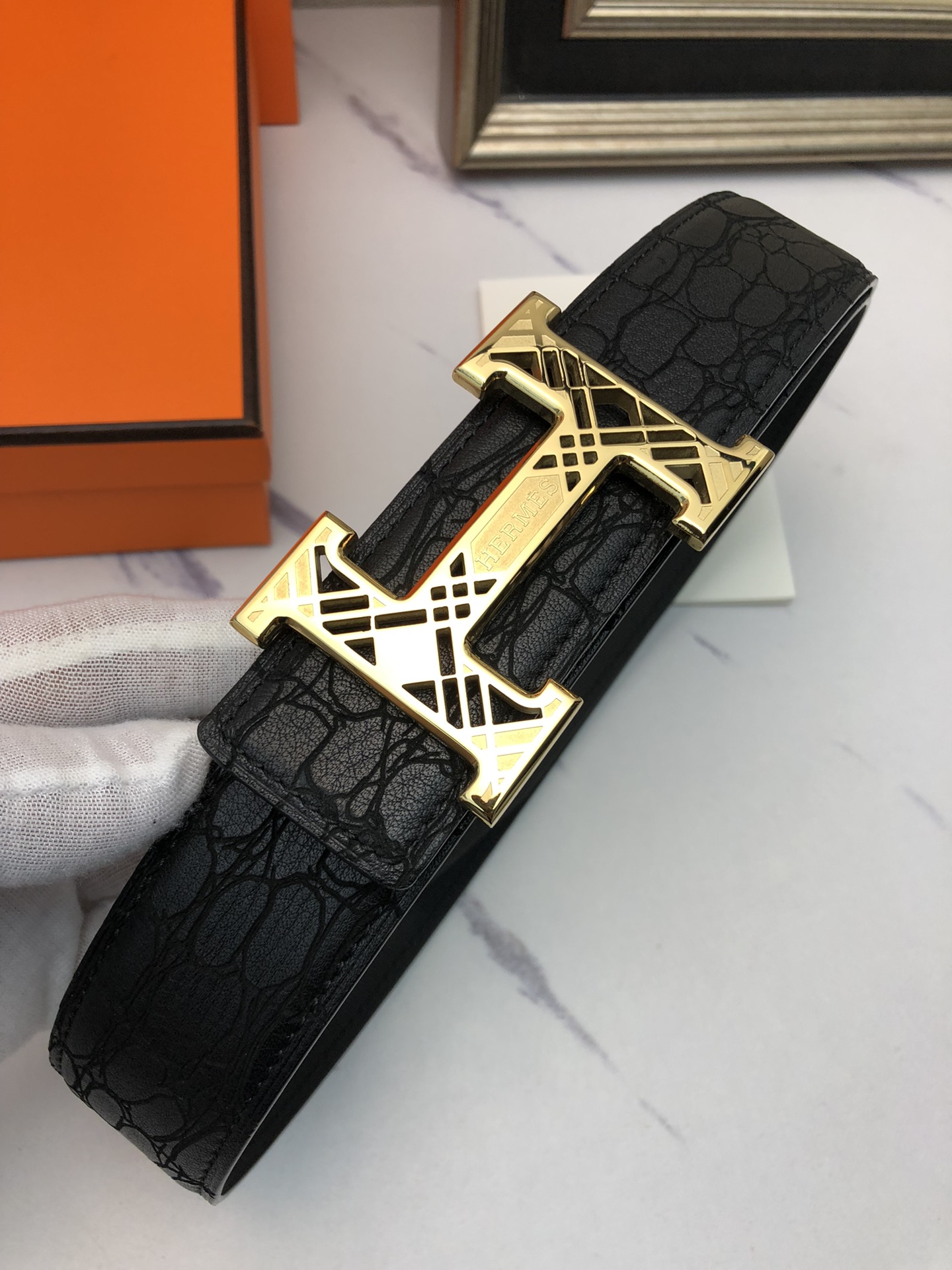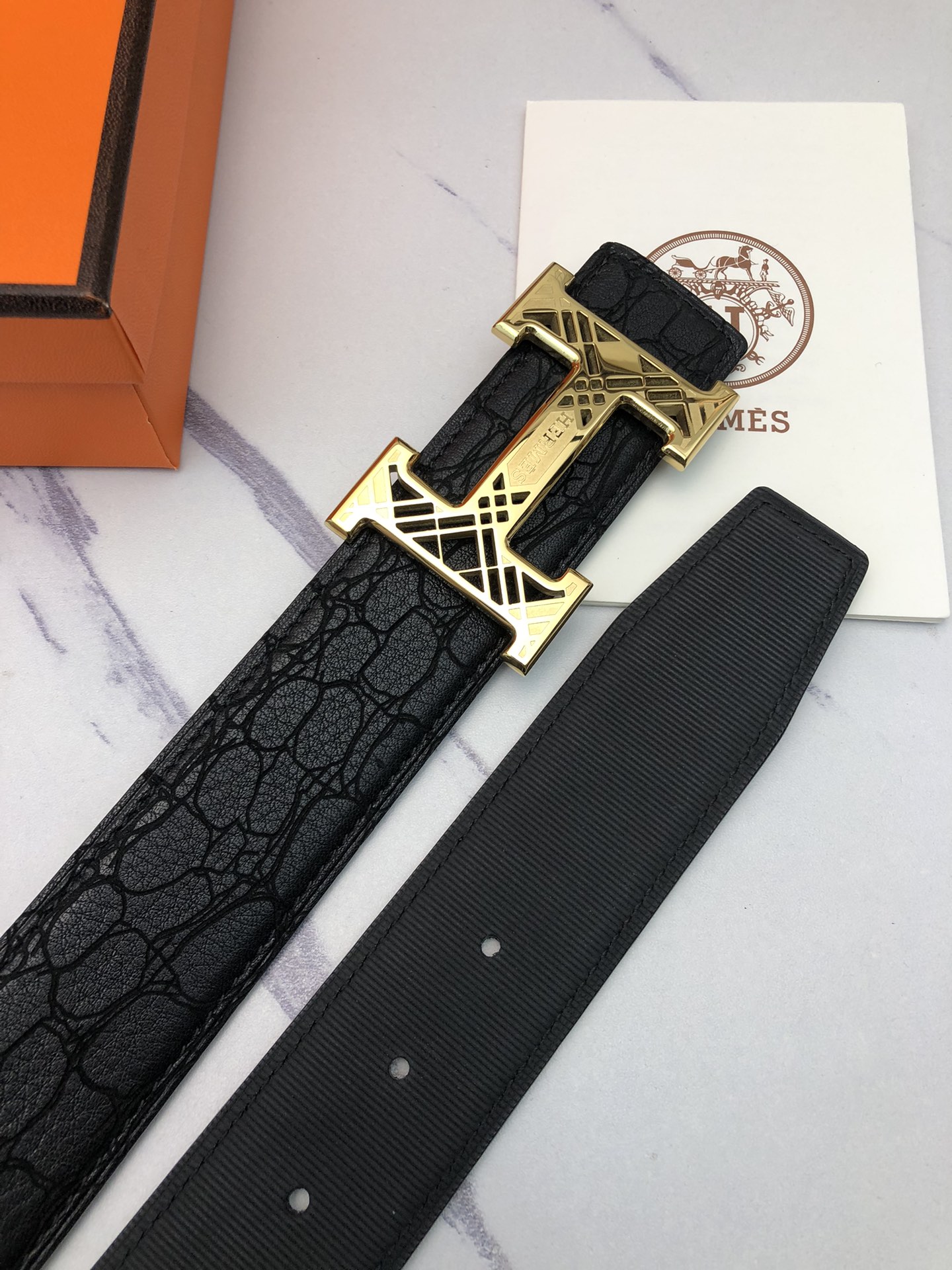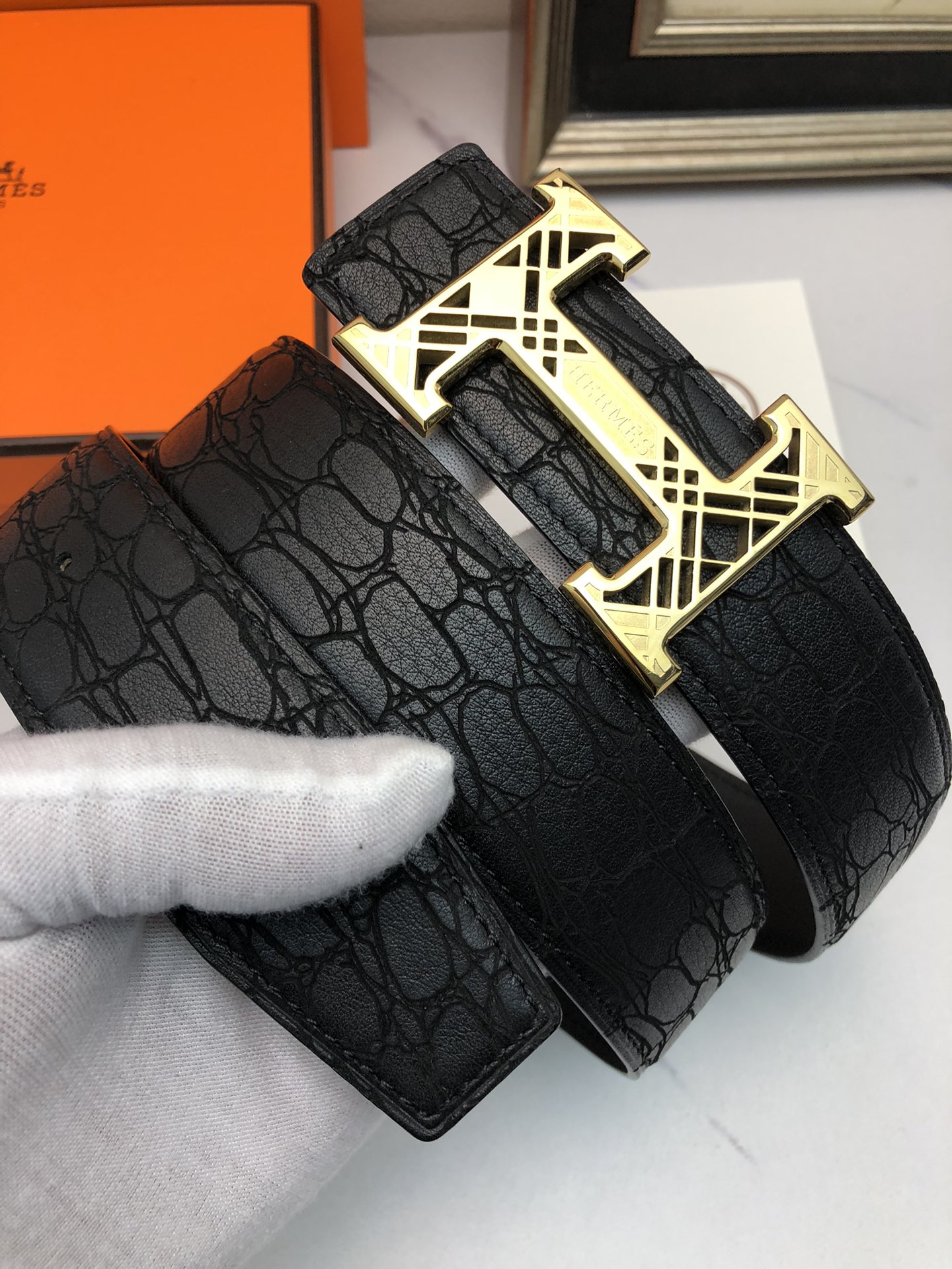 这款皮带是AAAAA 1:1 质量 (非常棒). 使用了和原版一模一样的材料. 商标部分也保持了和爱马仕/Hermes一样. 图片拍摄是实物皮带拍摄, 您所收到的实物保证和我们图片一模一样.