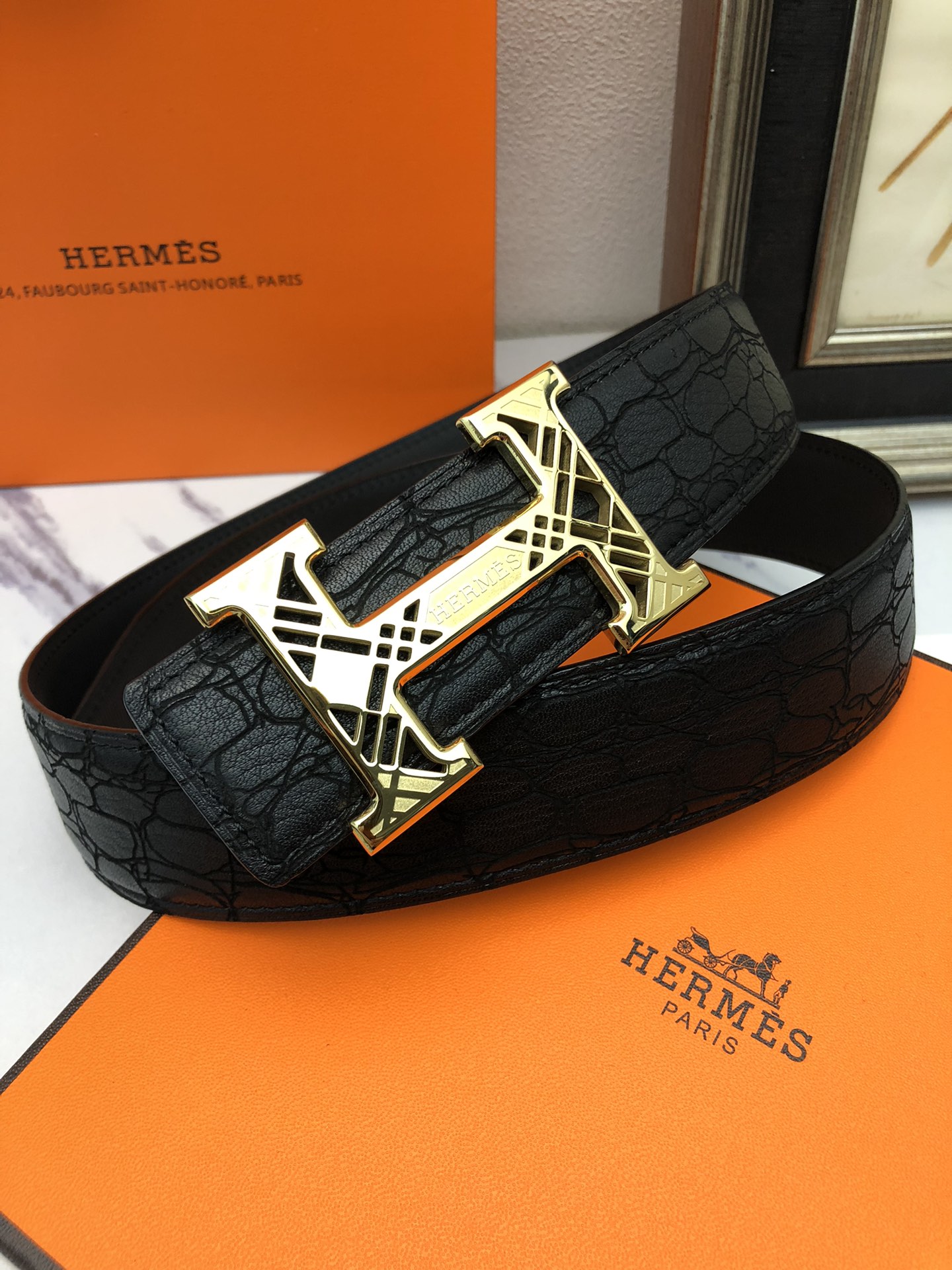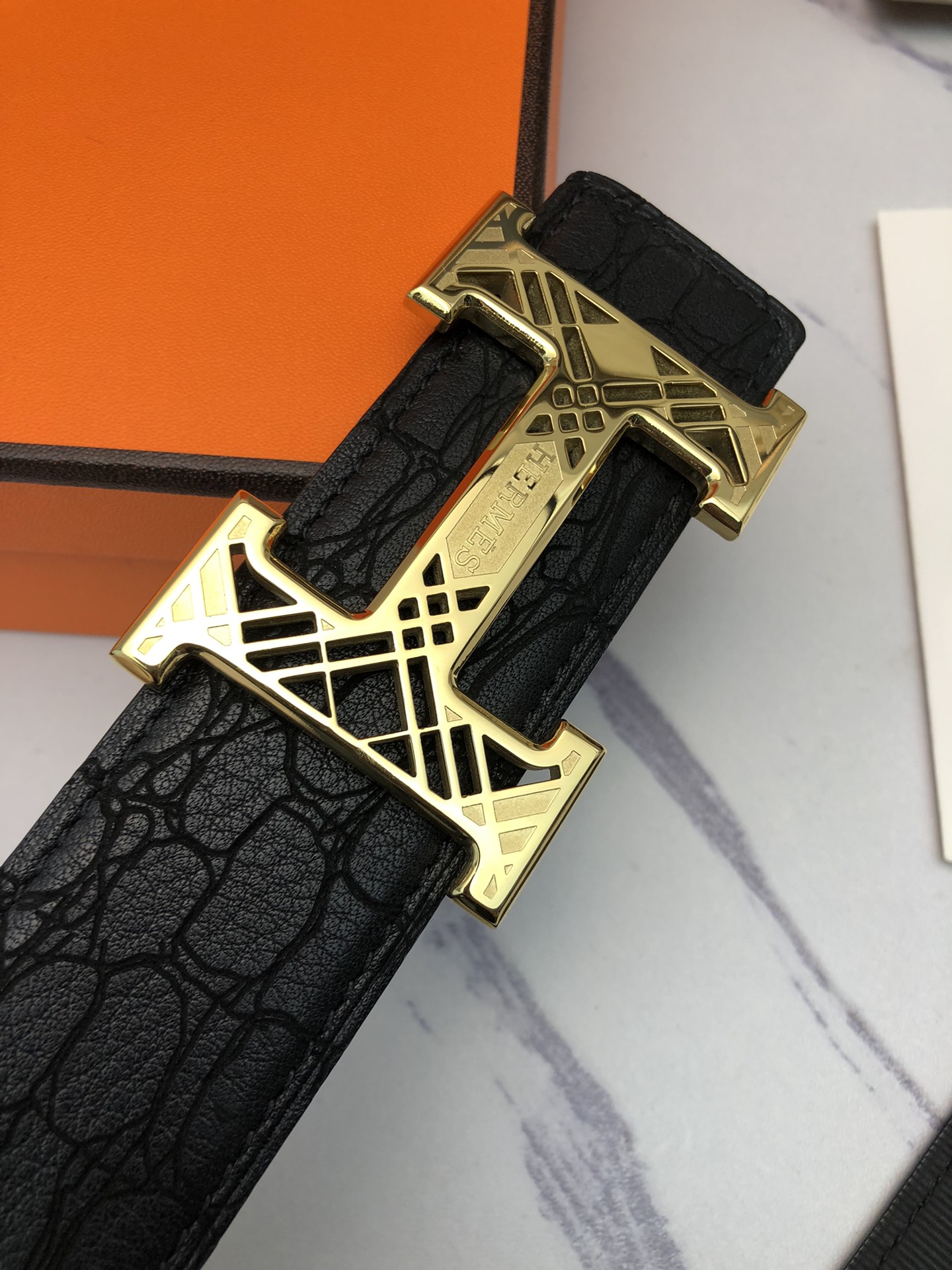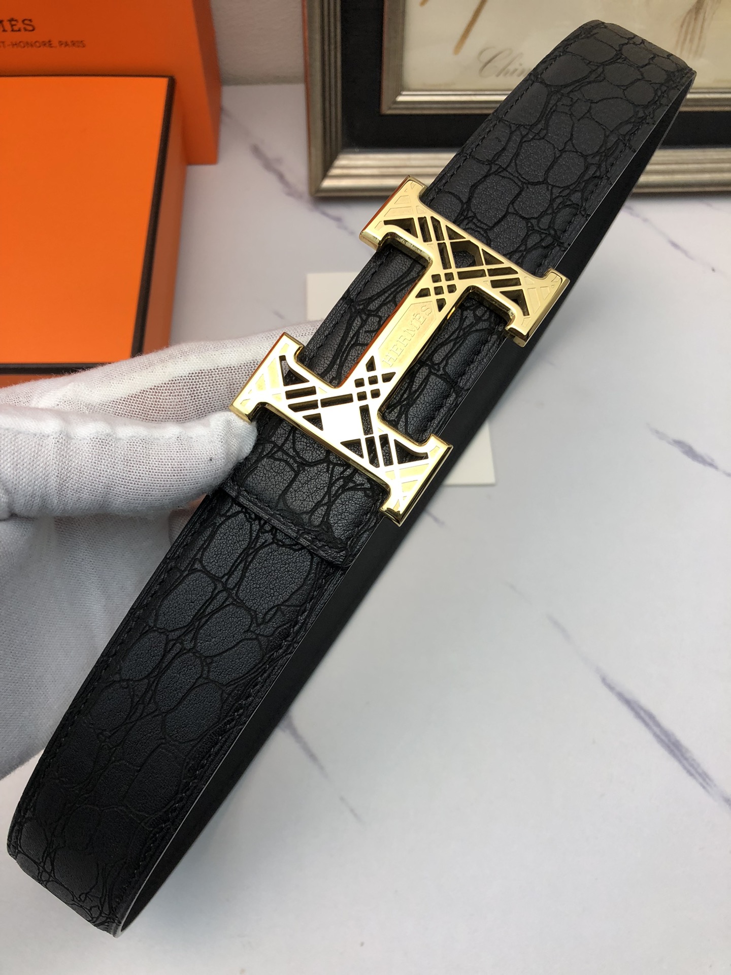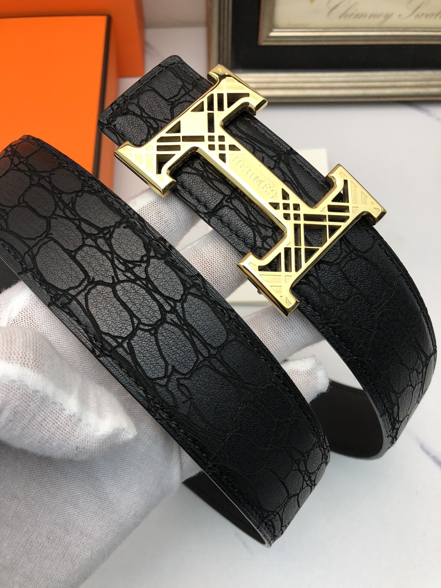 这款皮带是AAAAA 1:1 质量 (非常棒). 使用了和原版一模一样的材料. 商标部分也保持了和爱马仕/Hermes一样. 图片拍摄是实物皮带拍摄, 您所收到的实物保证和我们图片一模一样.
