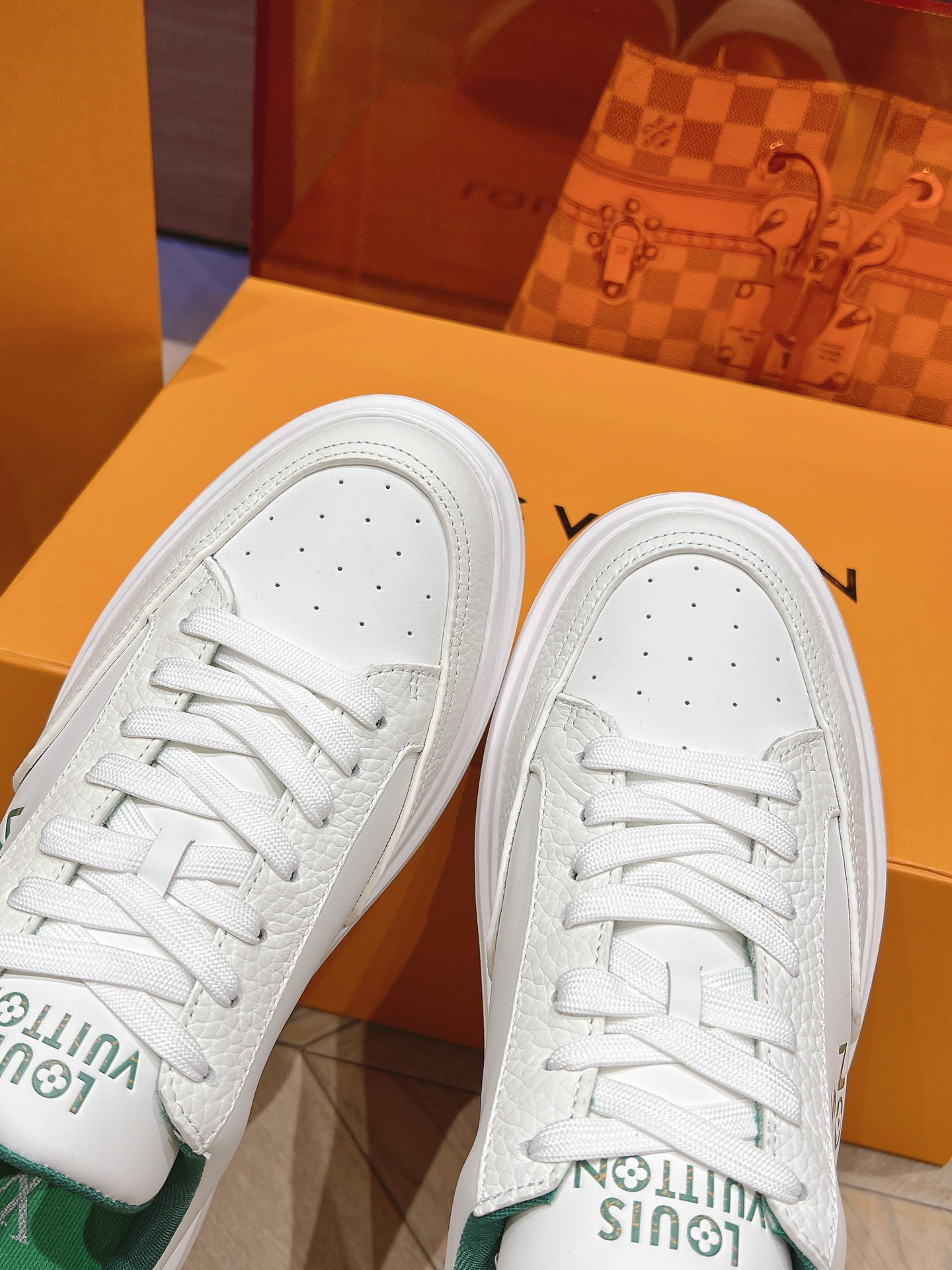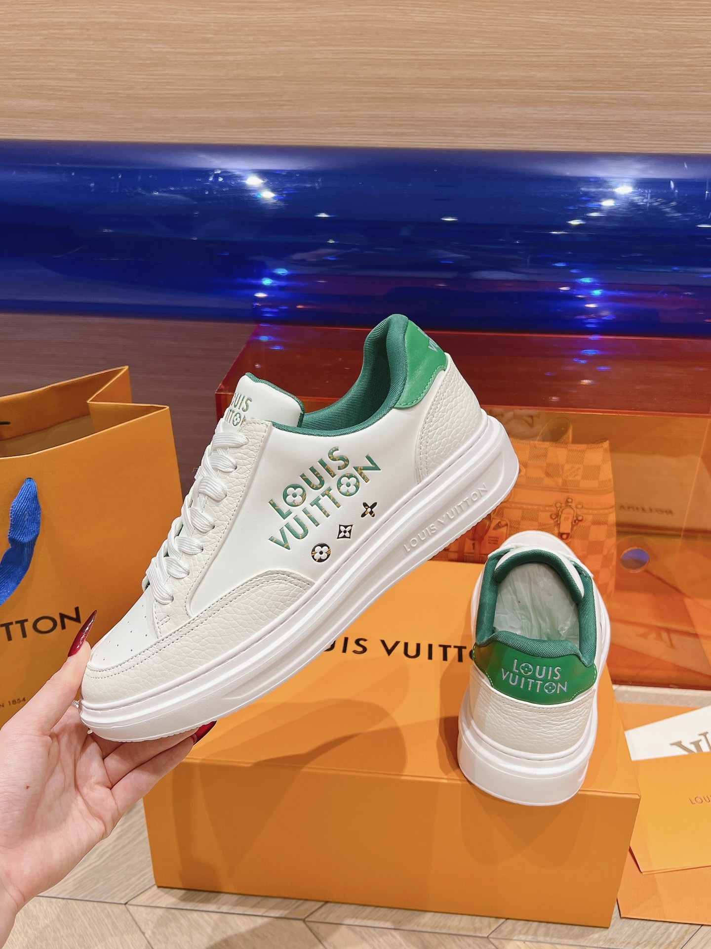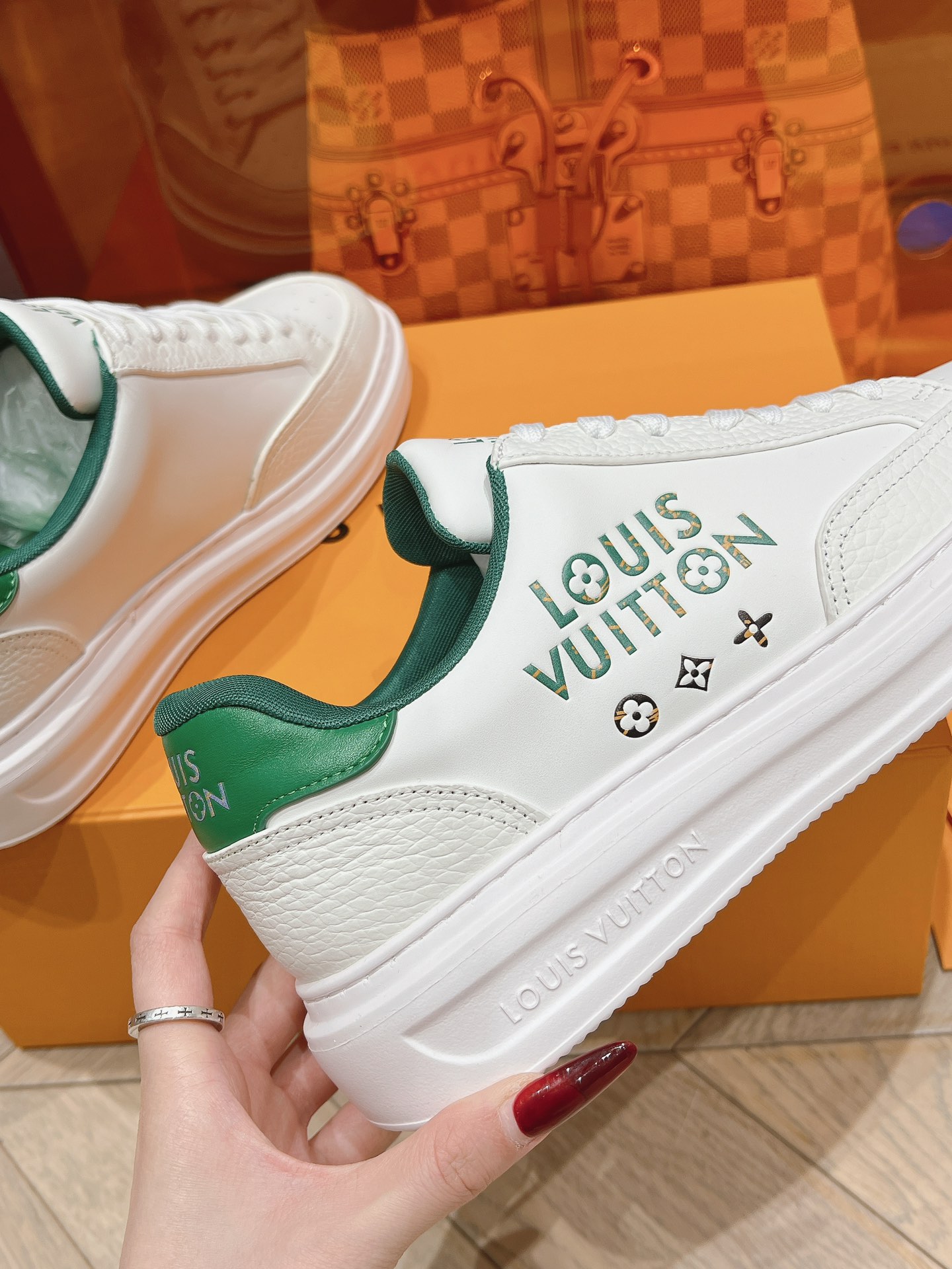 这款鞋子是AAAAA 1:1 质量 (非常棒). 使用了和原版一模一样的材料. 商标部分也保持了和路易威登/Louis Vuitton一样. 图片拍摄是实物鞋子拍摄, 您所收到的实物保证和我们图片一模一样.