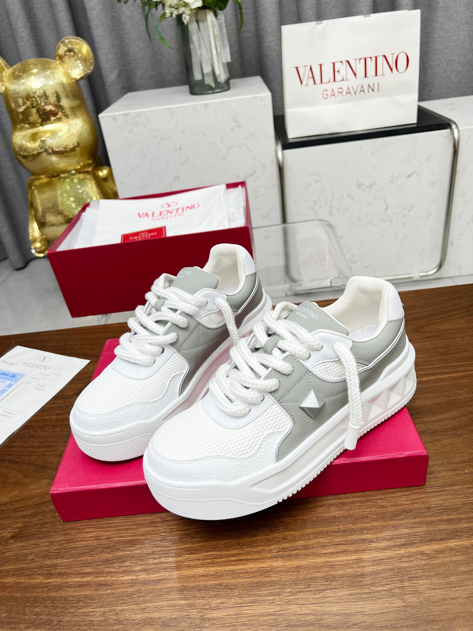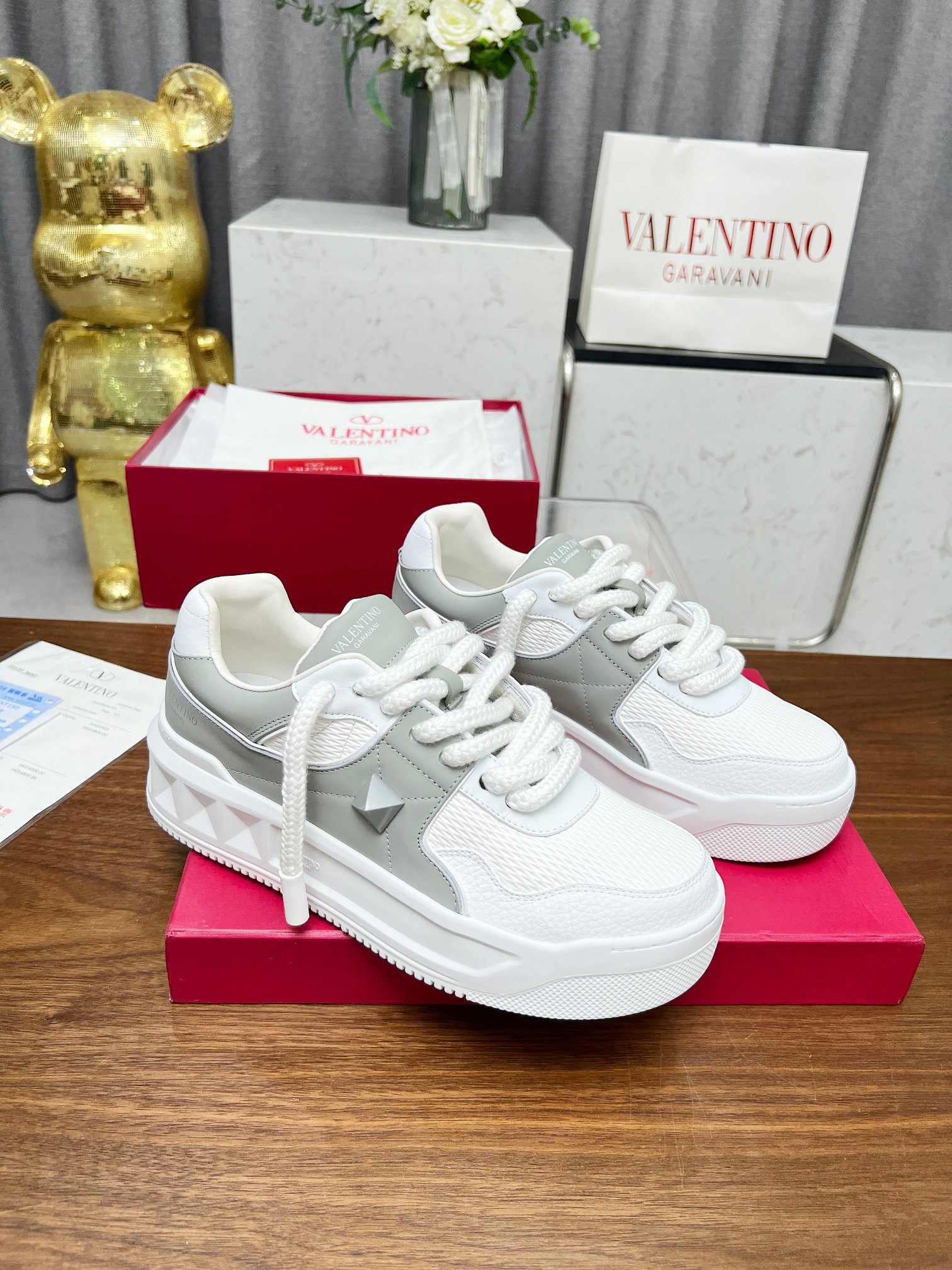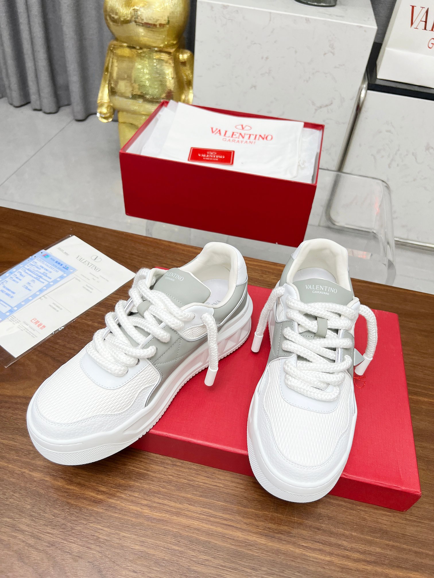 这款鞋子是AAAAA 1:1 质量 (非常棒). 使用了和原版一模一样的材料. 商标部分也保持了和华伦天奴/Valentino一样. 图片拍摄是实物鞋子拍摄, 您所收到的实物保证和我们图片一模一样.
