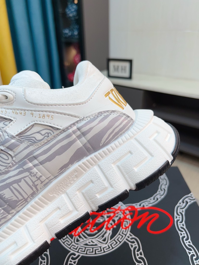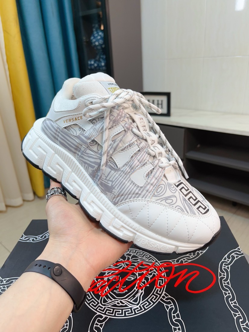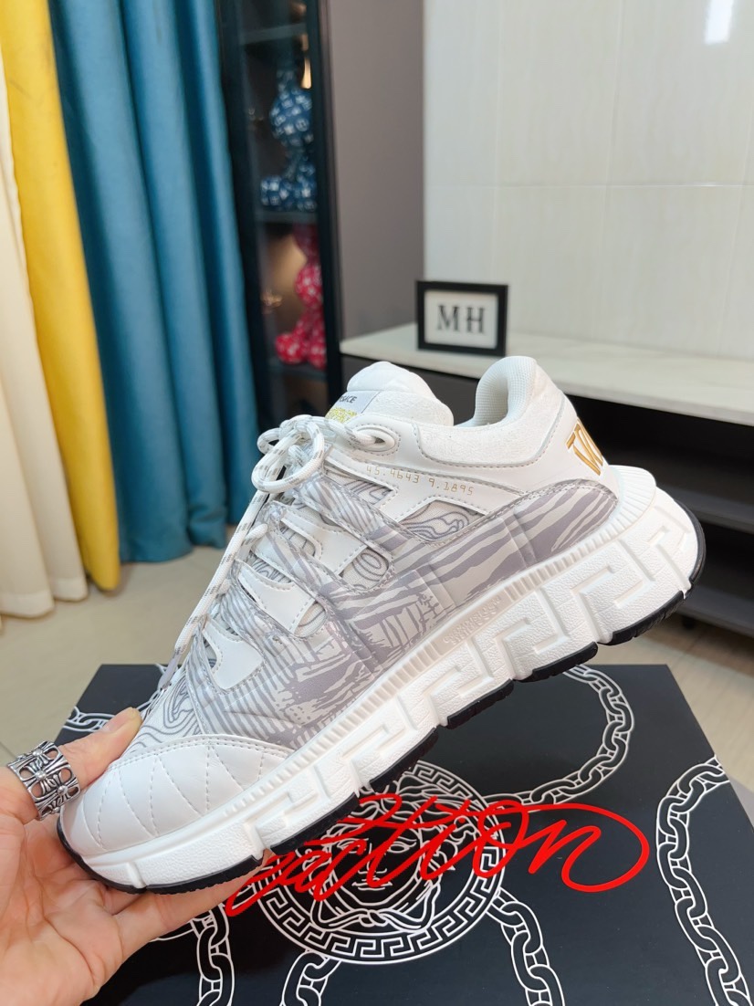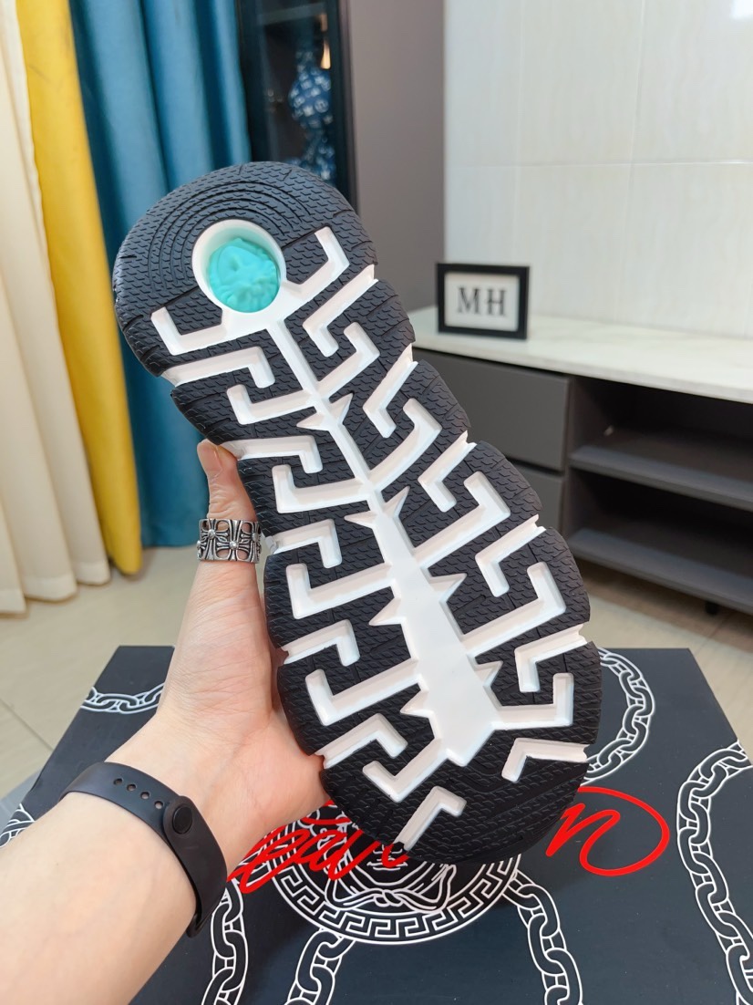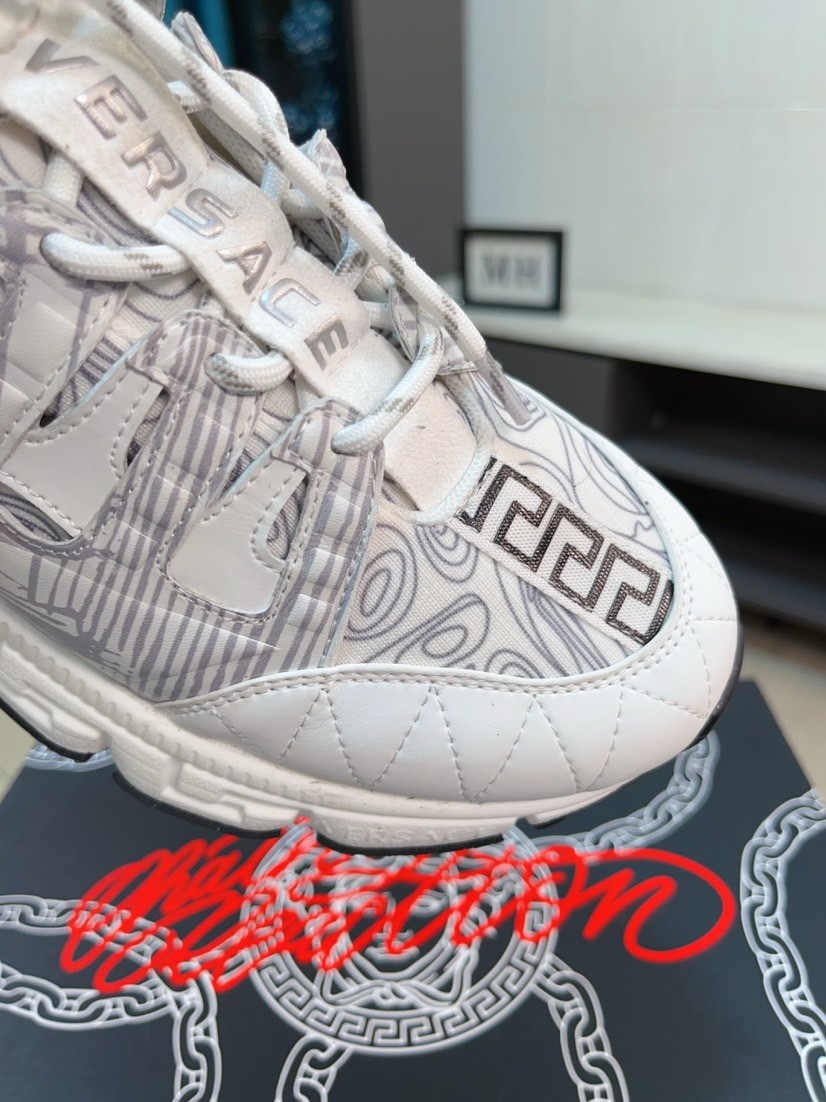 这款鞋子是AAAAA 1:1 质量 (非常棒). 使用了和原版一模一样的材料. 商标部分也保持了和范思哲/Versace一样. 图片拍摄是实物鞋子拍摄, 您所收到的实物保证和我们图片一模一样.