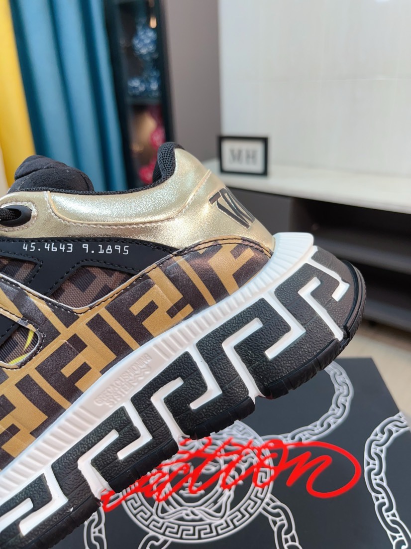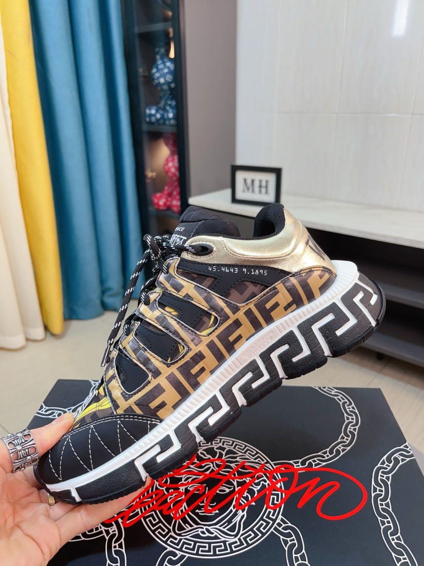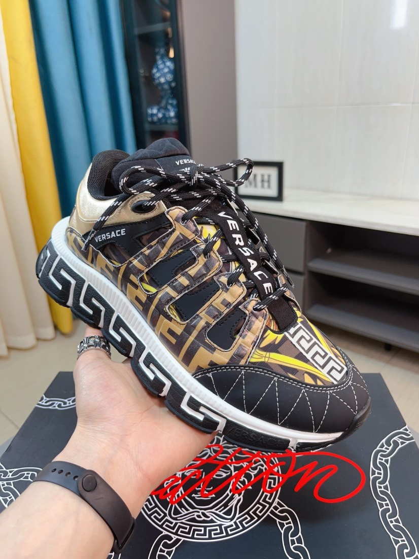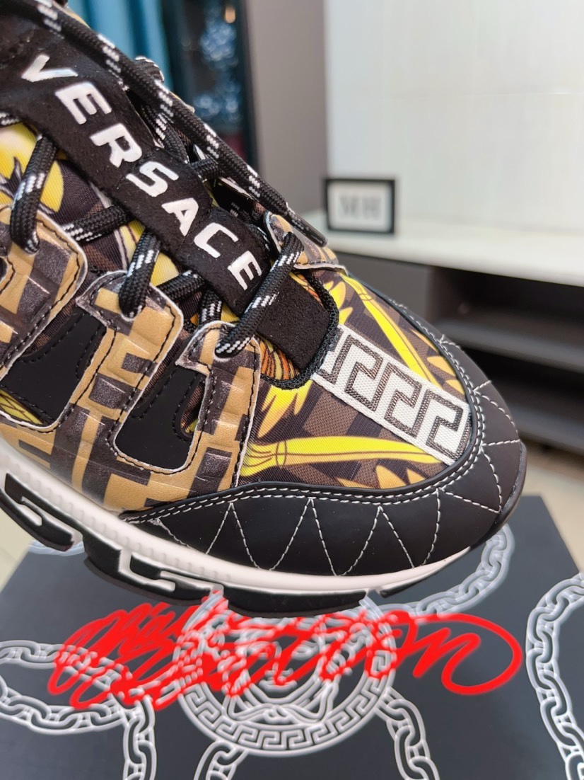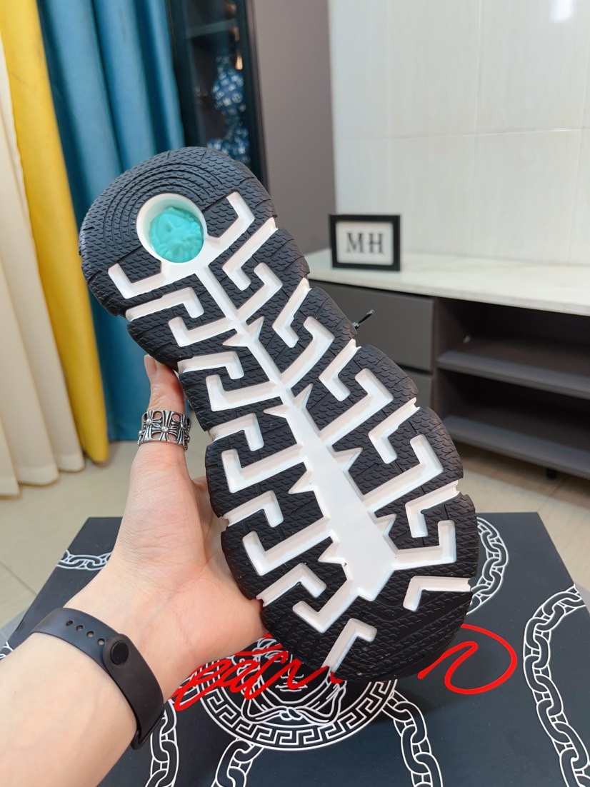 这款鞋子是AAAAA 1:1 质量 (非常棒). 使用了和原版一模一样的材料. 商标部分也保持了和范思哲/Versace一样. 图片拍摄是实物鞋子拍摄, 您所收到的实物保证和我们图片一模一样.