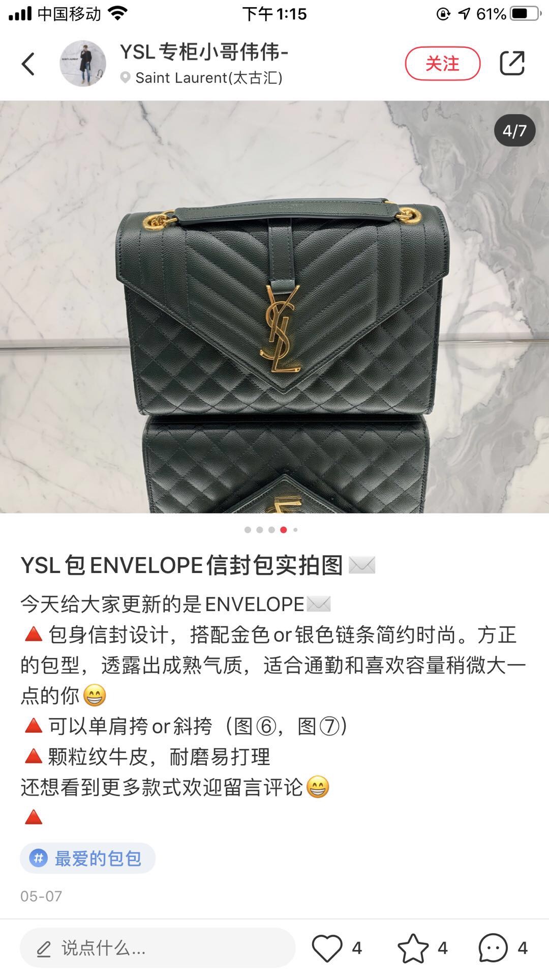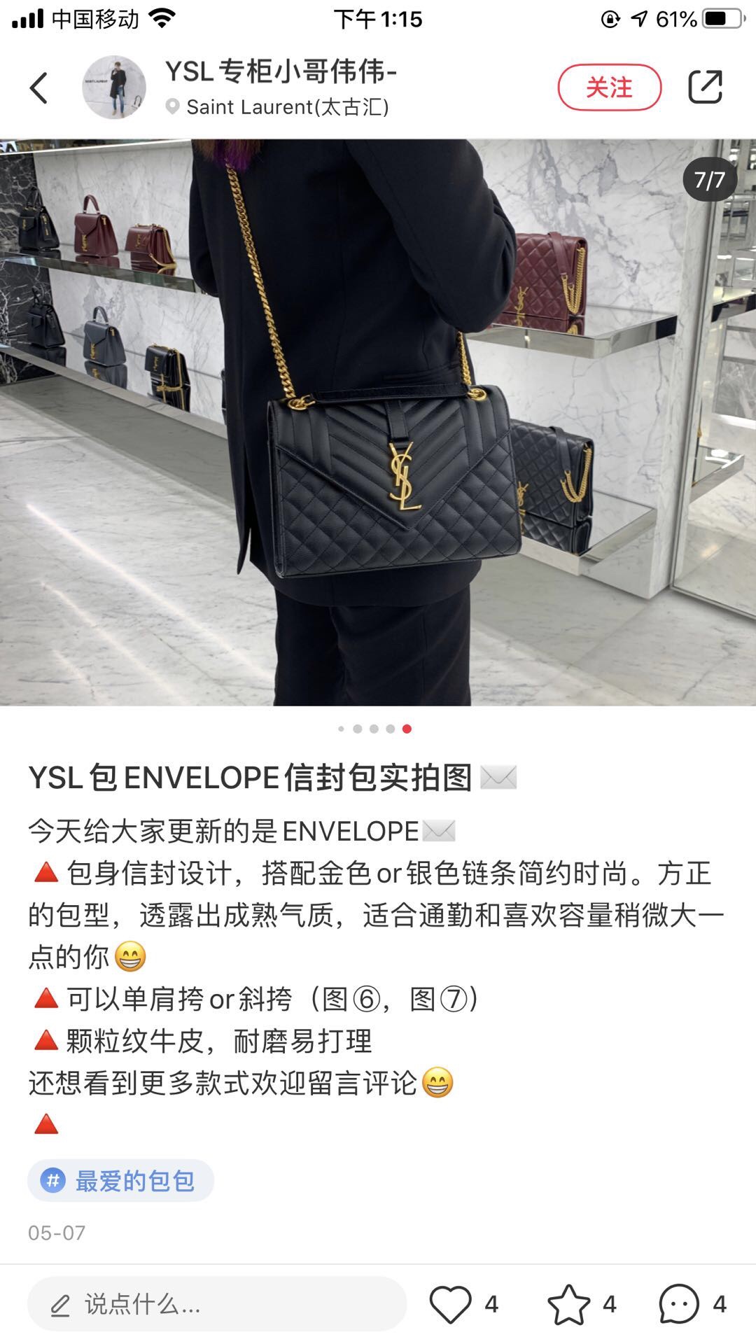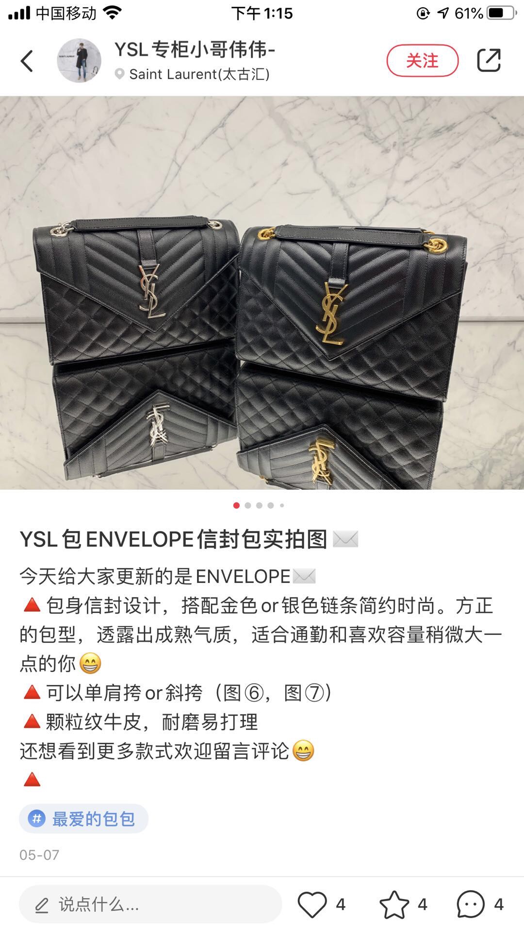 这款包包是AAAAA 1:1 质量 (非常棒). 使用了和原版一模一样的材料. 商标部分也保持了和圣罗兰/Saint Laurent一样. 图片拍摄是实物包包拍摄, 您所收到的实物保证和我们图片一模一样.
