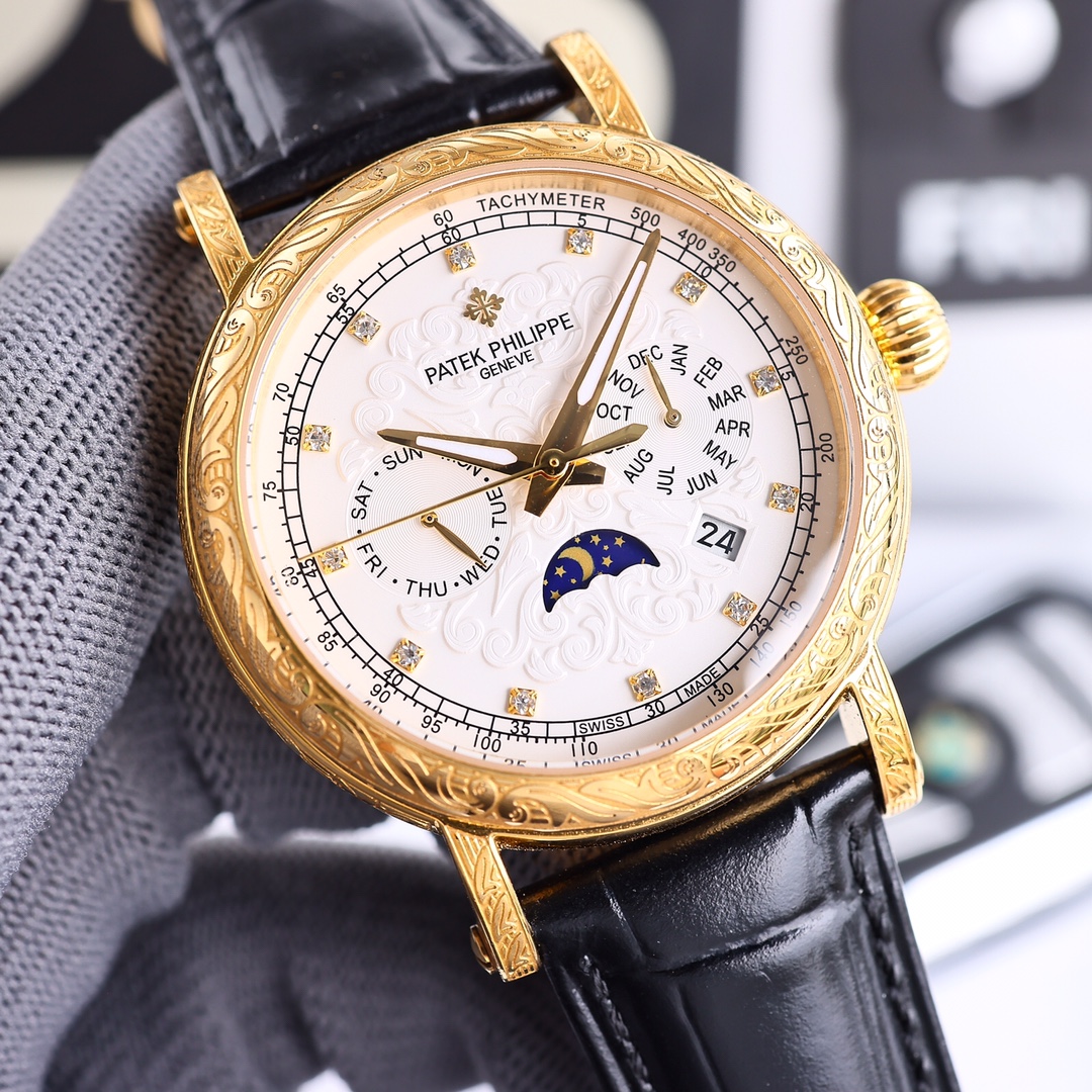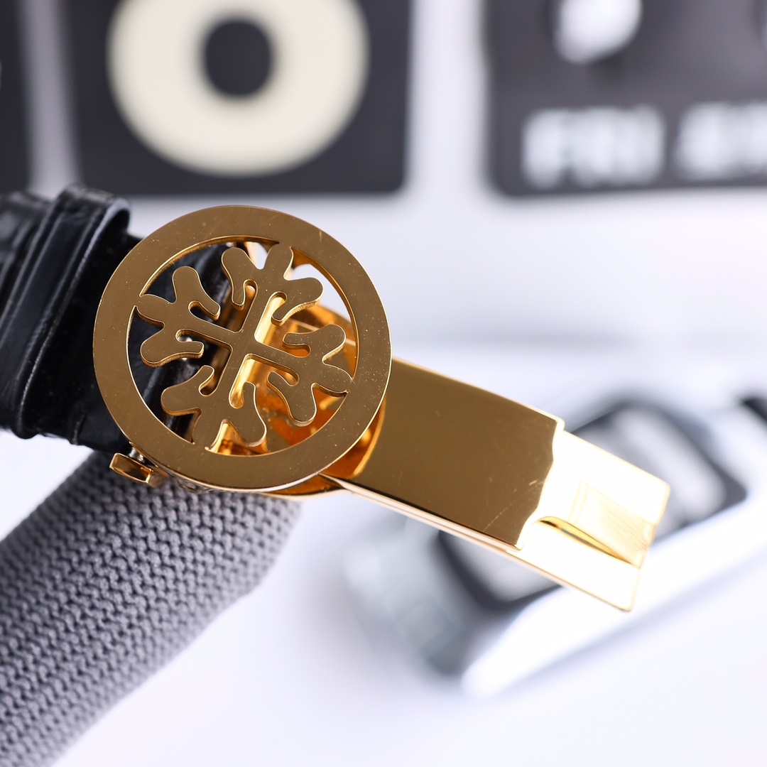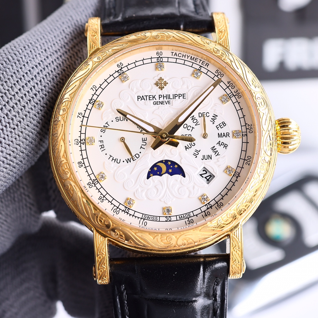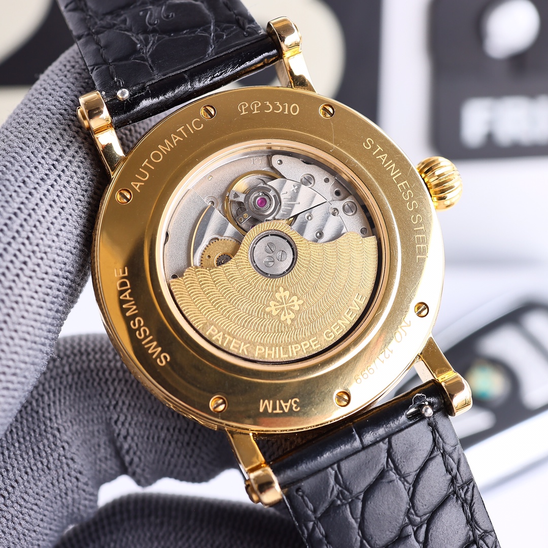 这款手表是AAAAA 1:1 质量 (非常棒). 使用了和原版一模一样的材料. 商标部分也保持了和百达翡丽/Patek Philippe一样. 图片拍摄是实物手表拍摄, 您所收到的实物保证和我们图片一模一样.