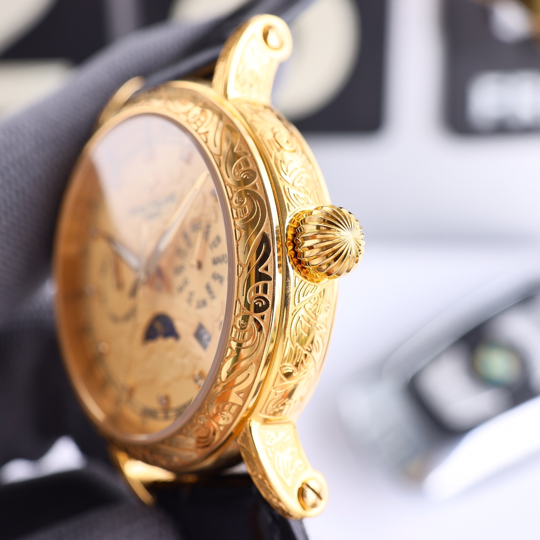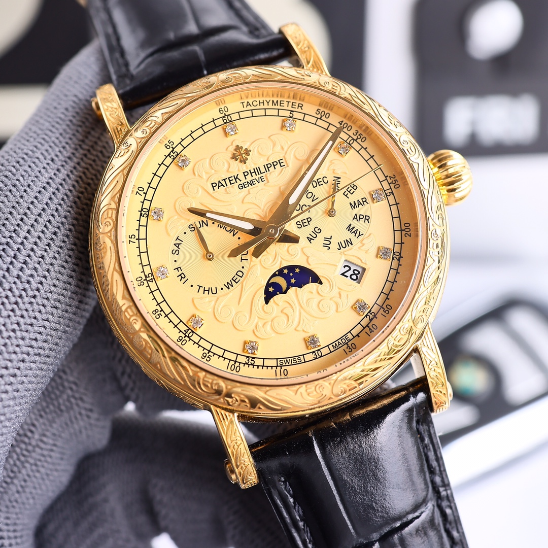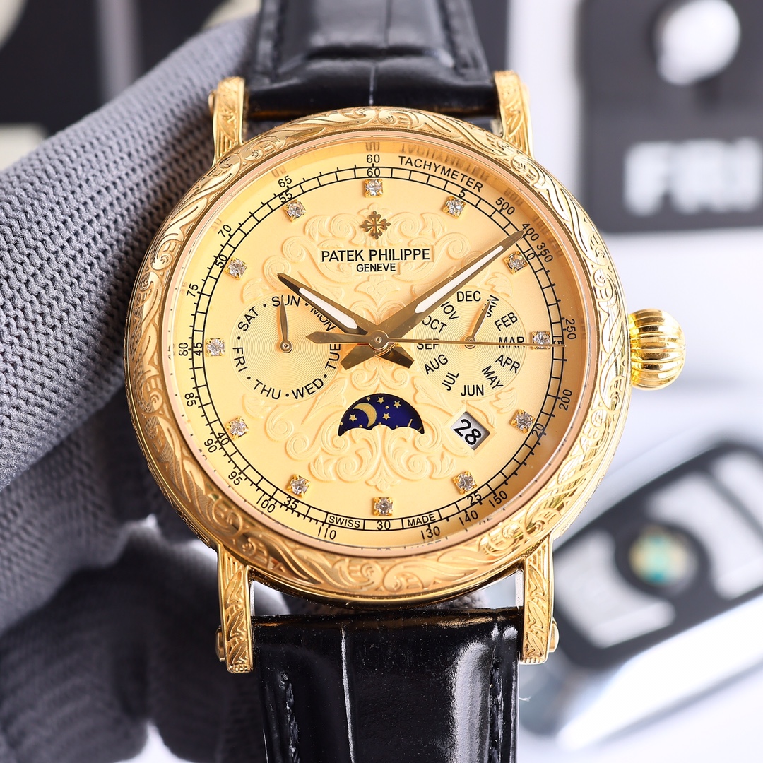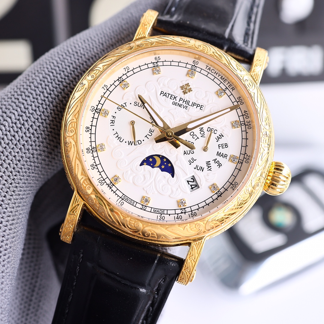 这款手表是AAAAA 1:1 质量 (非常棒). 使用了和原版一模一样的材料. 商标部分也保持了和百达翡丽/Patek Philippe一样. 图片拍摄是实物手表拍摄, 您所收到的实物保证和我们图片一模一样.