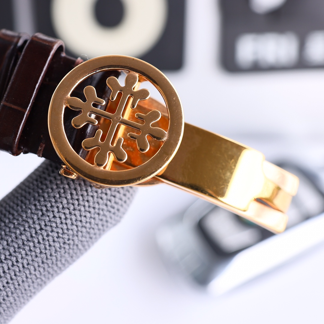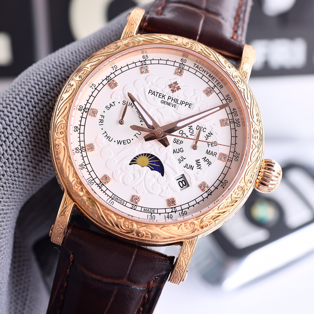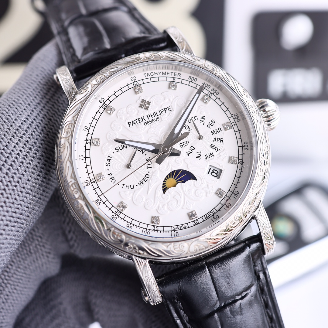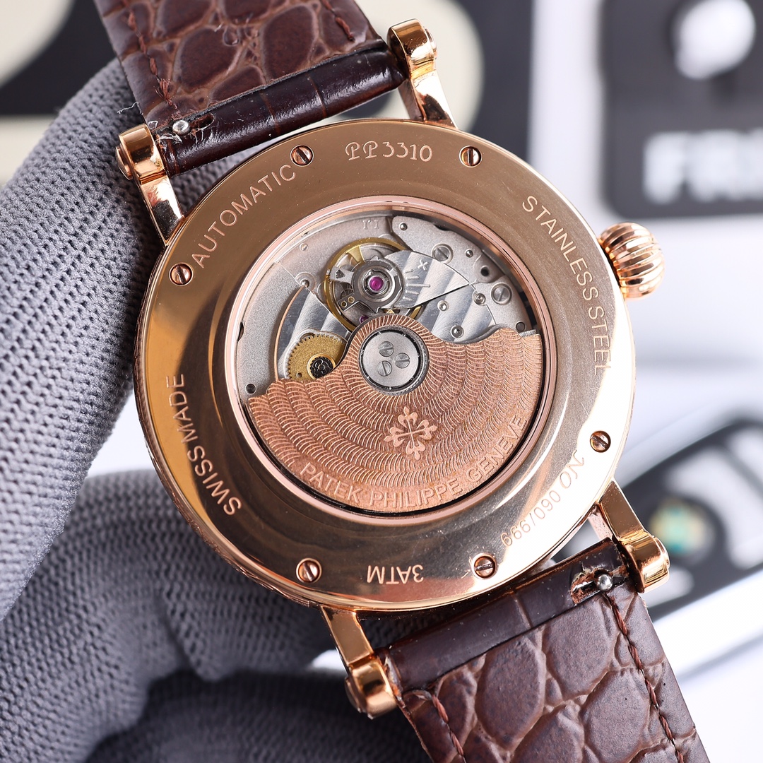 这款手表是AAAAA 1:1 质量 (非常棒). 使用了和原版一模一样的材料. 商标部分也保持了和百达翡丽/Patek Philippe一样. 图片拍摄是实物手表拍摄, 您所收到的实物保证和我们图片一模一样.