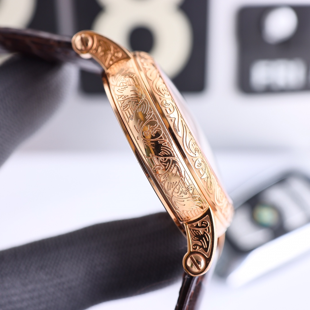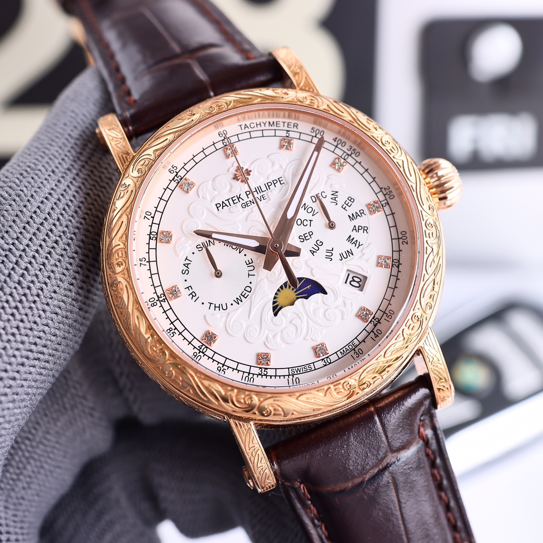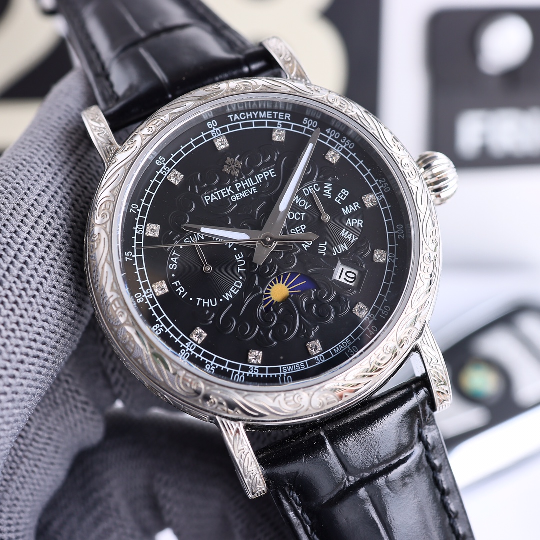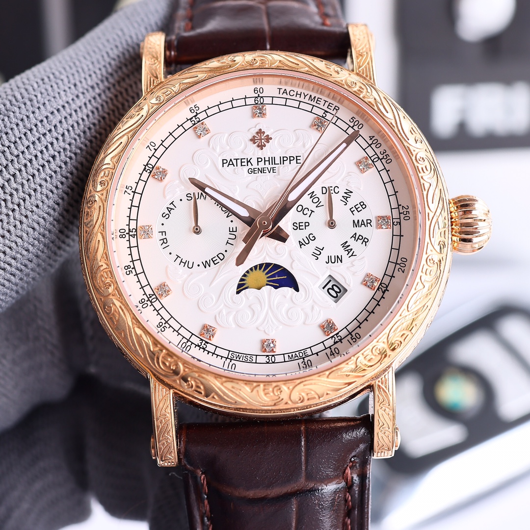 这款手表是AAAAA 1:1 质量 (非常棒). 使用了和原版一模一样的材料. 商标部分也保持了和百达翡丽/Patek Philippe一样. 图片拍摄是实物手表拍摄, 您所收到的实物保证和我们图片一模一样.