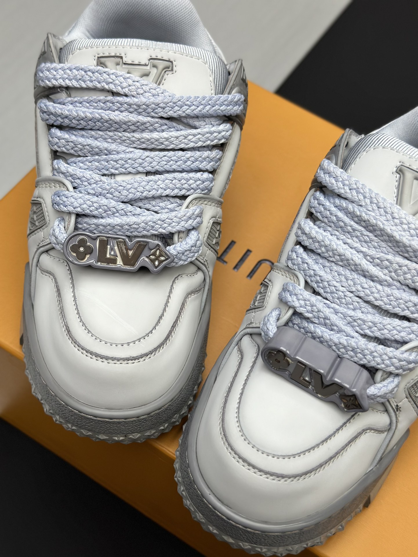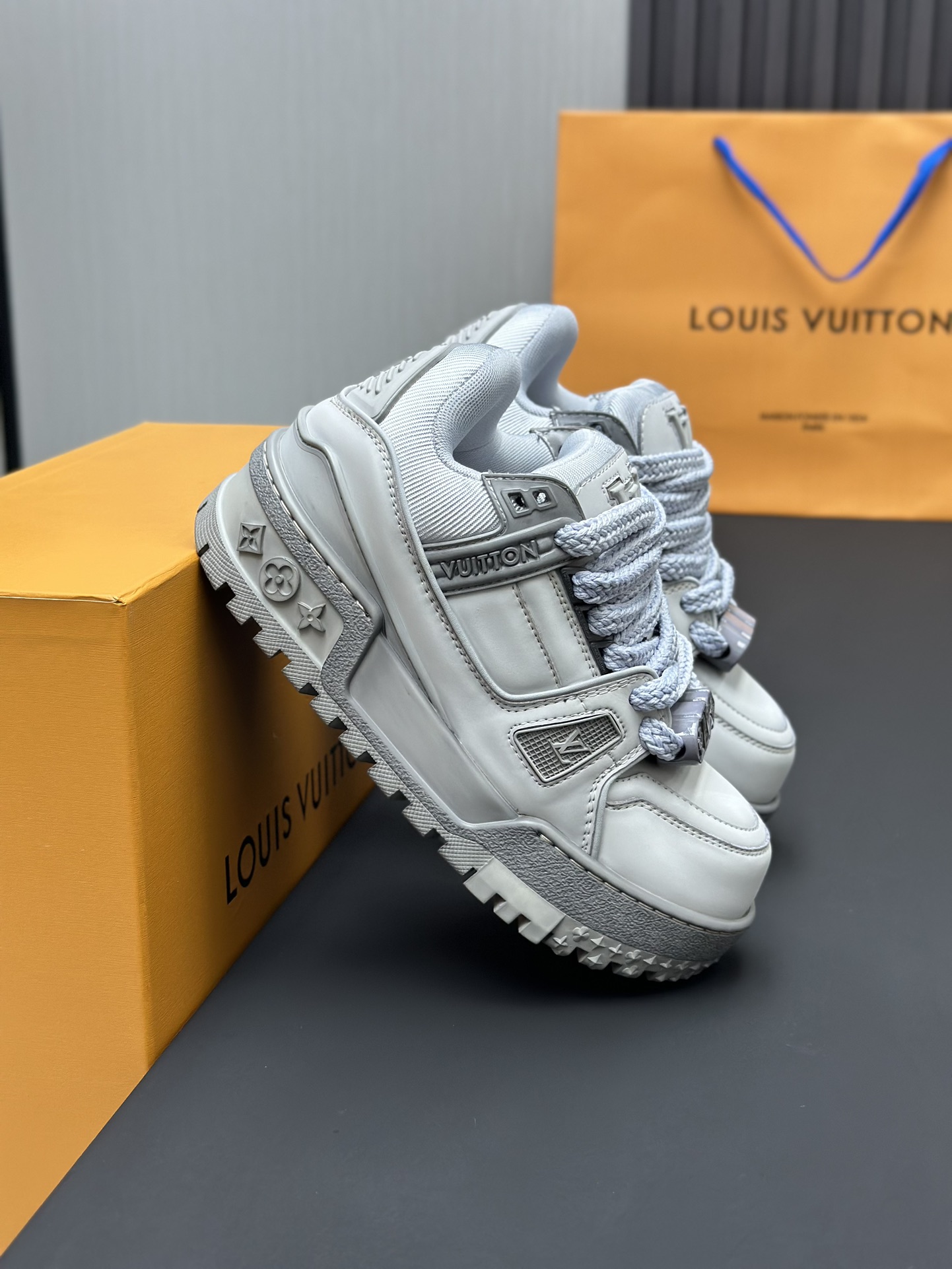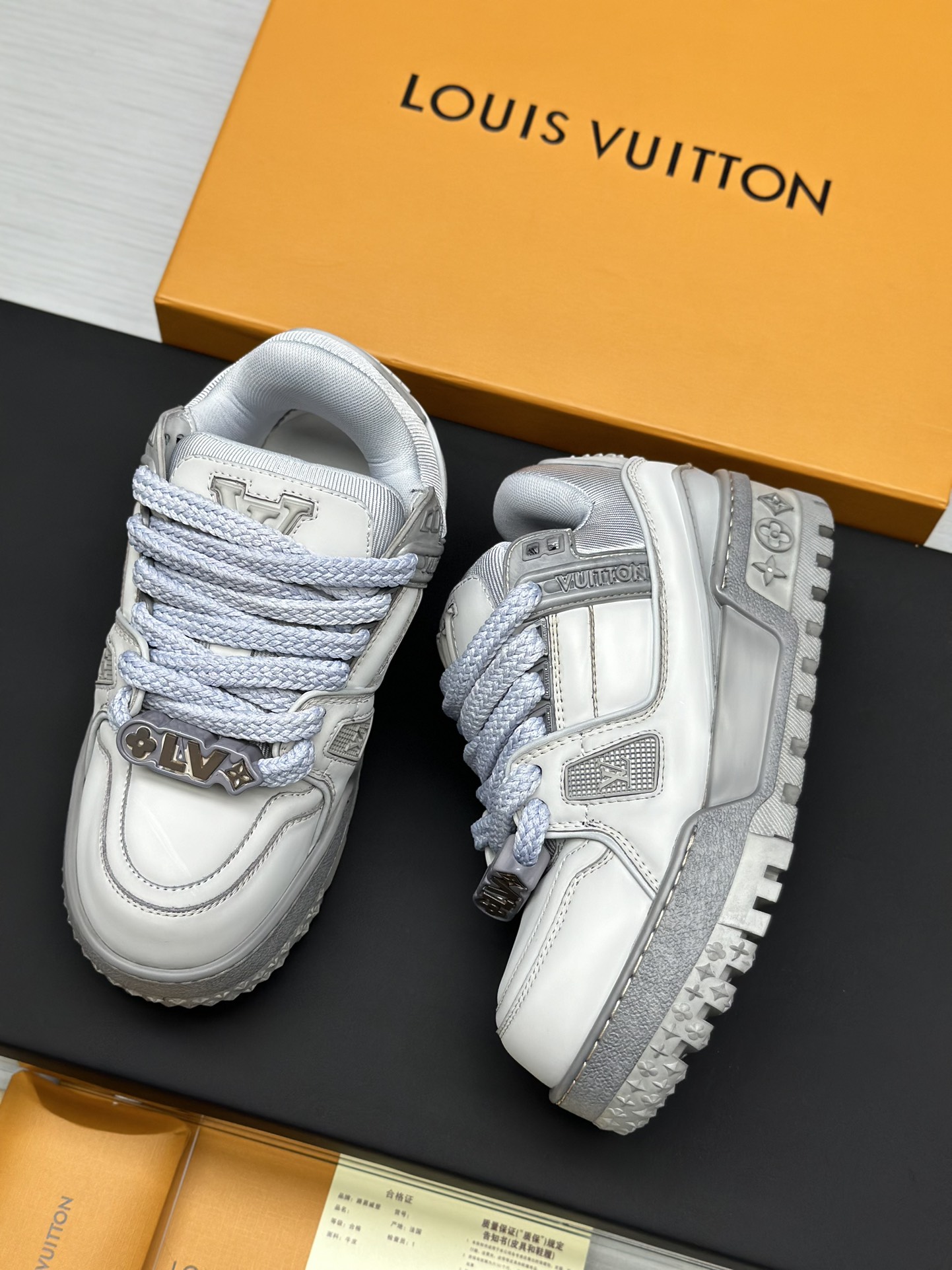 这款鞋子是AAAAA 1:1 质量 (非常棒). 使用了和原版一模一样的材料. 商标部分也保持了和路易威登/Louis Vuitton一样. 图片拍摄是实物鞋子拍摄, 您所收到的实物保证和我们图片一模一样.