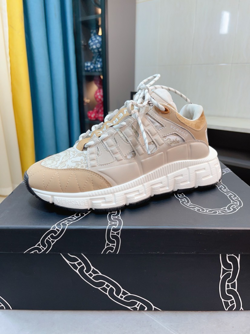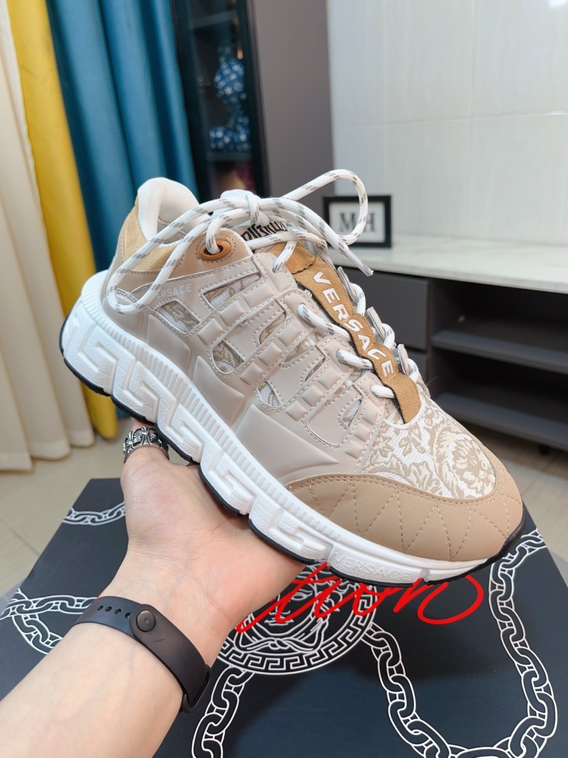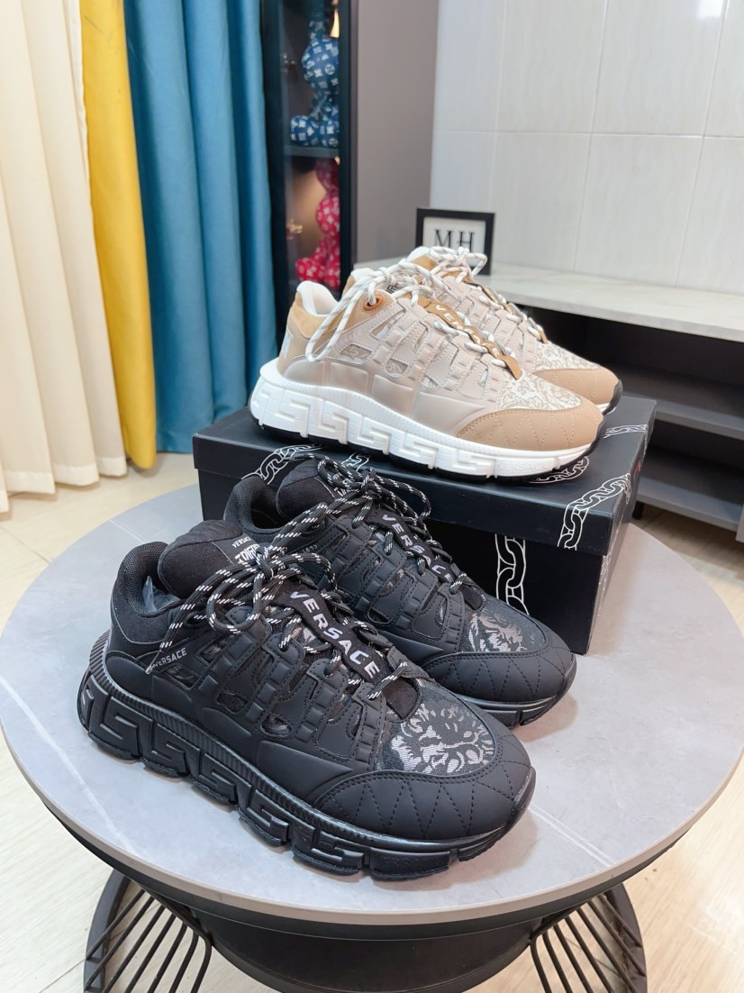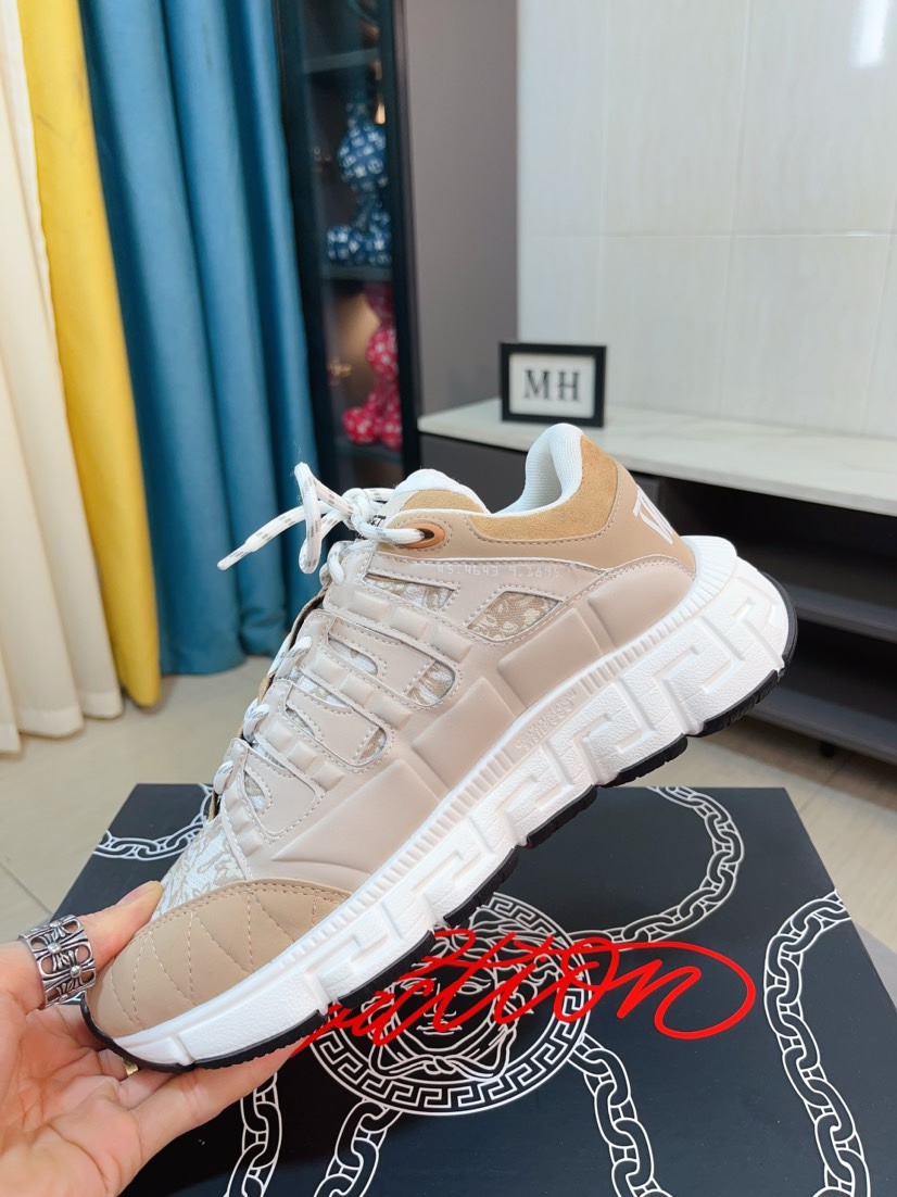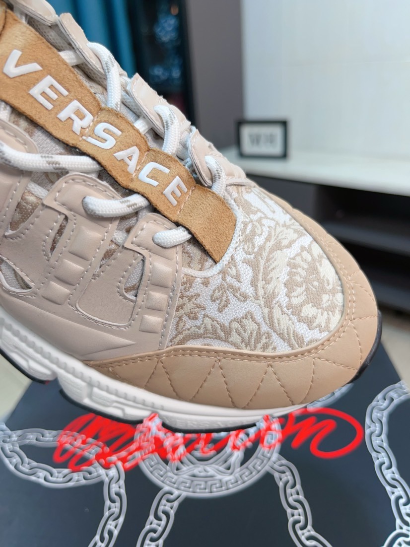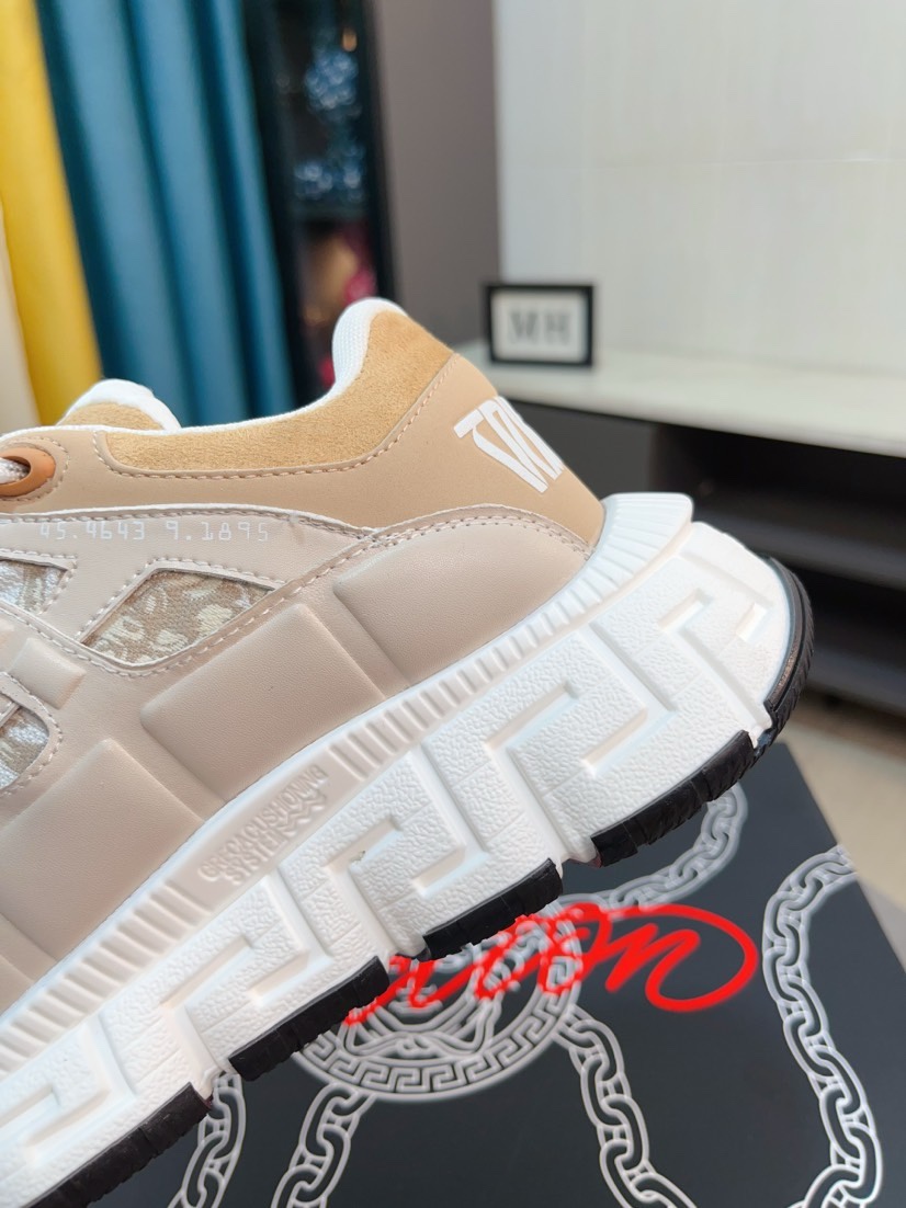 这款鞋子是AAAAA 1:1 质量 (非常棒). 使用了和原版一模一样的材料. 商标部分也保持了和范思哲/Versace一样. 图片拍摄是实物鞋子拍摄, 您所收到的实物保证和我们图片一模一样.