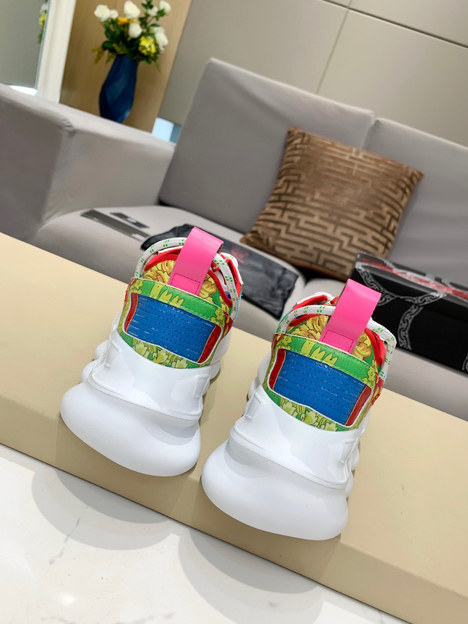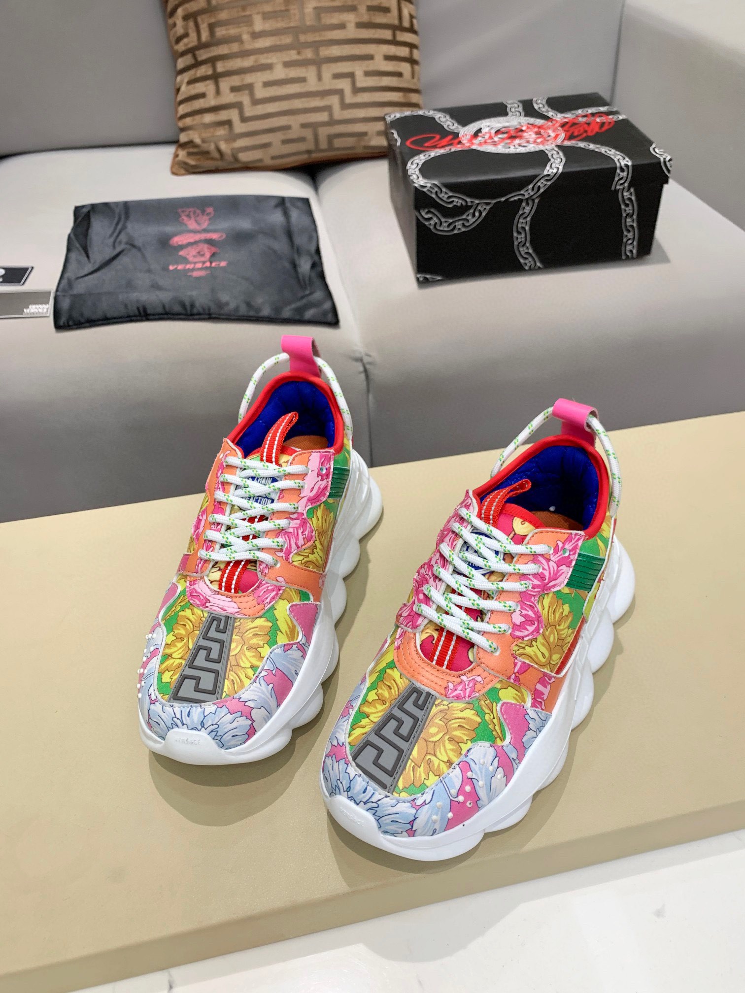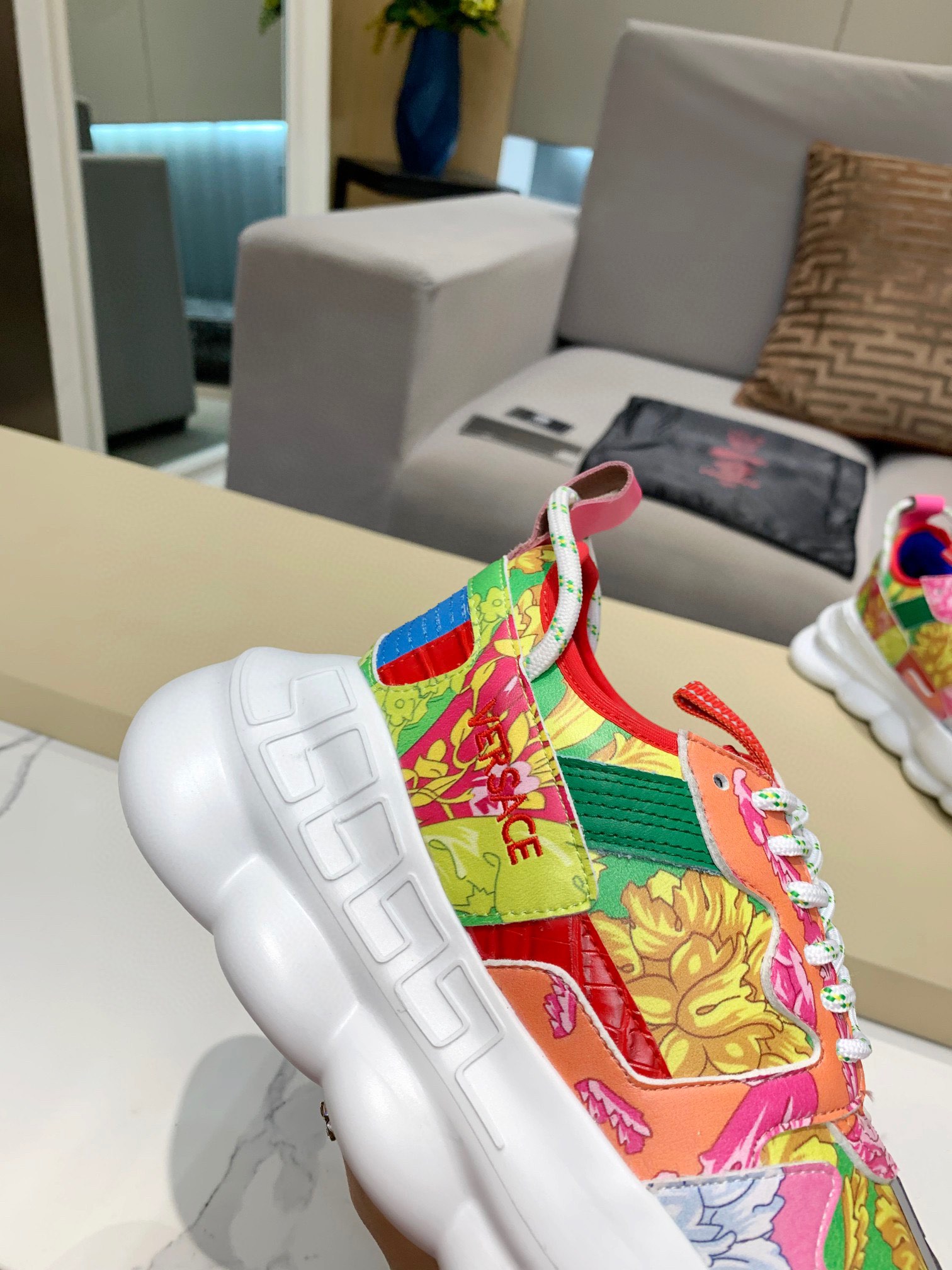 这款鞋子是AAAAA 1:1 质量 (非常棒). 使用了和原版一模一样的材料. 商标部分也保持了和范思哲/Versace一样. 图片拍摄是实物鞋子拍摄, 您所收到的实物保证和我们图片一模一样.