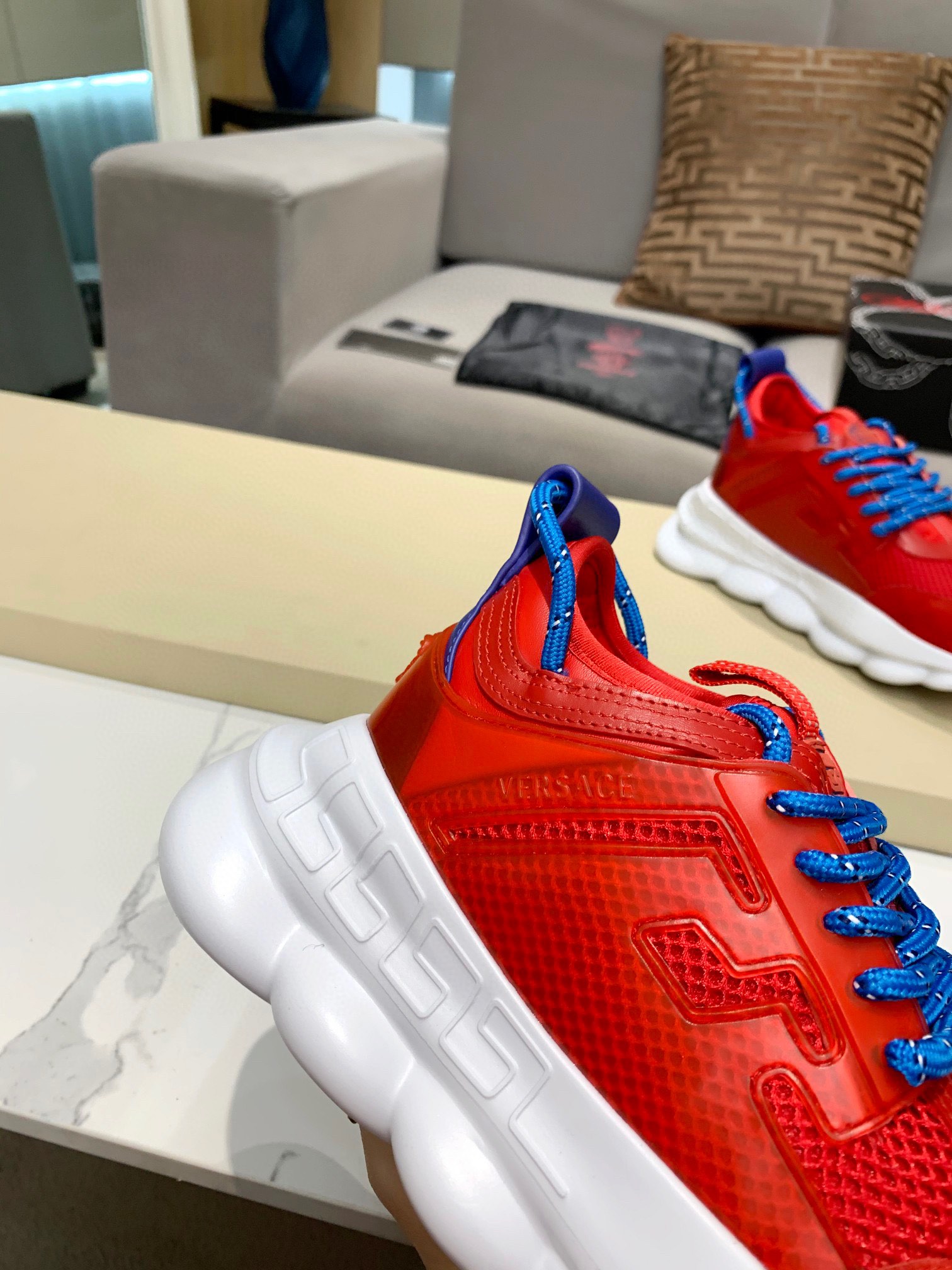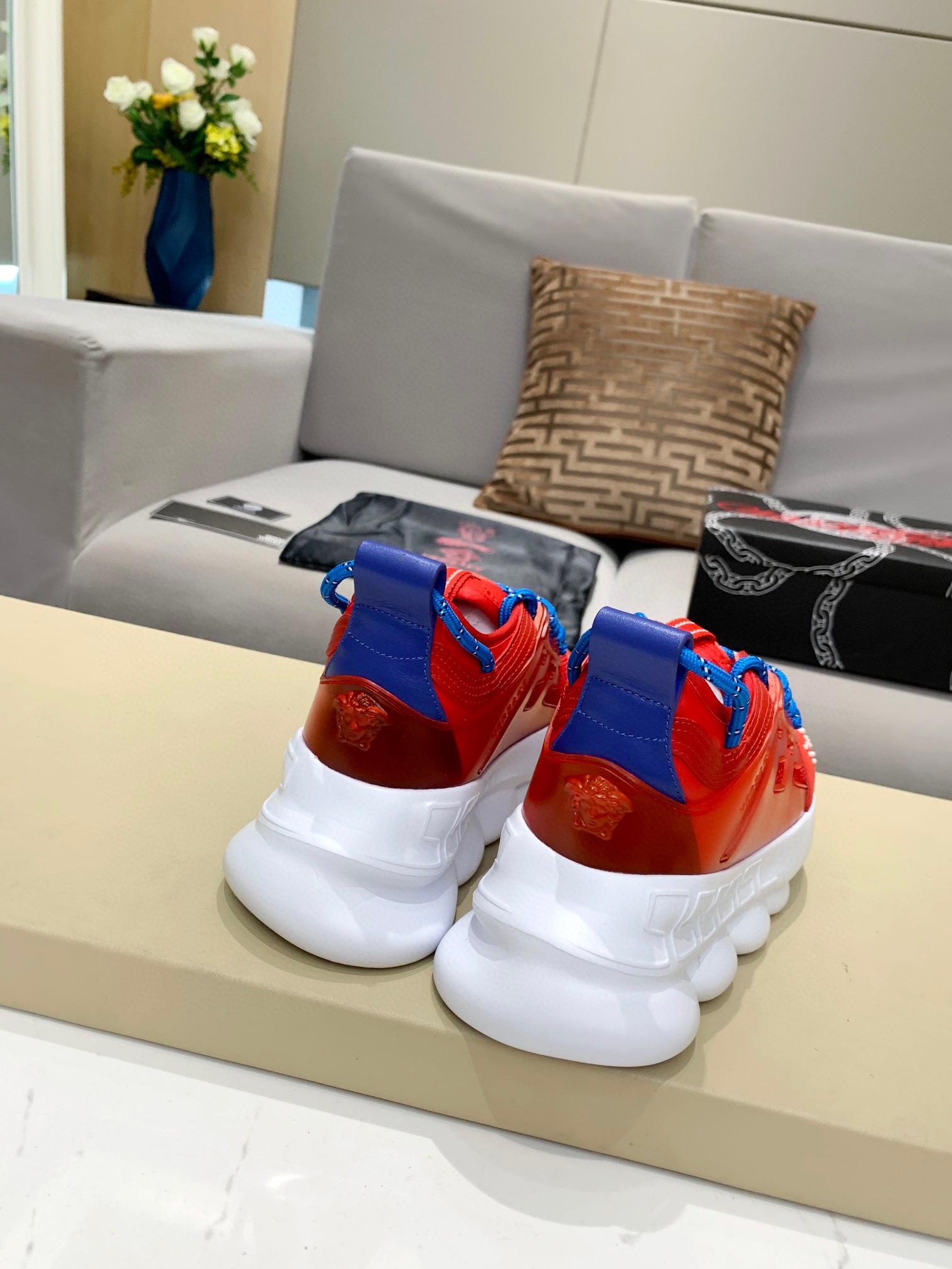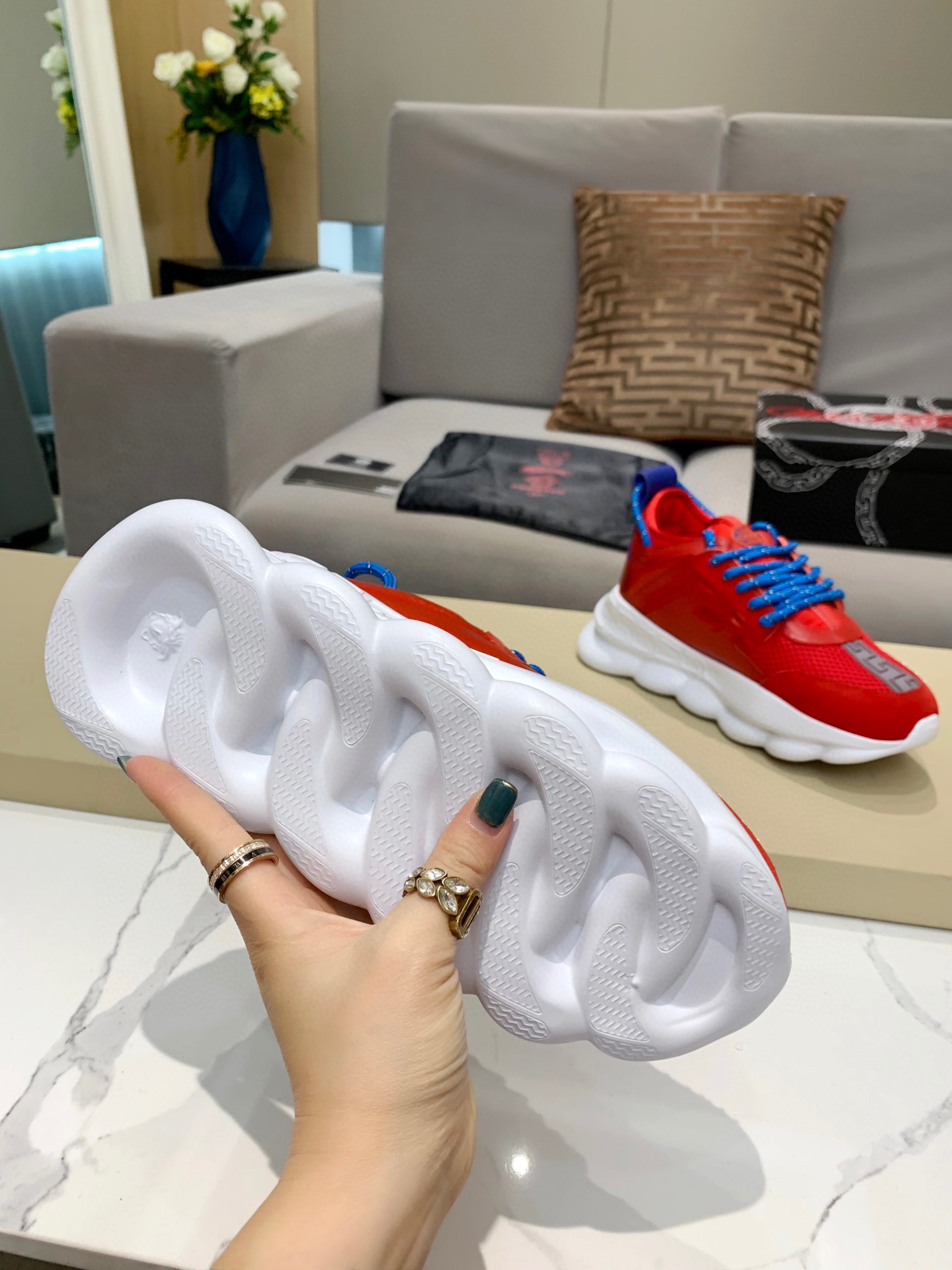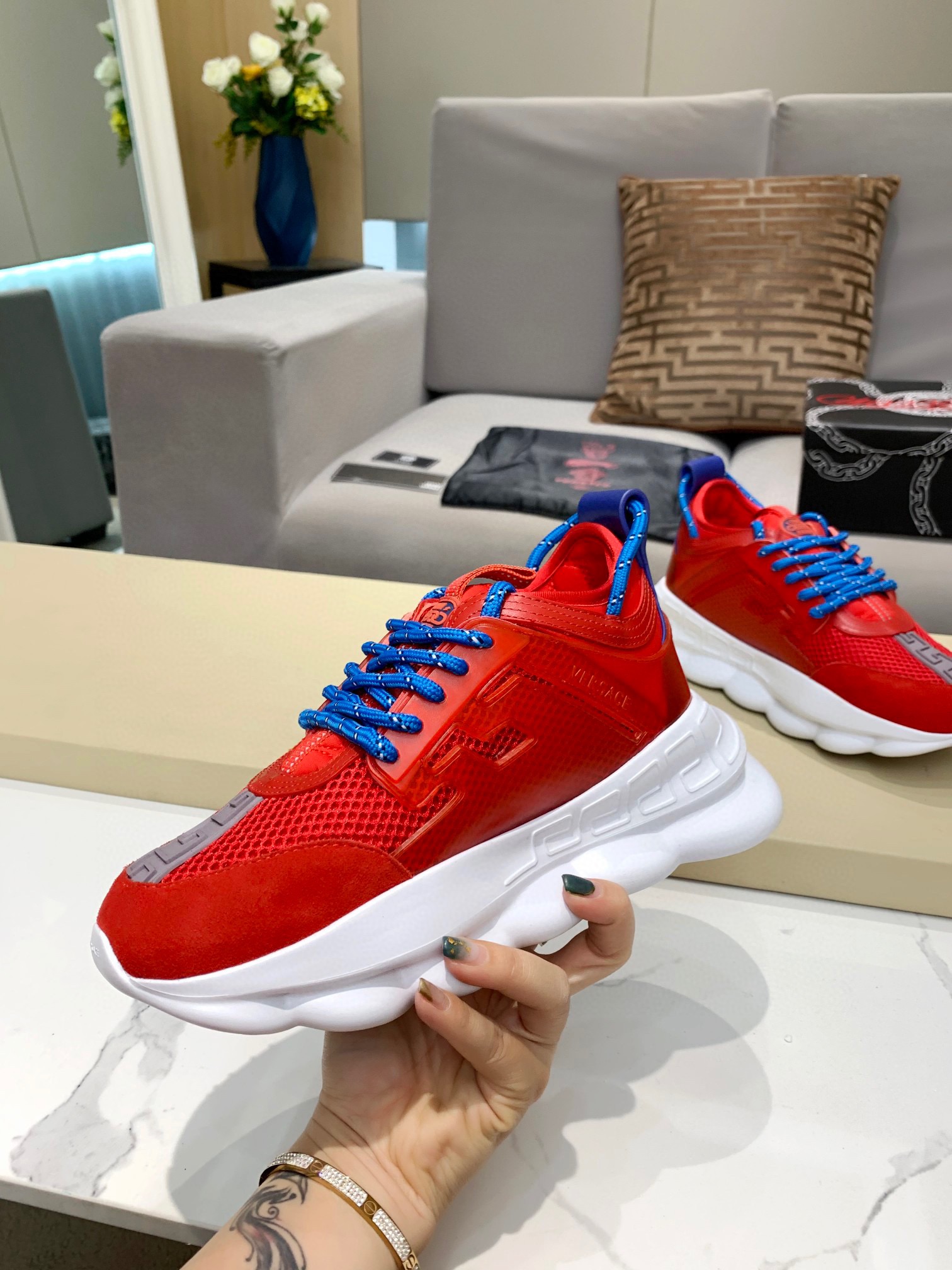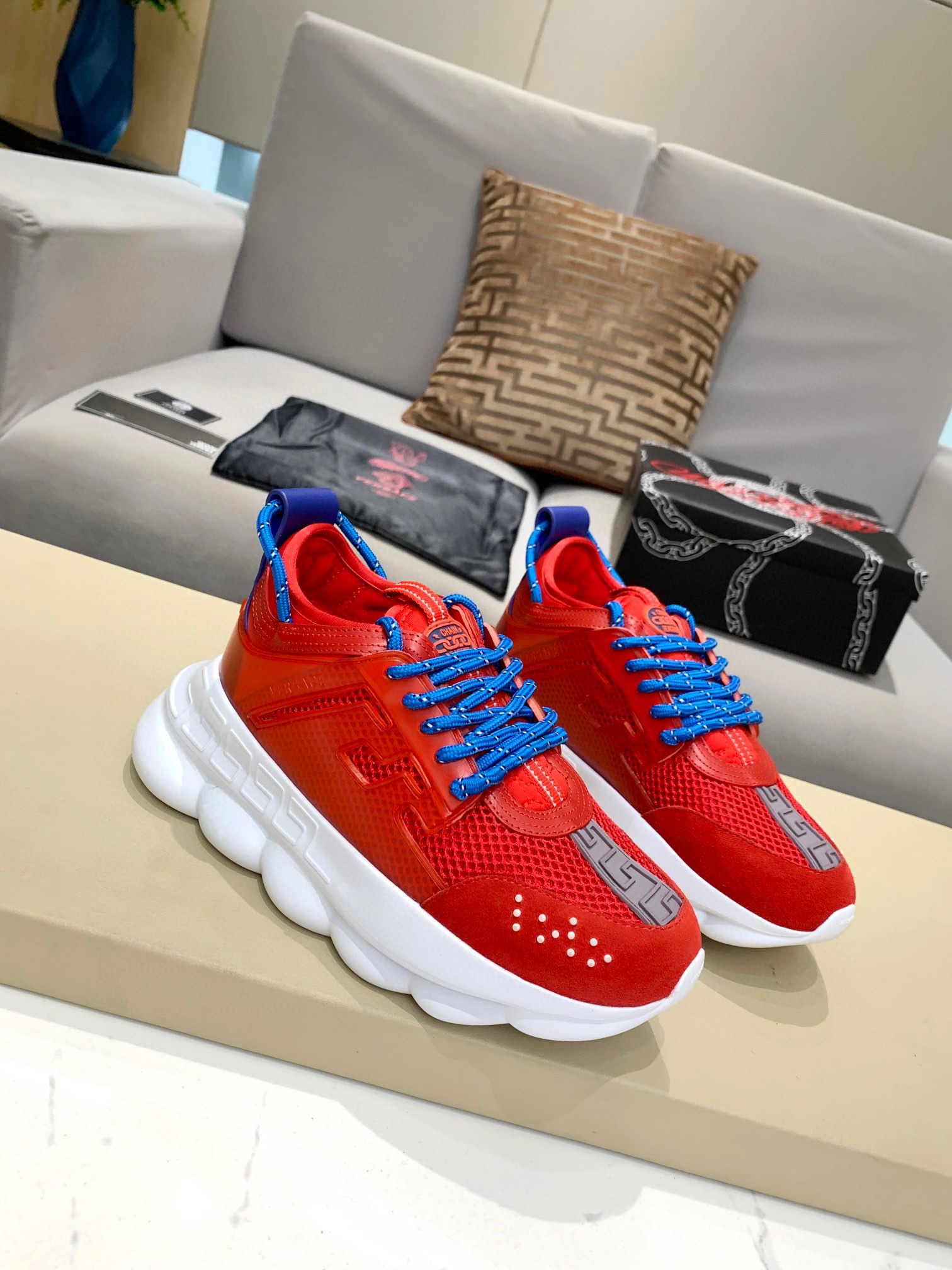 这款鞋子是AAAAA 1:1 质量 (非常棒). 使用了和原版一模一样的材料. 商标部分也保持了和范思哲/Versace一样. 图片拍摄是实物鞋子拍摄, 您所收到的实物保证和我们图片一模一样.