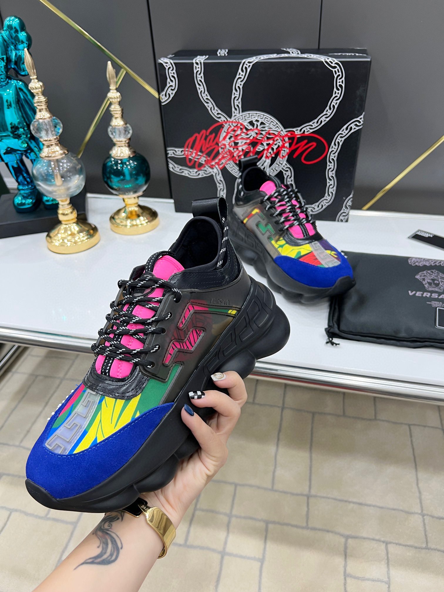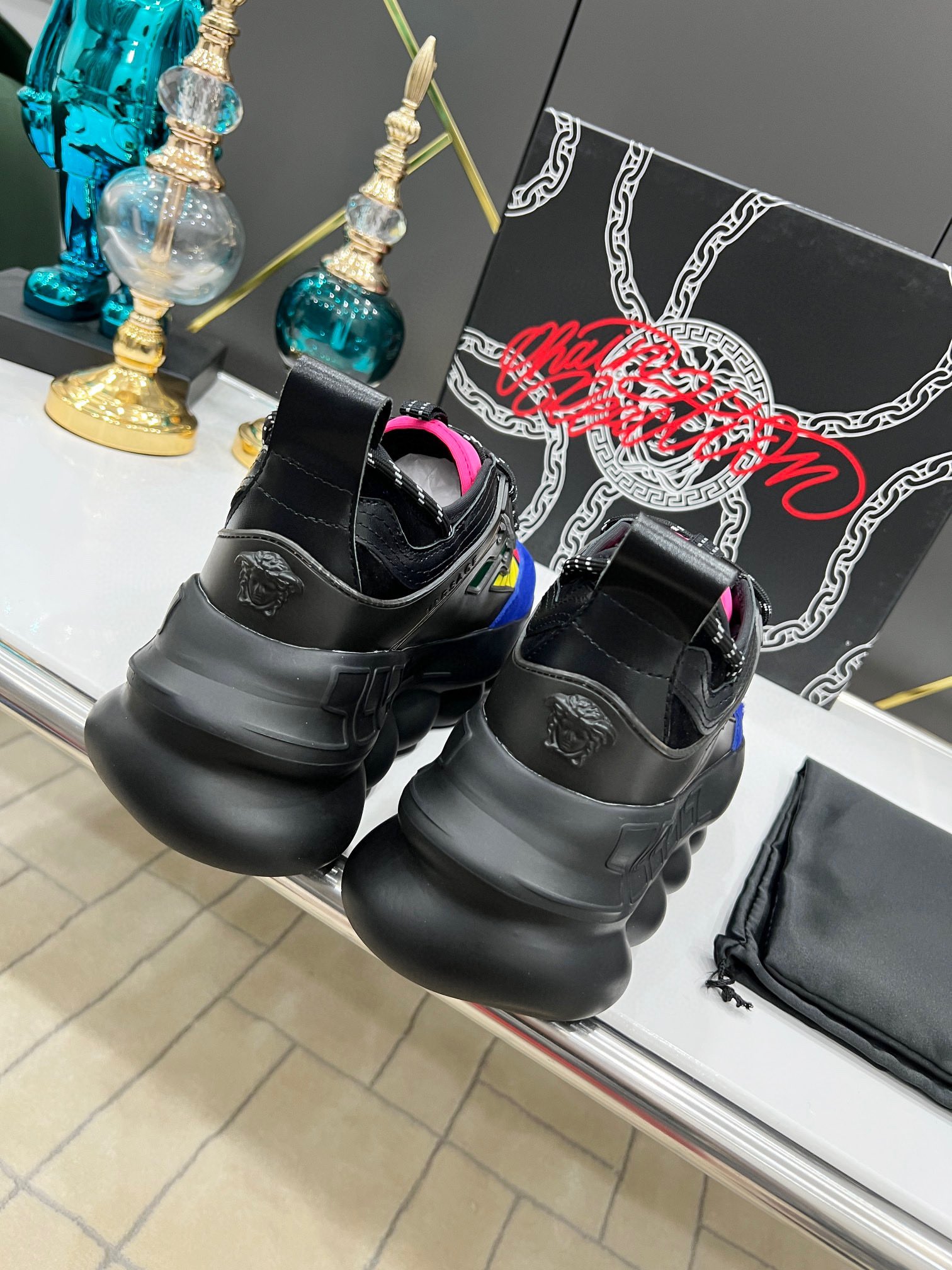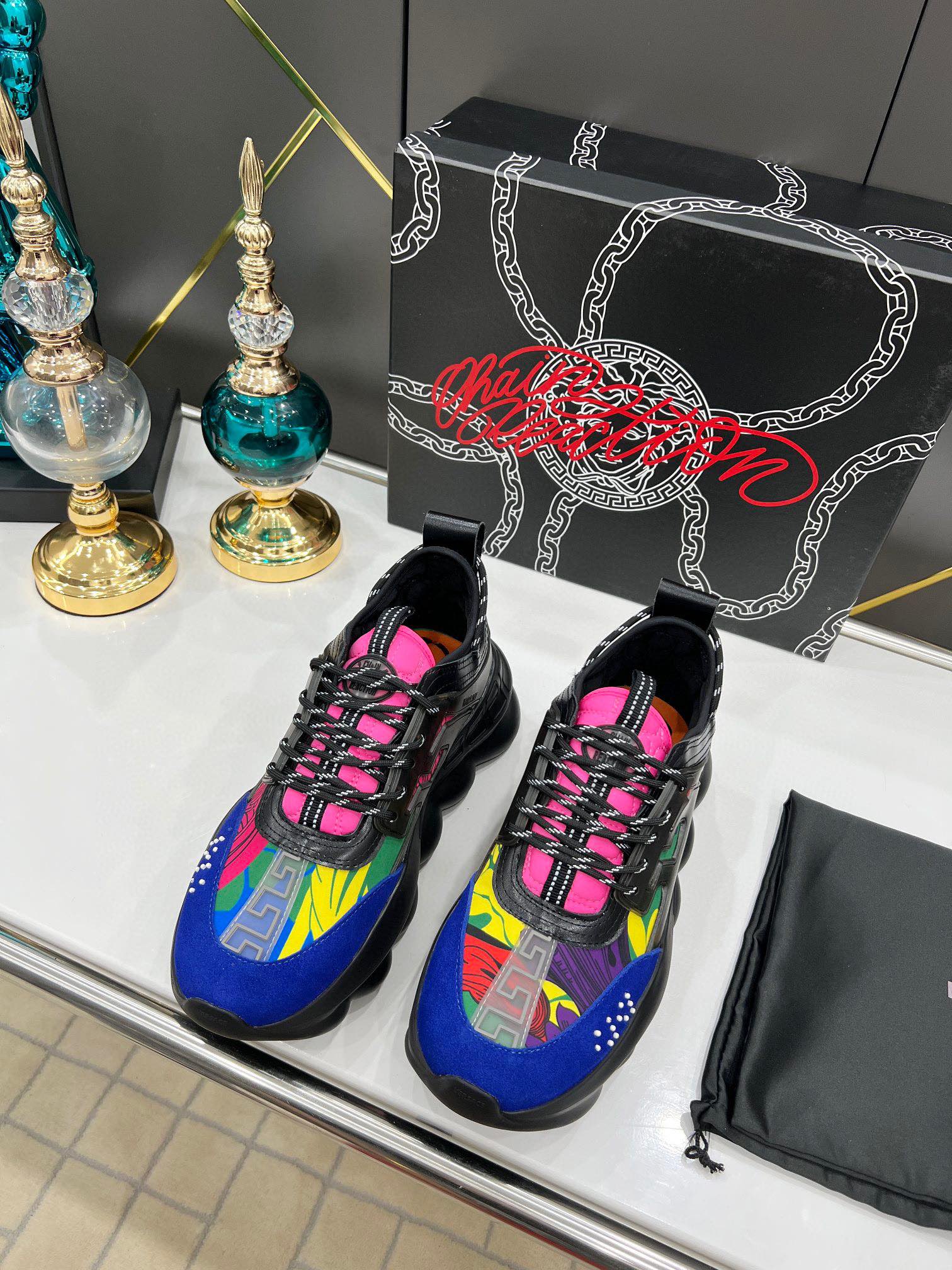 这款鞋子是AAAAA 1:1 质量 (非常棒). 使用了和原版一模一样的材料. 商标部分也保持了和范思哲/Versace一样. 图片拍摄是实物鞋子拍摄, 您所收到的实物保证和我们图片一模一样.