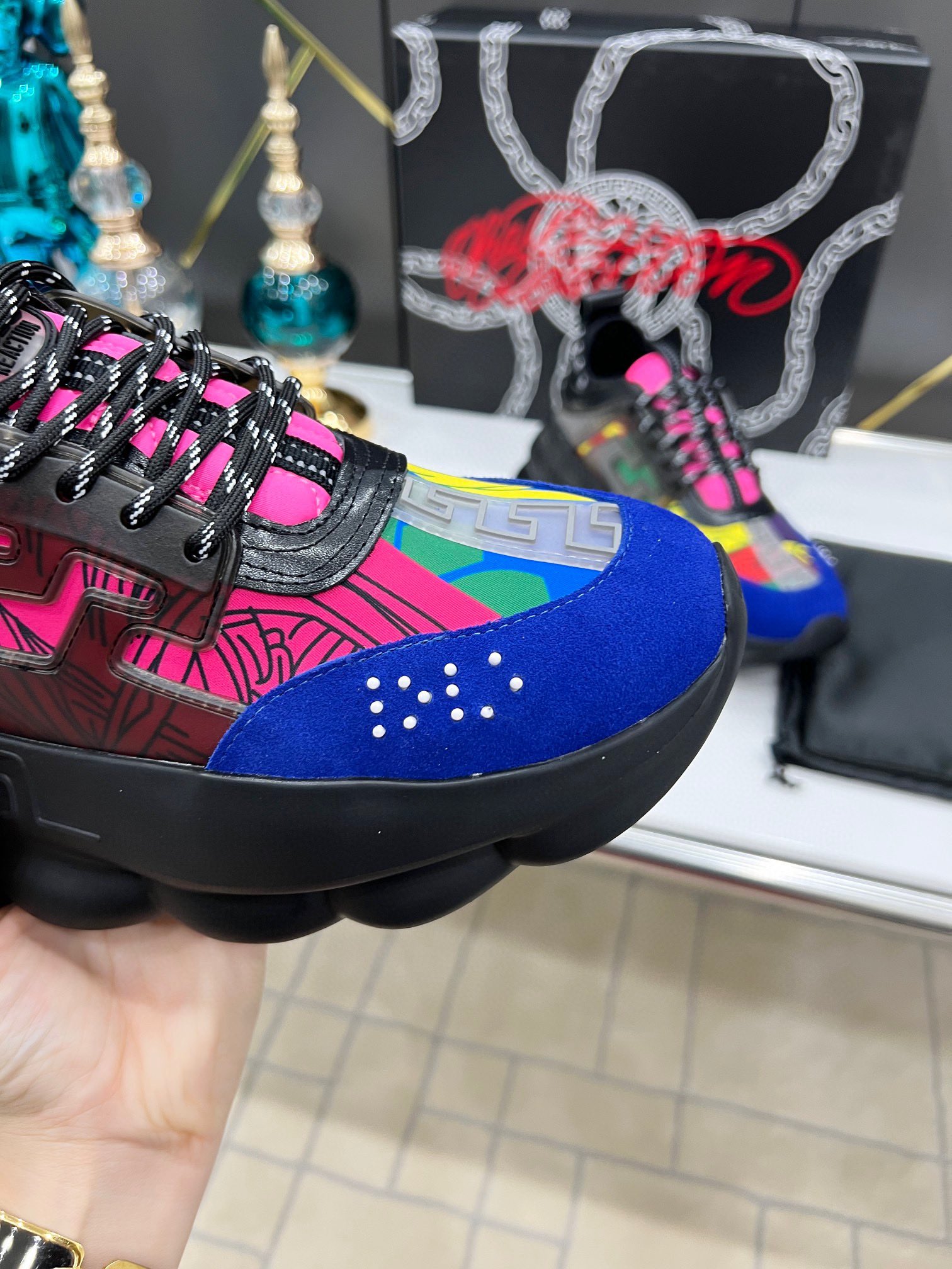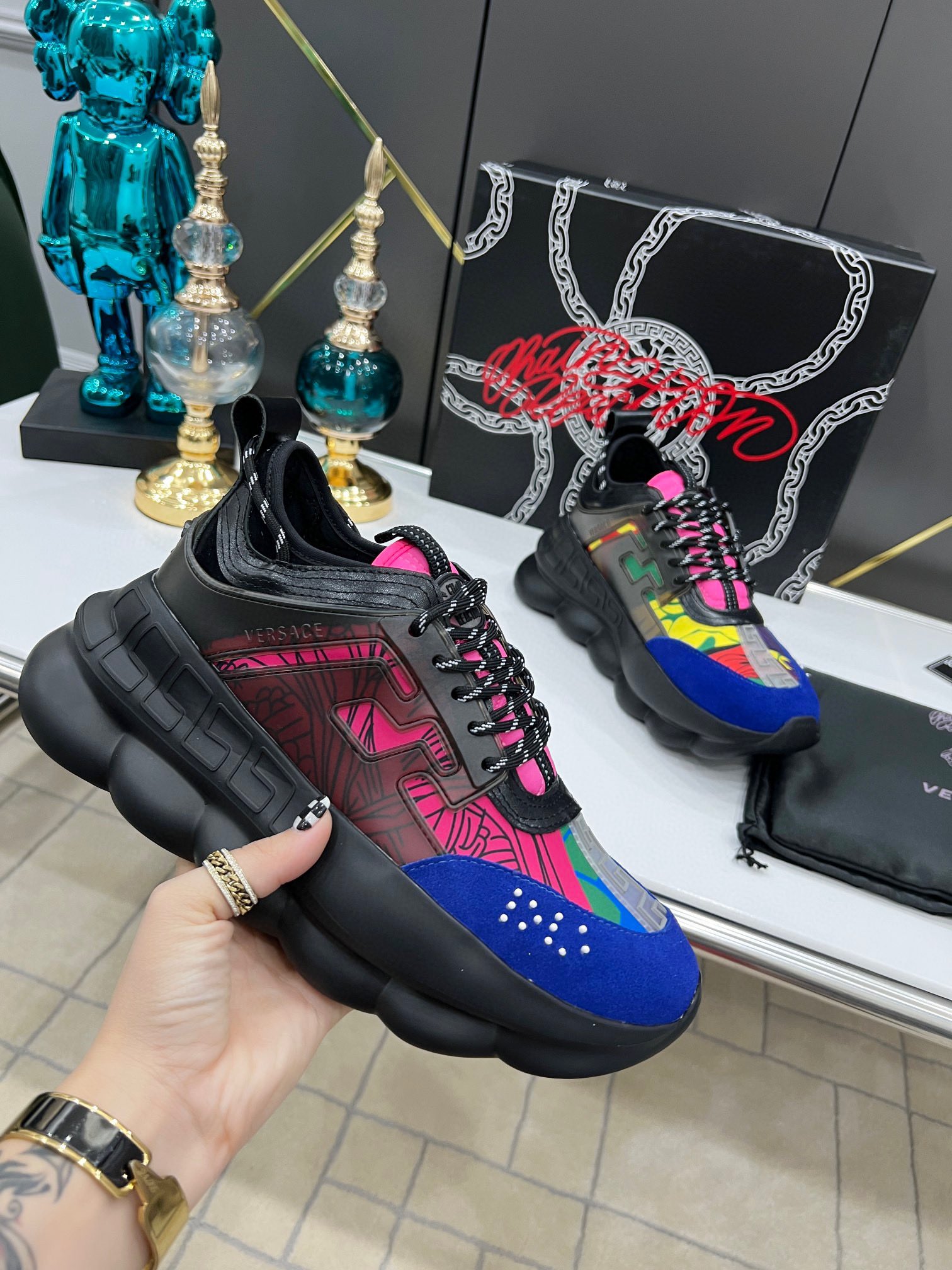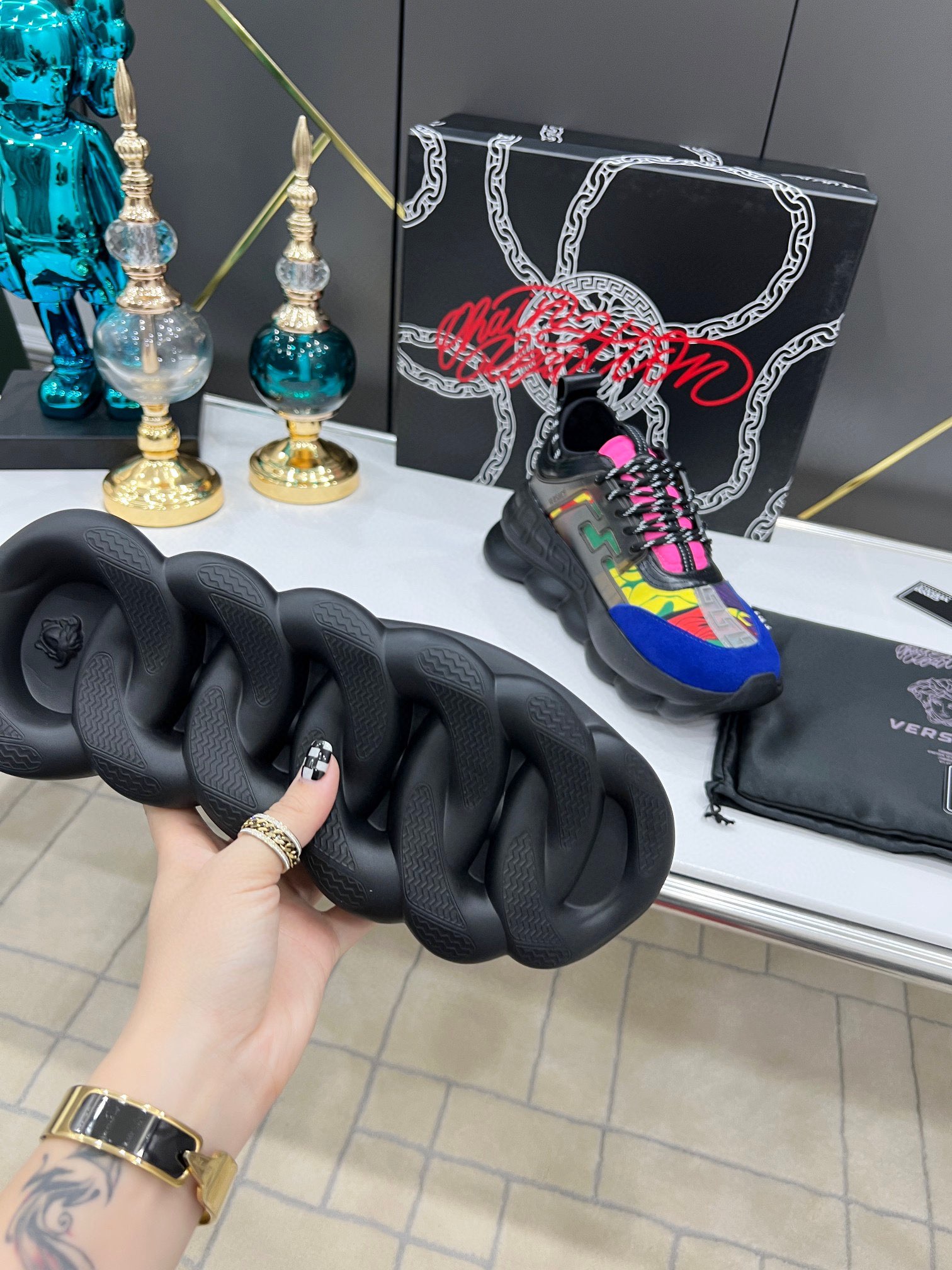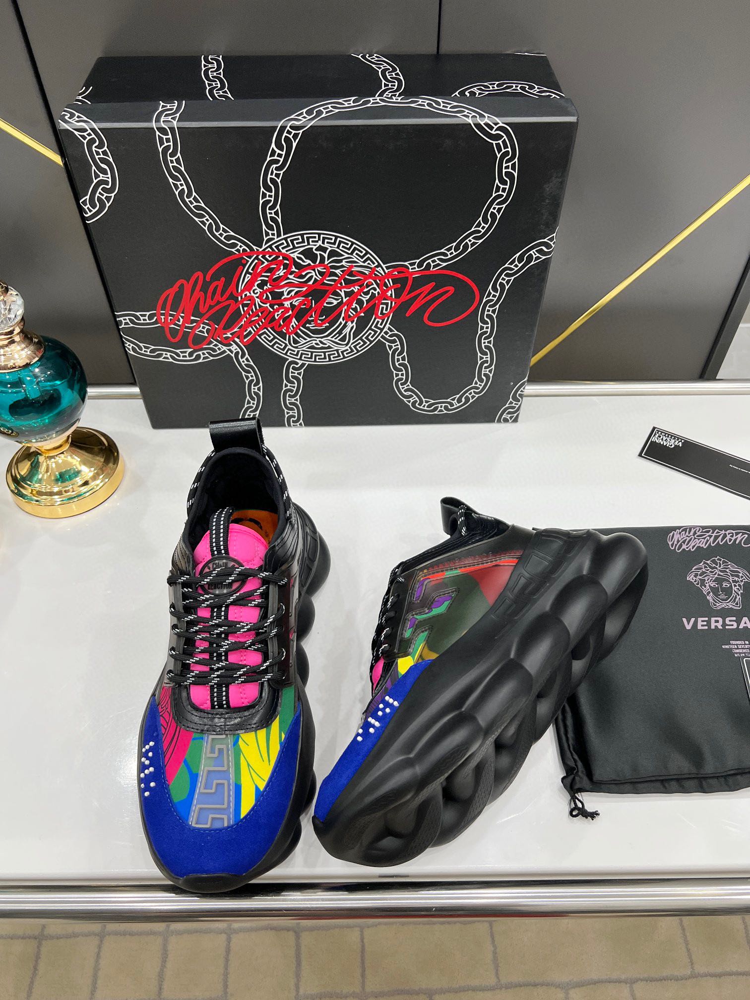 这款鞋子是AAAAA 1:1 质量 (非常棒). 使用了和原版一模一样的材料. 商标部分也保持了和范思哲/Versace一样. 图片拍摄是实物鞋子拍摄, 您所收到的实物保证和我们图片一模一样.